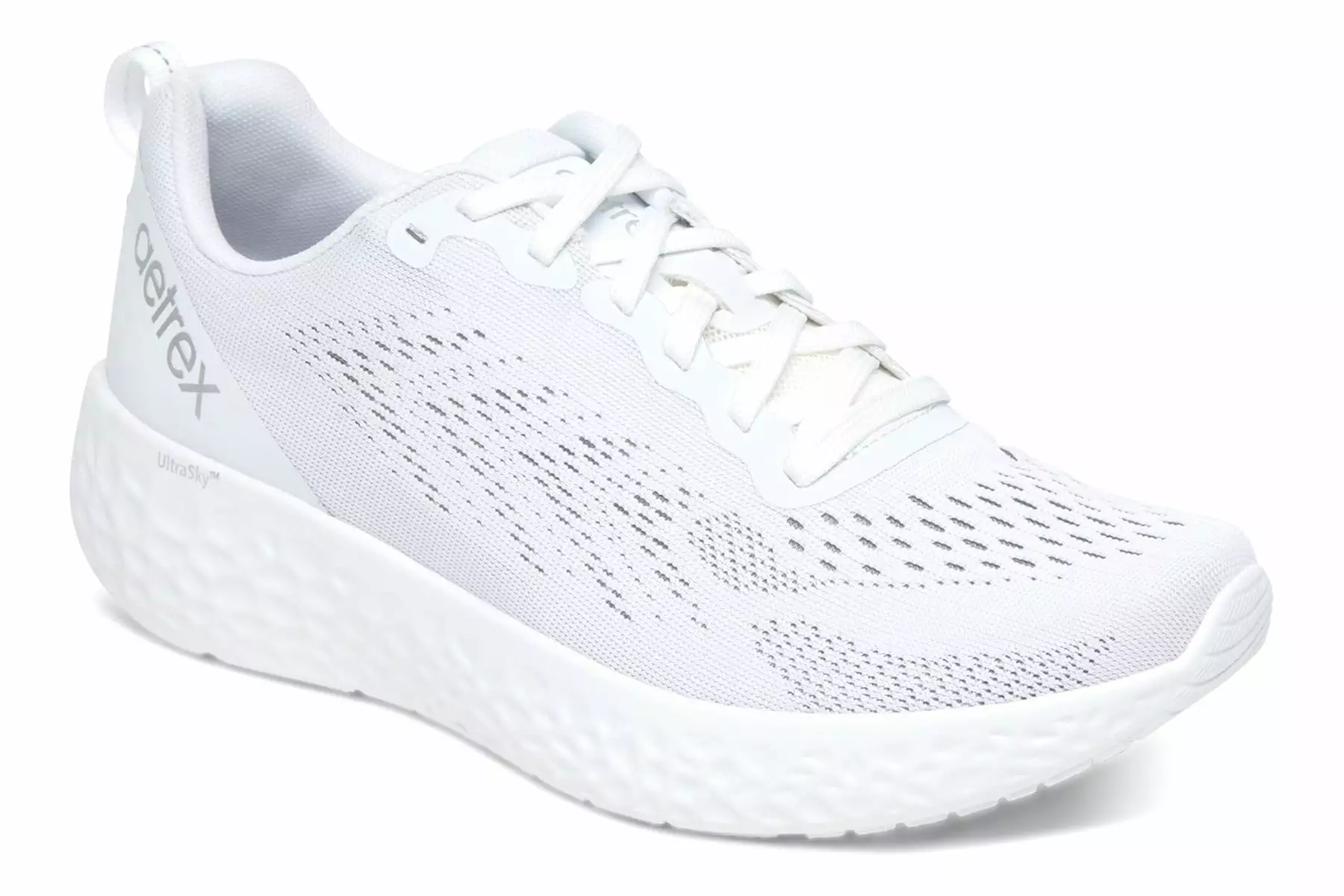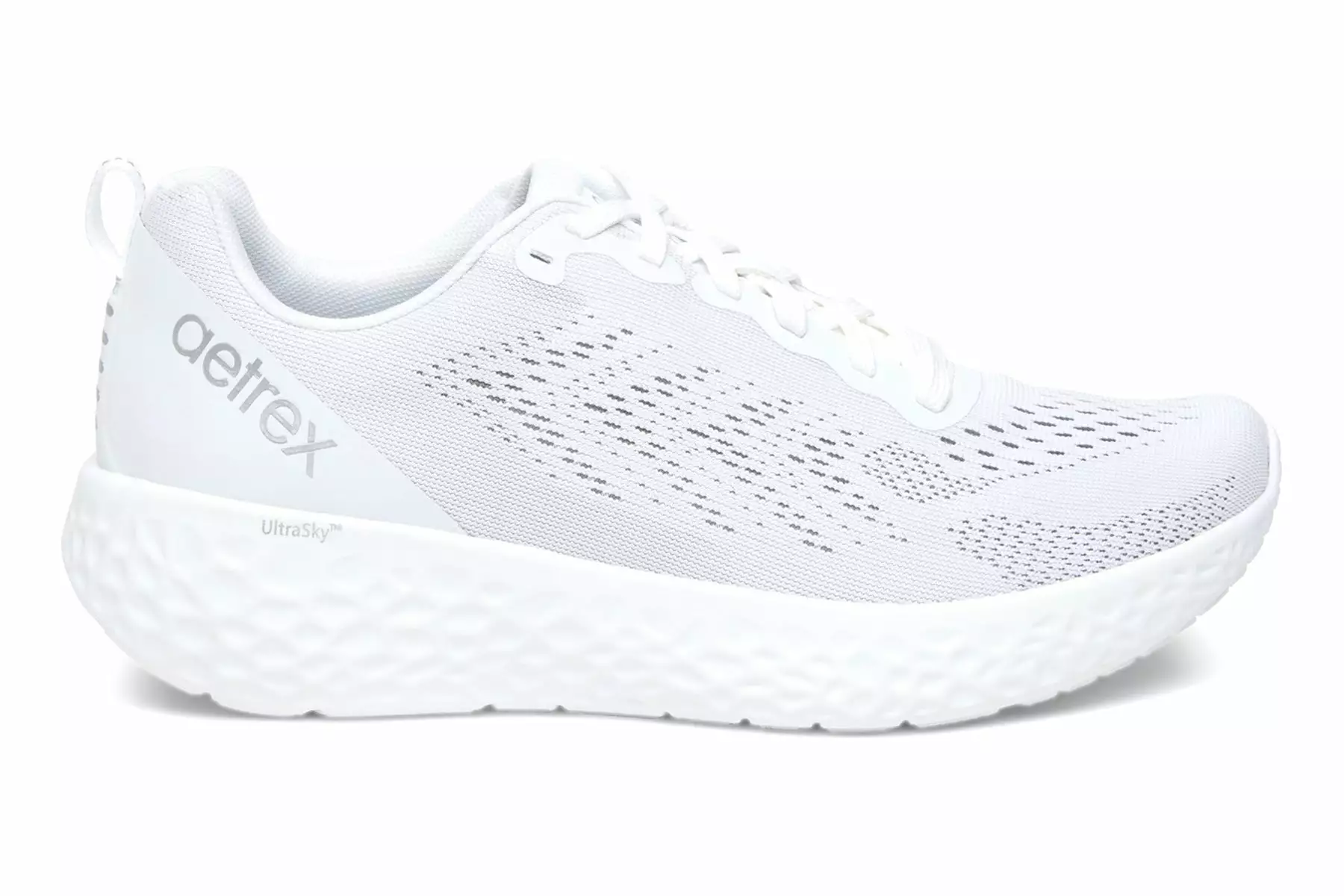 Aetrex Danika is a mesh sneaker with great arch support, thick UltraSky cushioning and adjustable laces. A padded collar and tongue provides extra comfort. A removable insole adds support, while rubber pods on the outsole offer traction and durability.