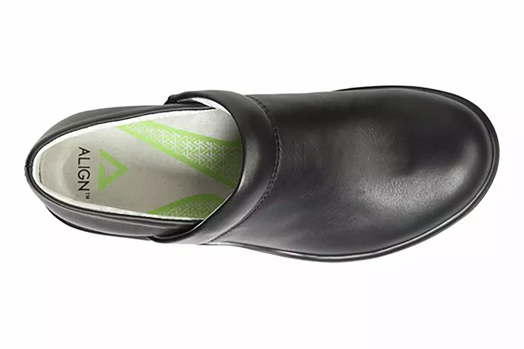 Align Indya is a comfortable and trendy clog. Features include leather or PU uppers, orthotic insole, padded heel collar and slip-resistant outsole. Linings made with recycled materials and slip-on construction will put these clogs on your list of favorite shoes.