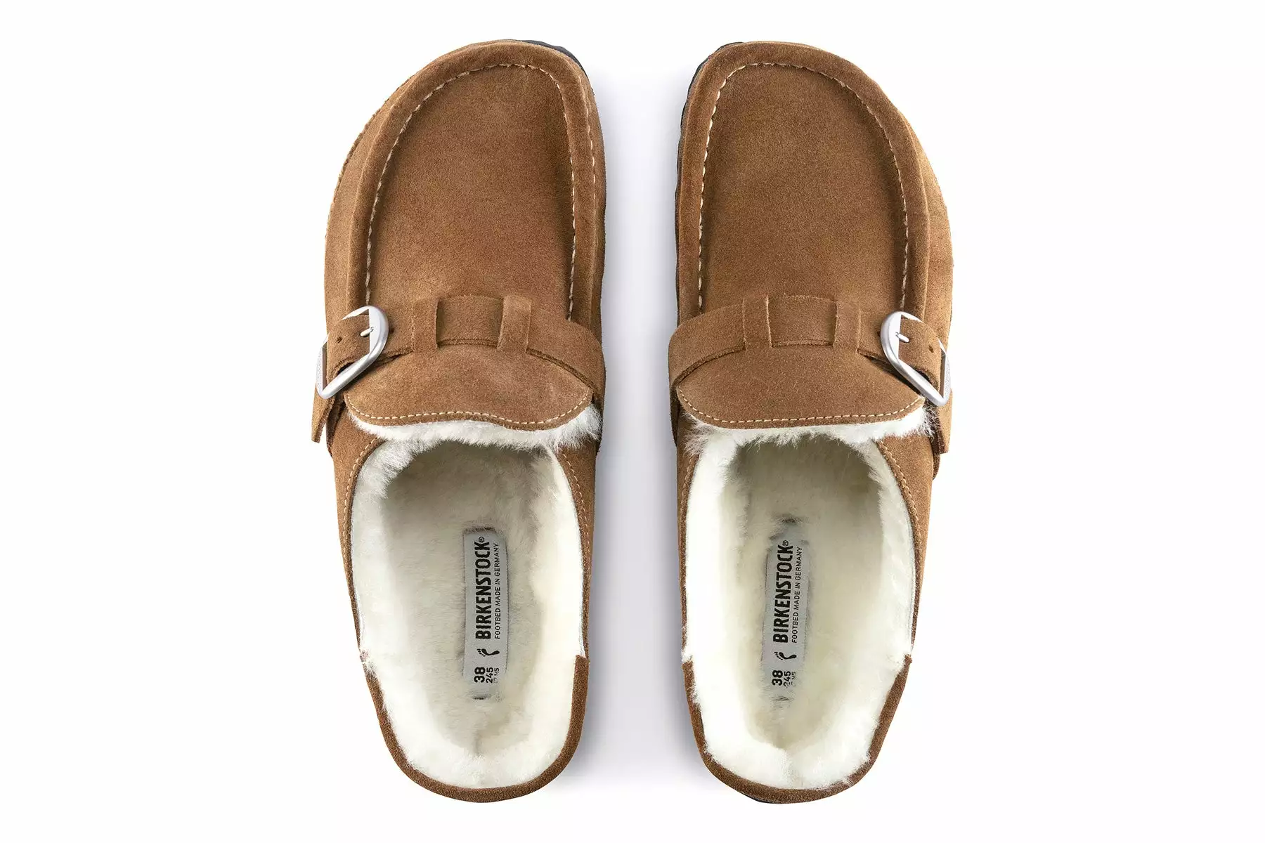 The BIRKENSTOCK Buckley is a semi-open moccasin-style clog that’s instantly recognizable as an authentic BIRKENSTOCK original thanks to its exposed cork footbed. Here, the classic model comes in a particularly cozy version with genuine shearling and a statement buckle. The perfect shoe for chilly evenings! The upper is made from soft suede leather.