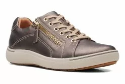 Stay light on your feet with the Nalle Lace. Supple bronze metallic leather uppers bring sports-inspired style to Clarks’ iconic craftsmanship, resulting in a contemporary sneaker that’s ideal for modern life. Our supportive Contour Cushion footbed combines with a high-grip rubber sole for underfoot comfort on those busy days.