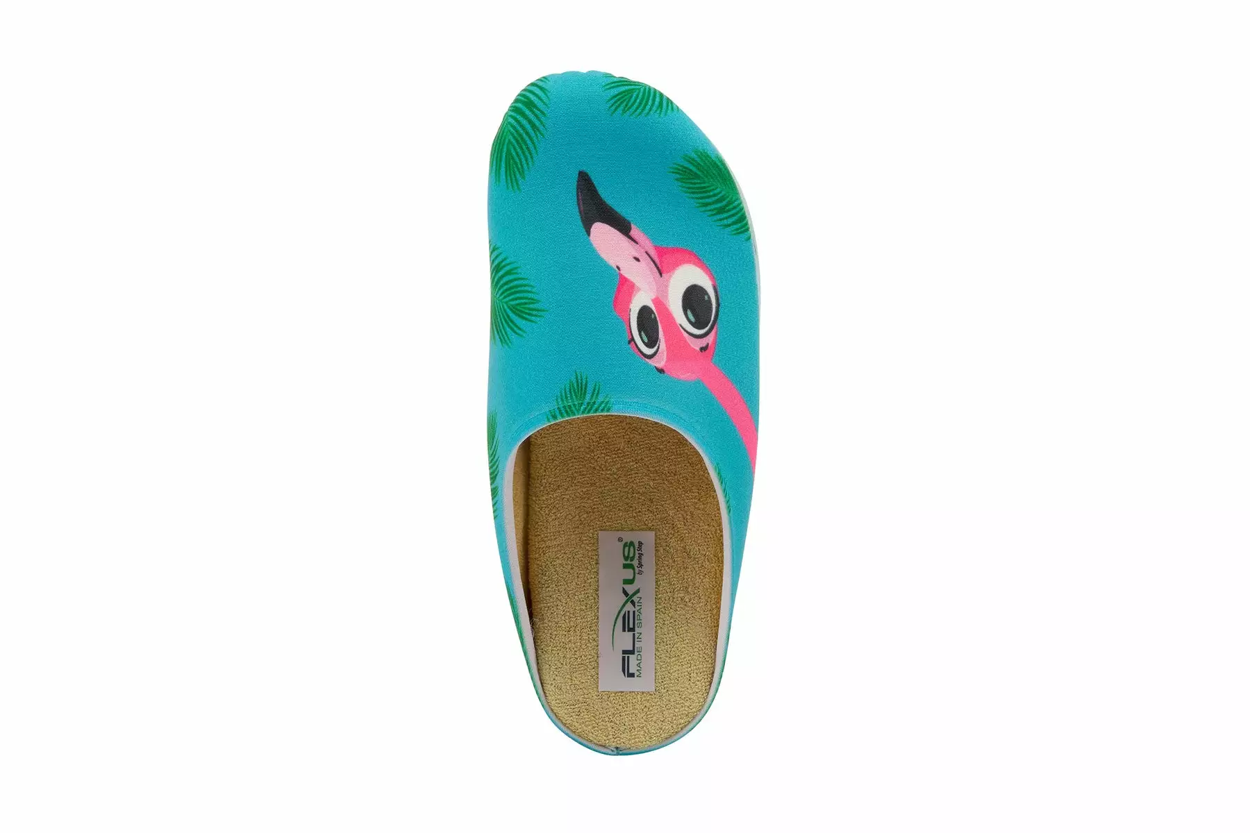Whimsical and easy slip-on indoor/outdoor slipper featuring a vibrant print design on a contoured sole with the natural arch and indentation of a real foot and toes.