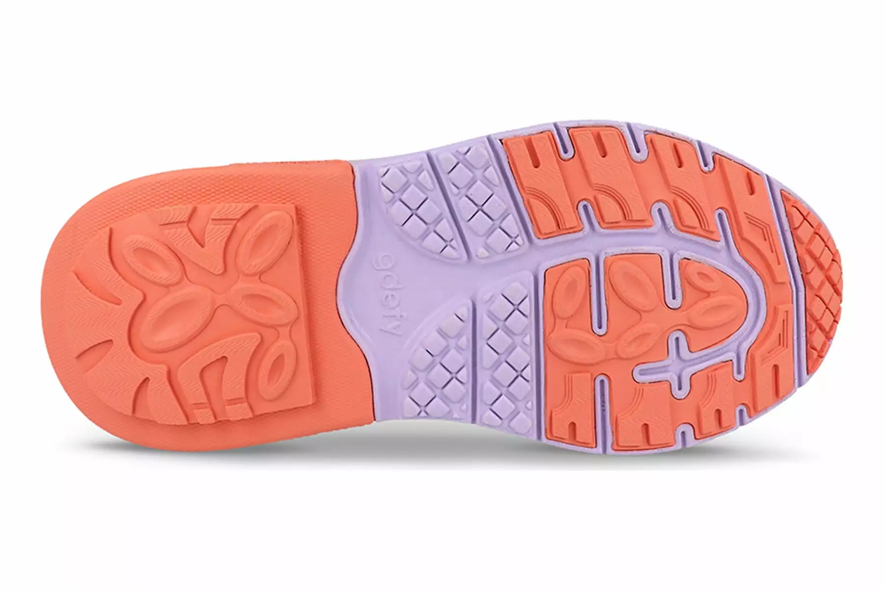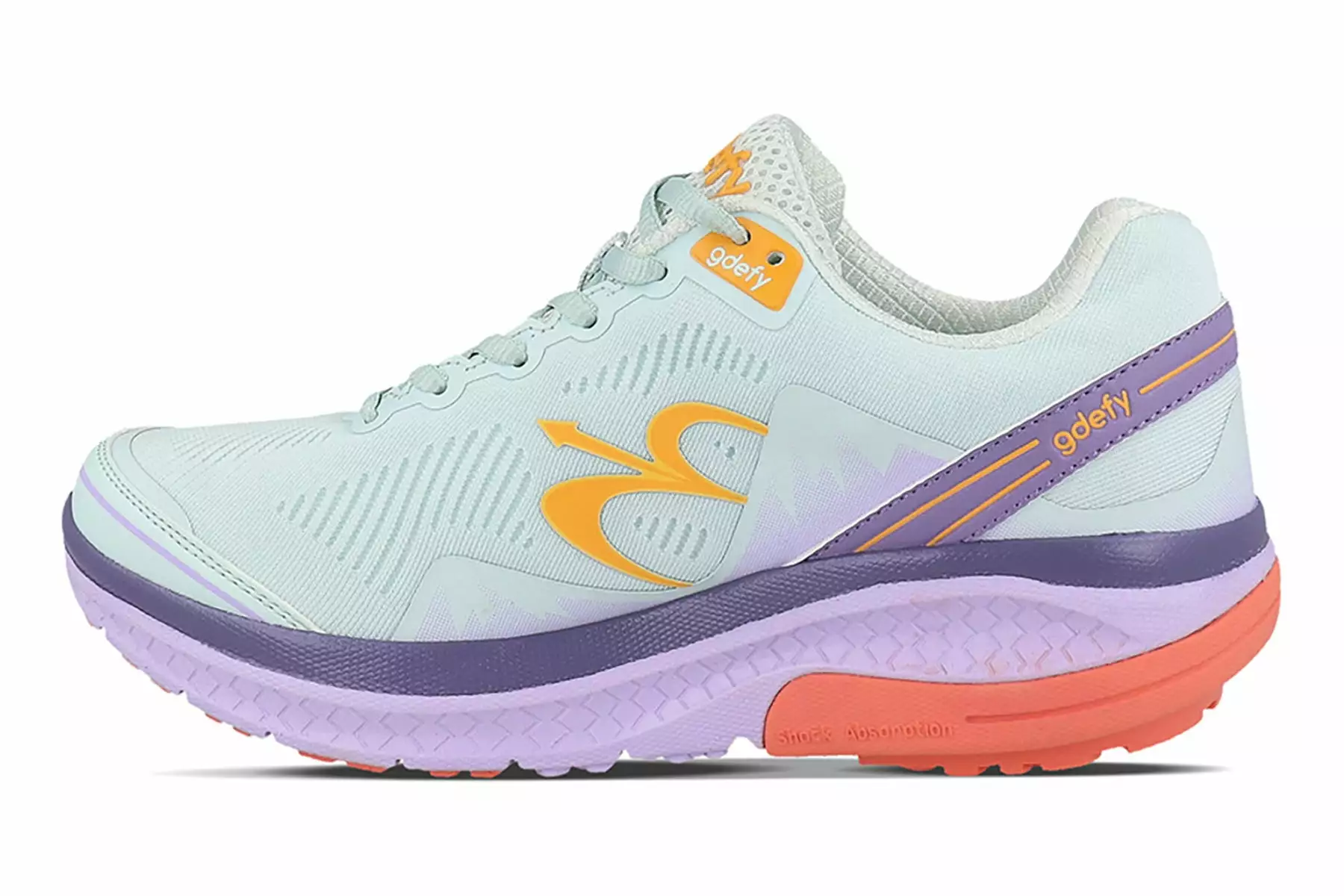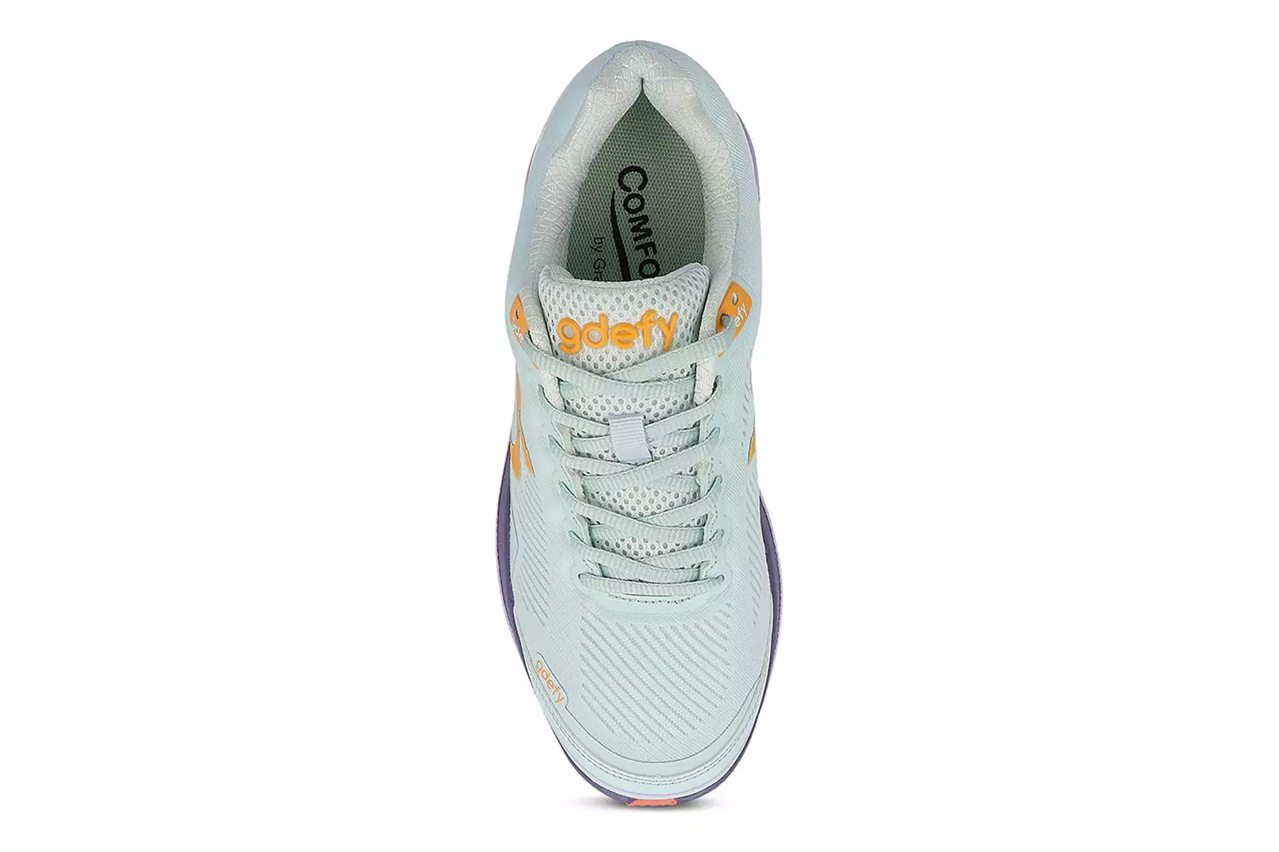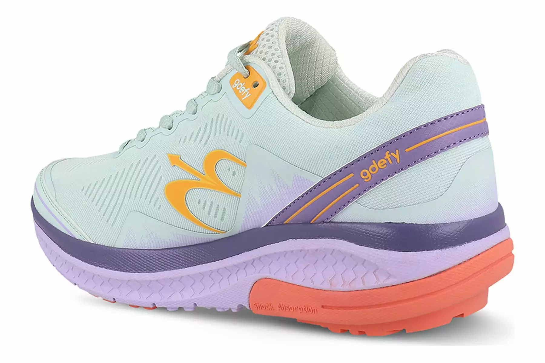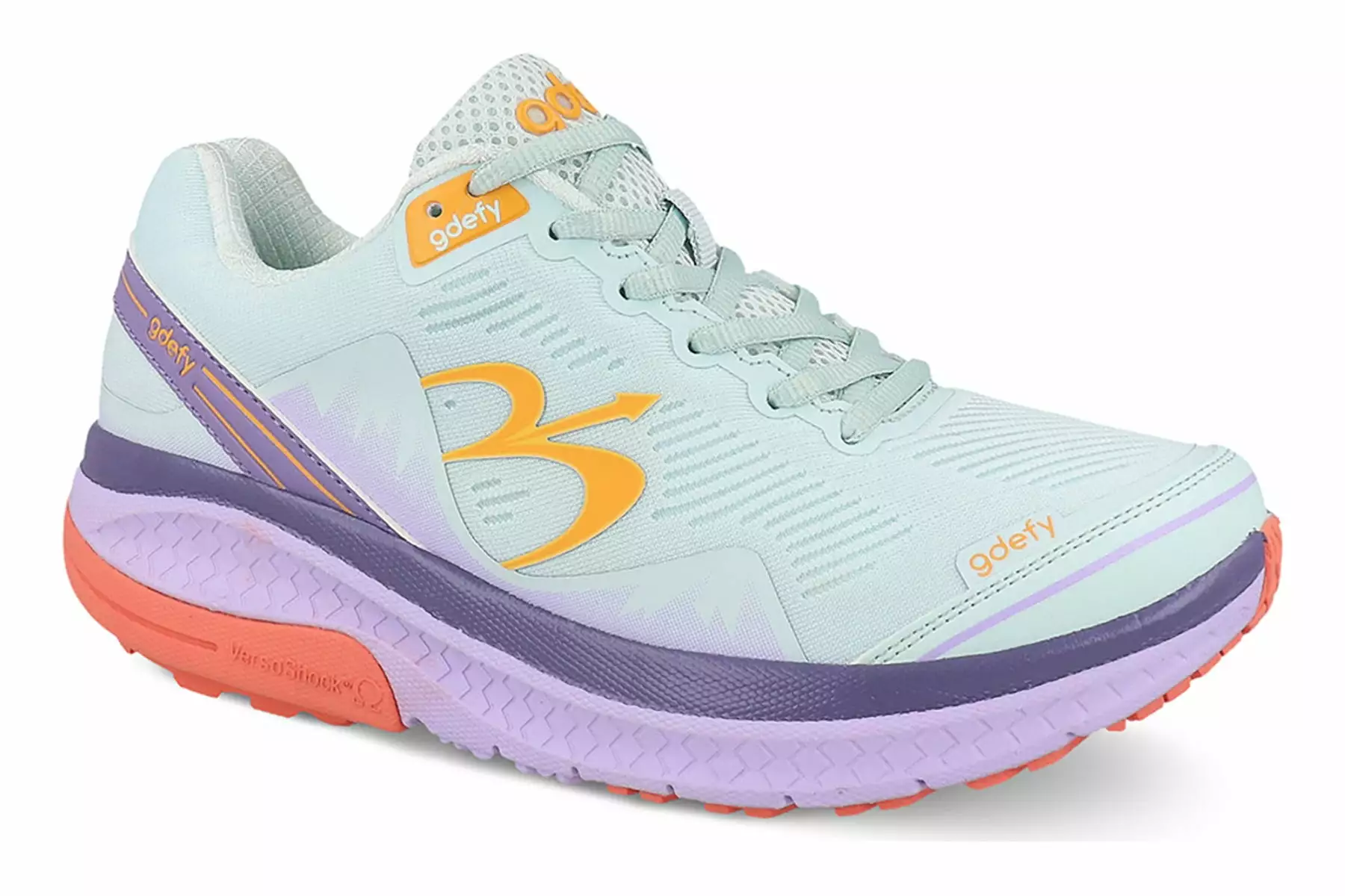 GDEFY Mighty Walk is an active sneaker designed for comfort and stability. VersoShock technology reduces knee pain and a roomy toe box helps blood circulation. A front rolling design relieves foot stress and a durable mesh upper provides breathability, flexibility and ventilation.