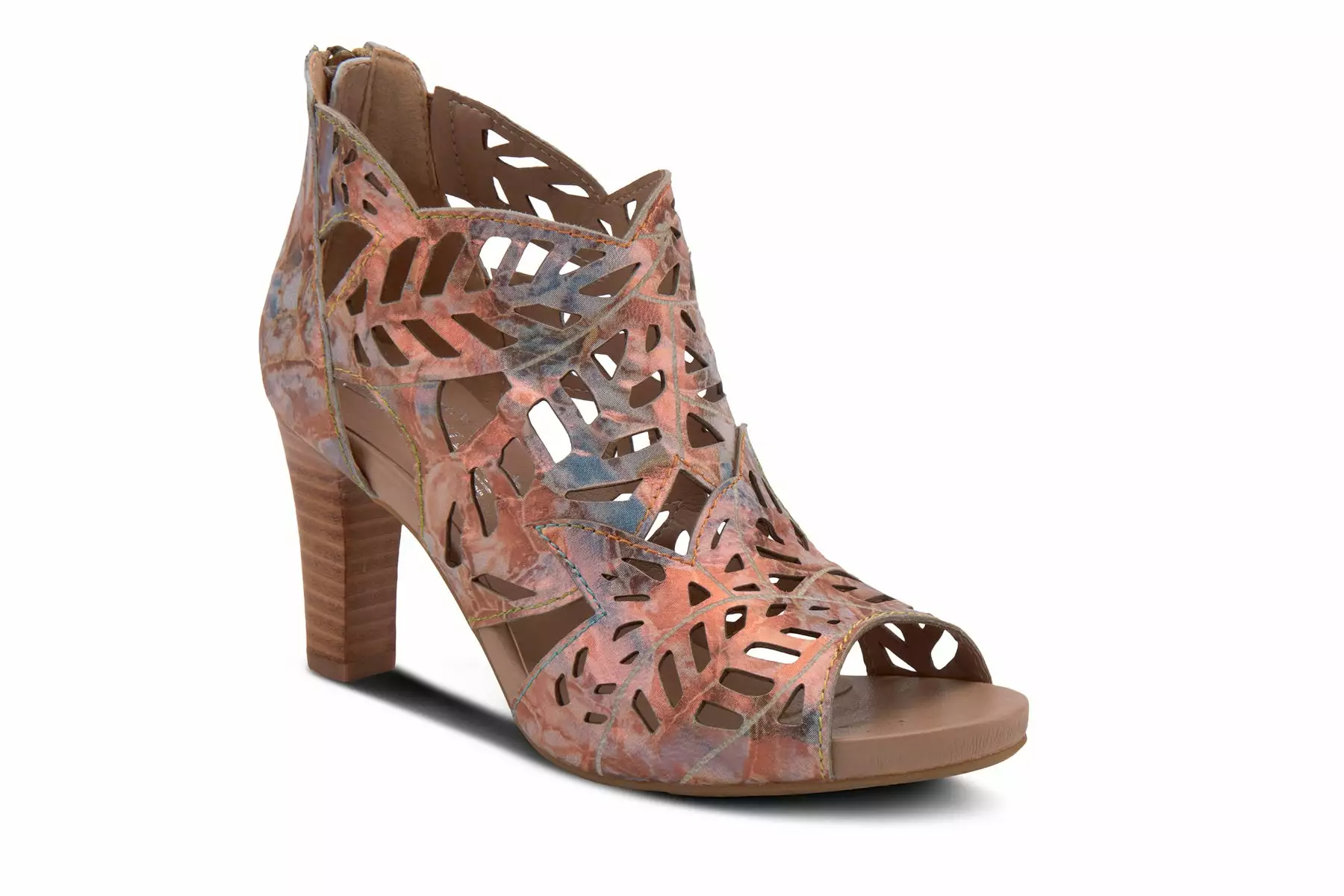 French inspired design, hand-painted leather peep toe laser-cut bootie. Heel Height (approximately): 3 1/4″ stacked, 1/2″ platform.