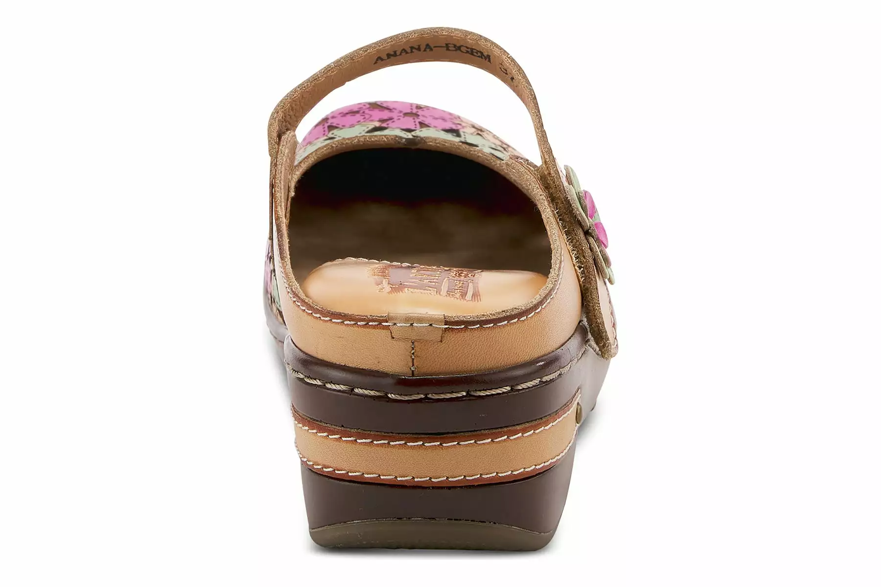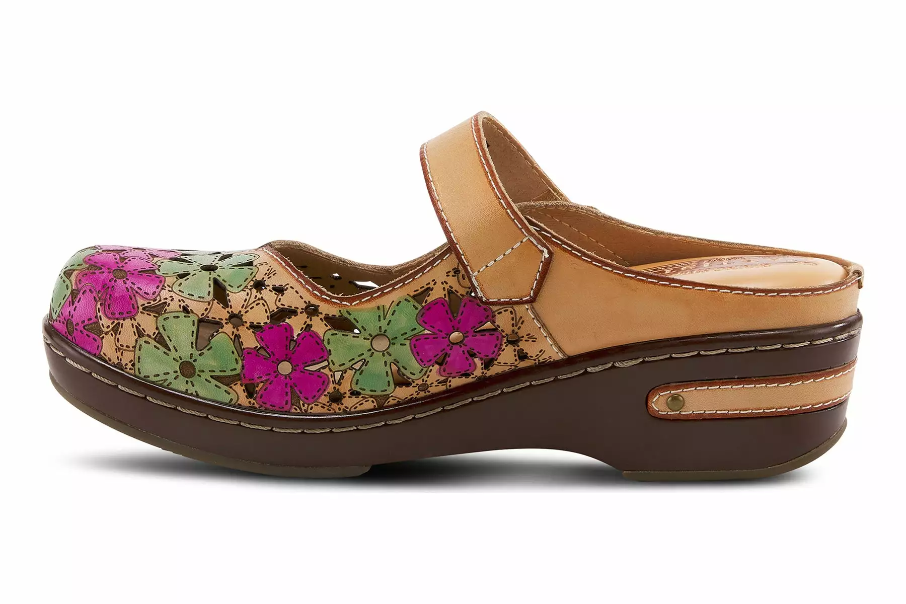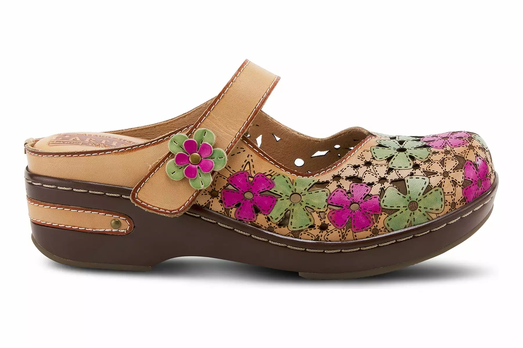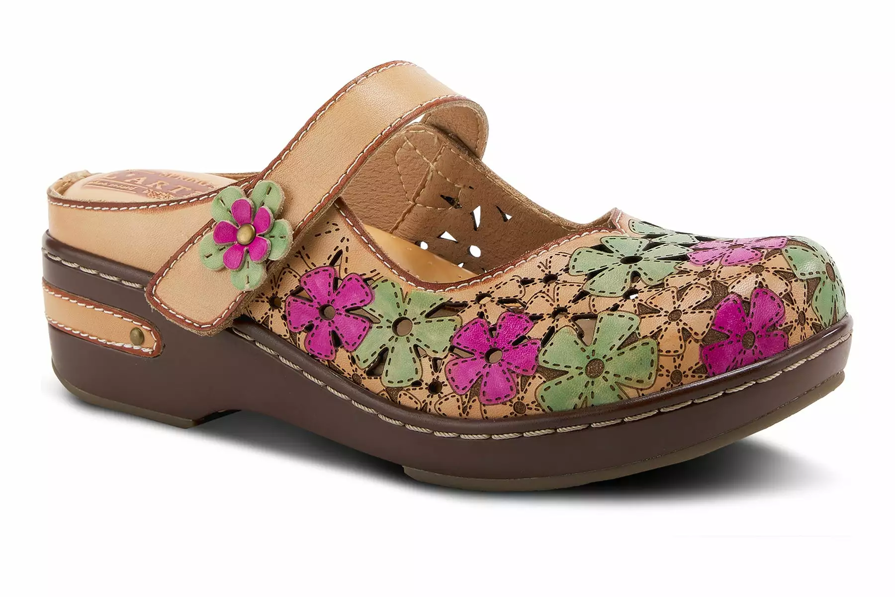 Stylish French-inspired open-back leather clog with an adjustable strap featuring hand-painted, laser-cut, and etched floral design to bring beautiful style all on our signature comfort sole.