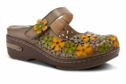 Stylish French-inspired open-back leather clog with an adjustable strap featuring hand-painted, laser-cut, and etched floral design to bring beautiful style all on our signature comfort sole.