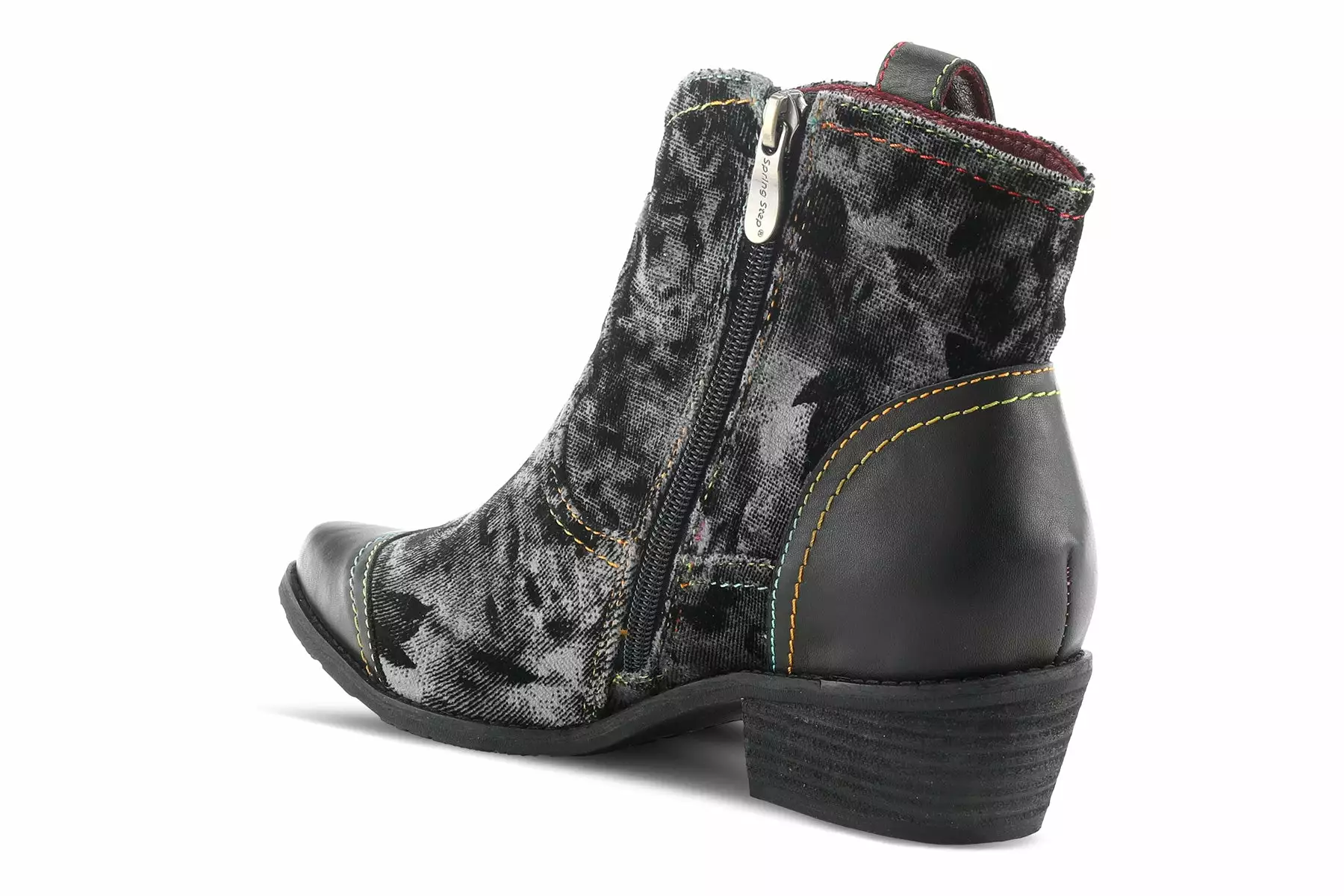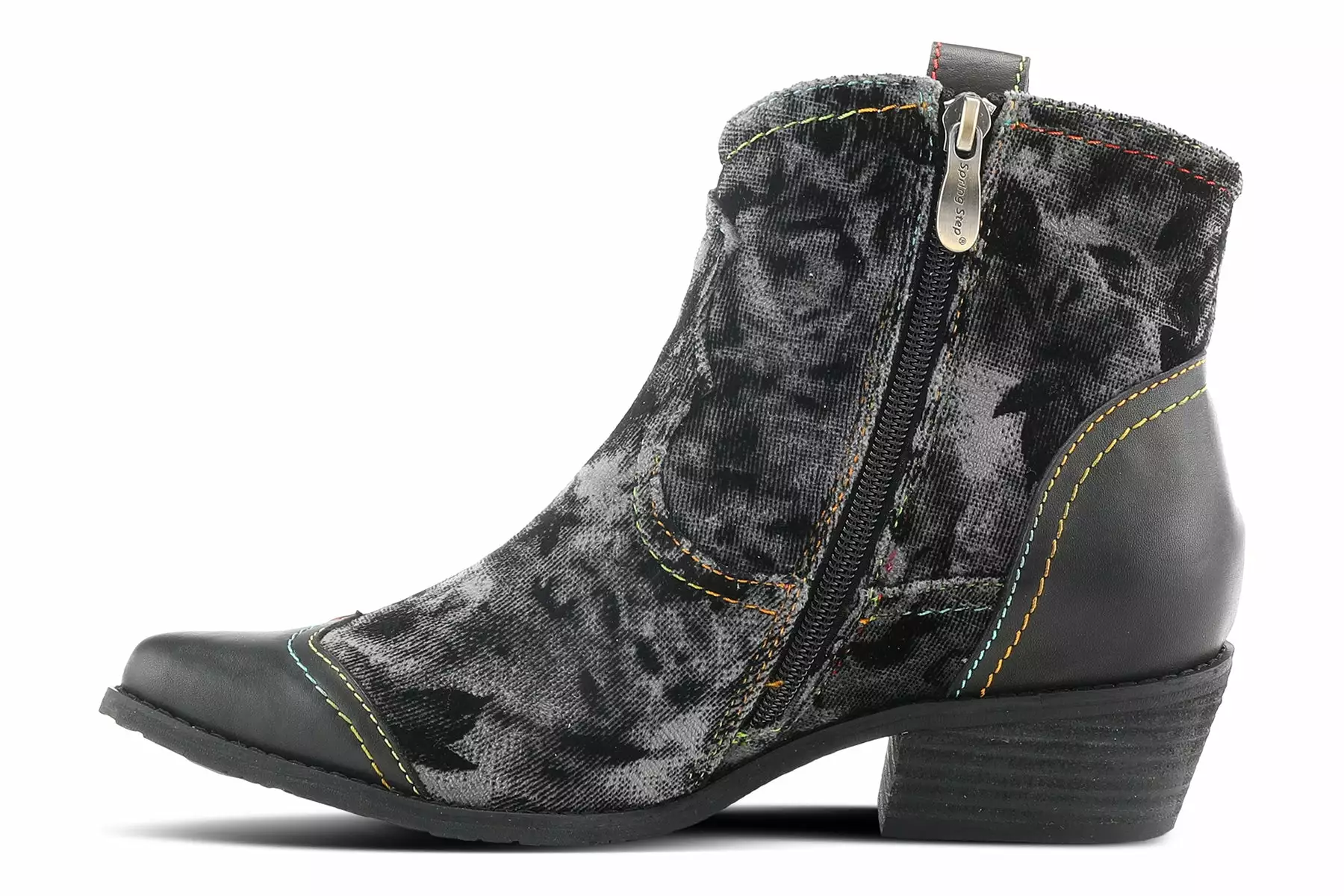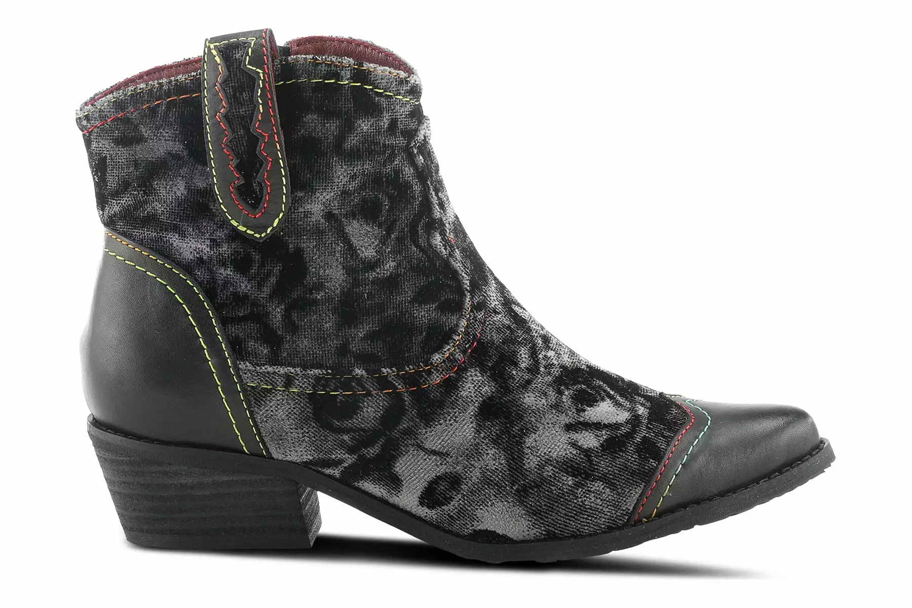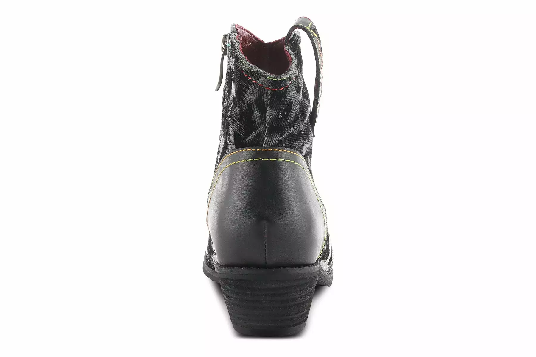L`Artiste Style: Countrypop -Western style bootie featuring genuine leather and textile upper with outside pull tab and inside zipper for easy on a off and rainbow stitching on a stacked, block heel.
