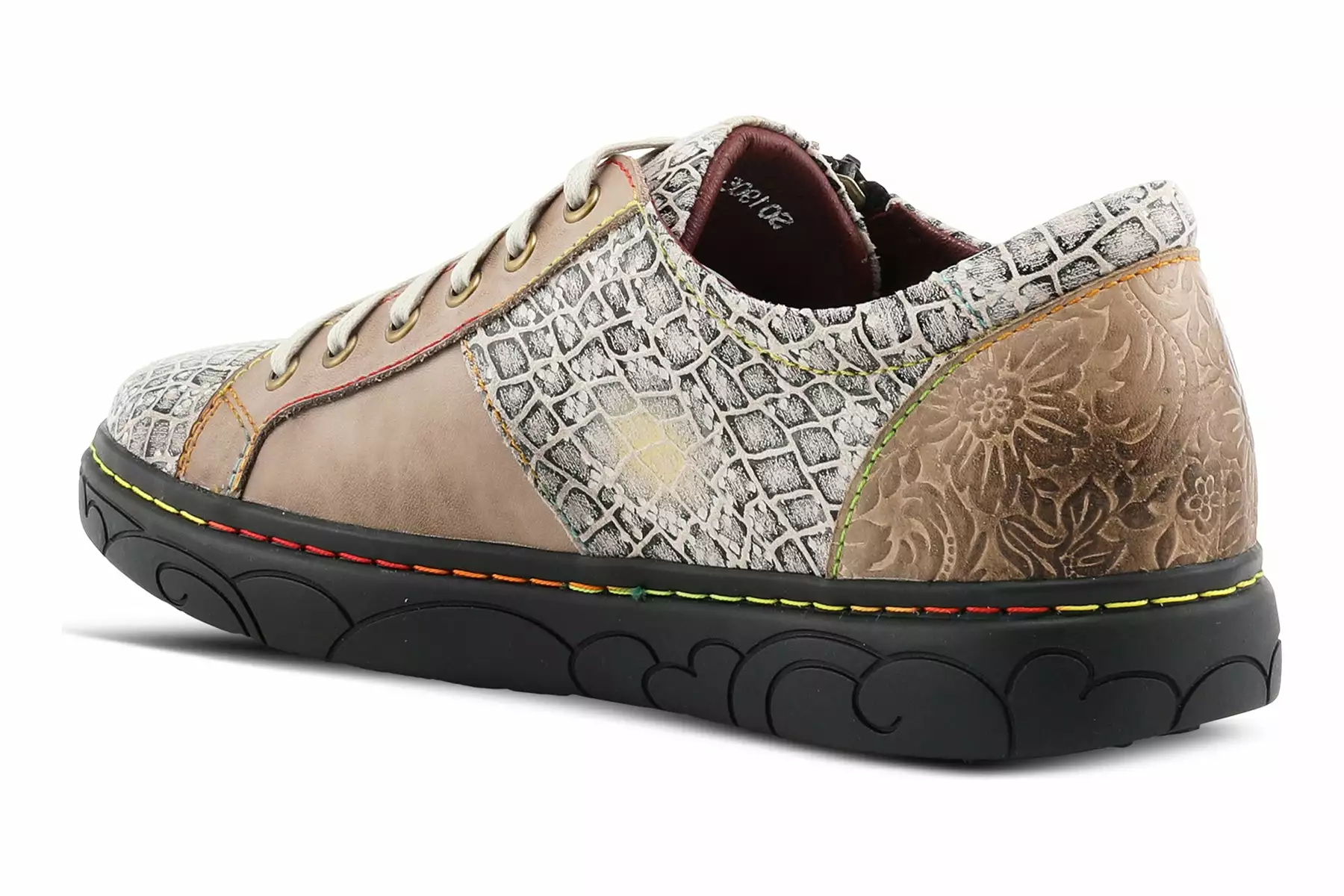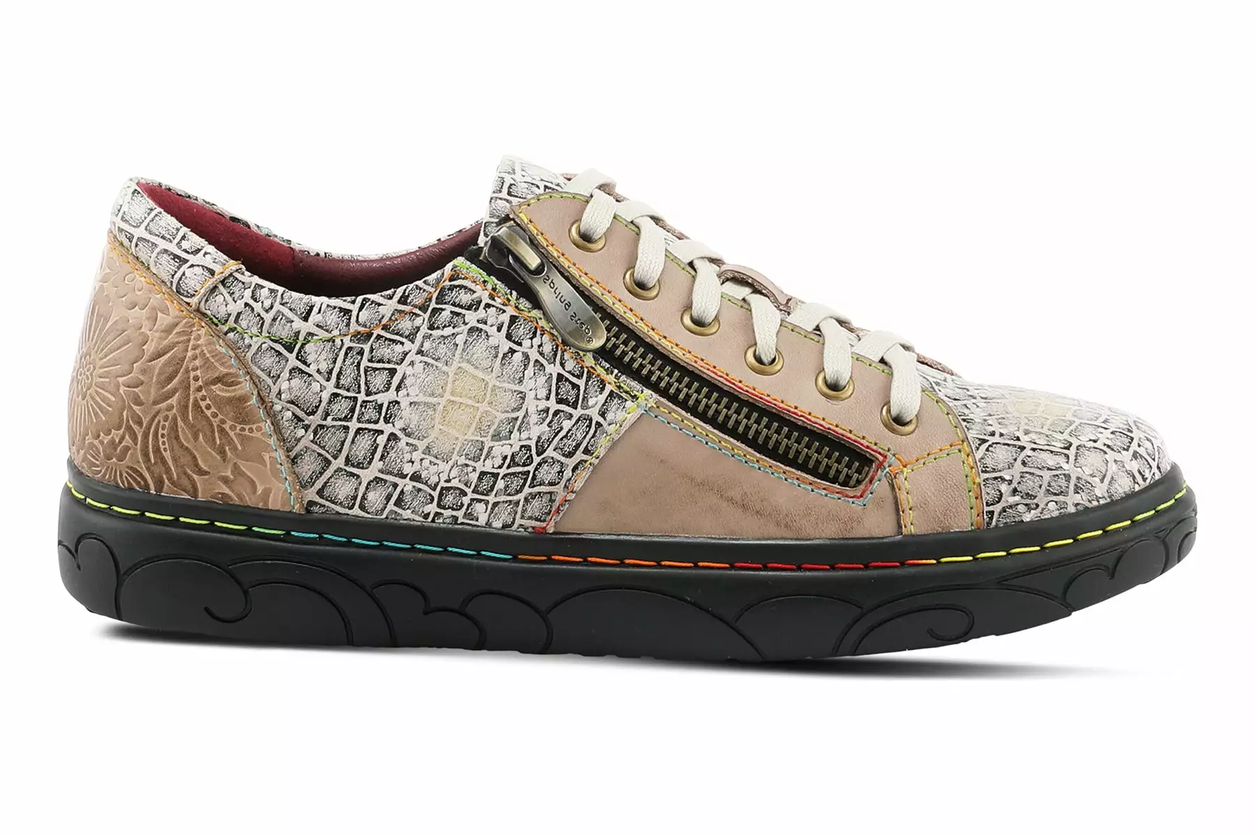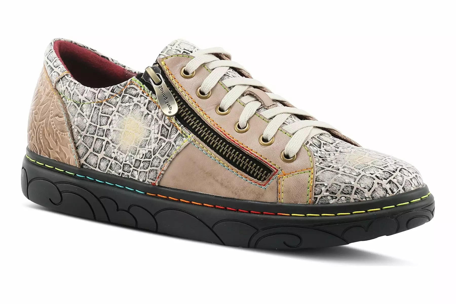 L`Artiste Style: Danli-Cosmic -French inspired zippered sneaker, featuring premium hand-painted and embossed leather, Lace-up closure with lace keeper, a padded comfort collar and removable footbed all on a flatform edged in rainbow stitching.