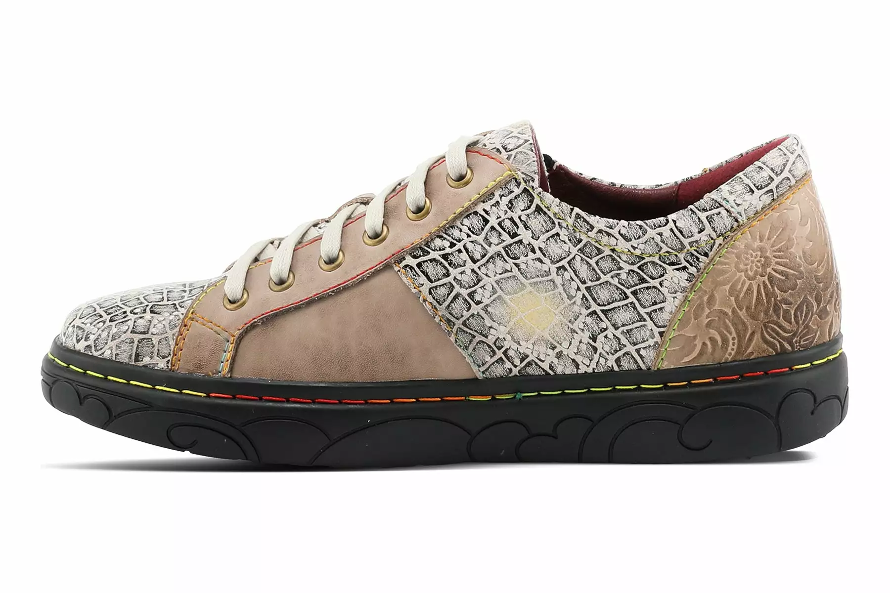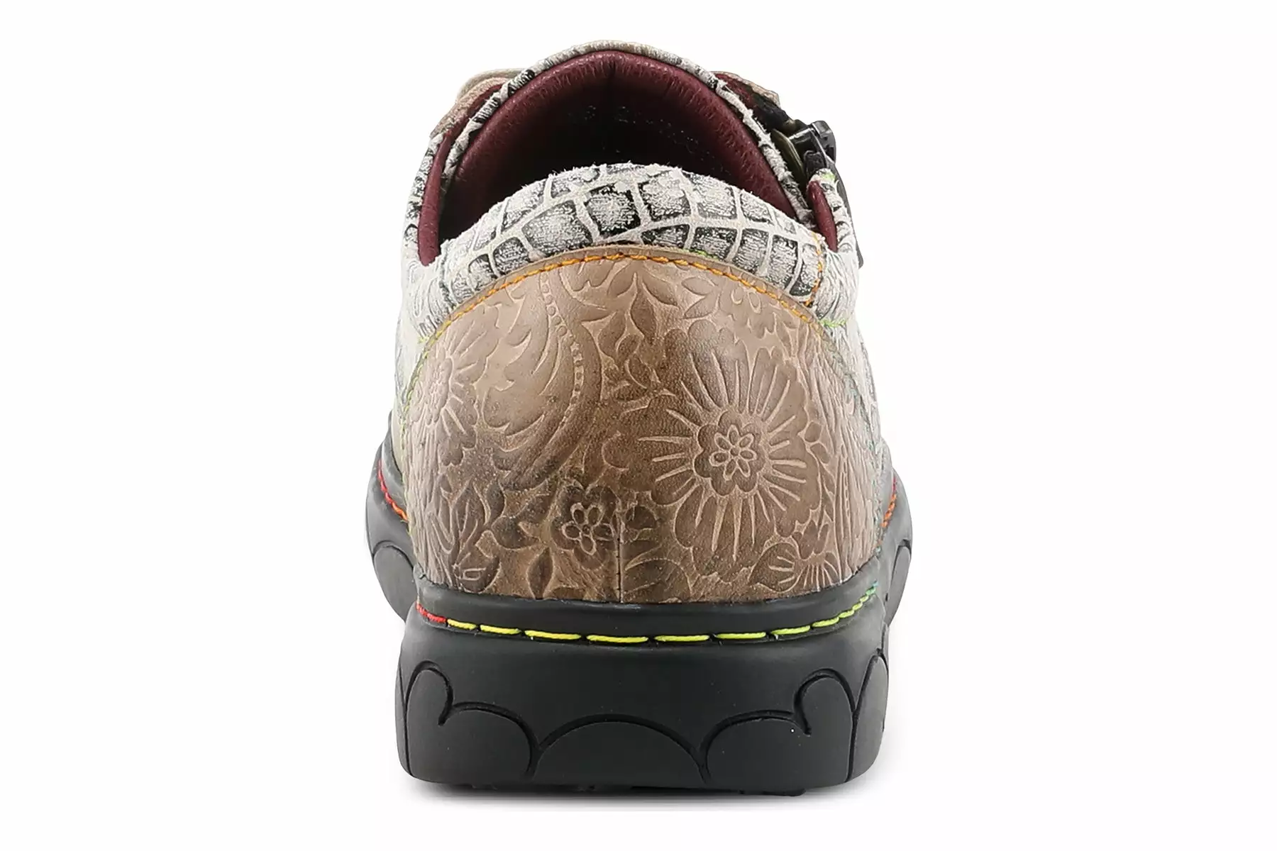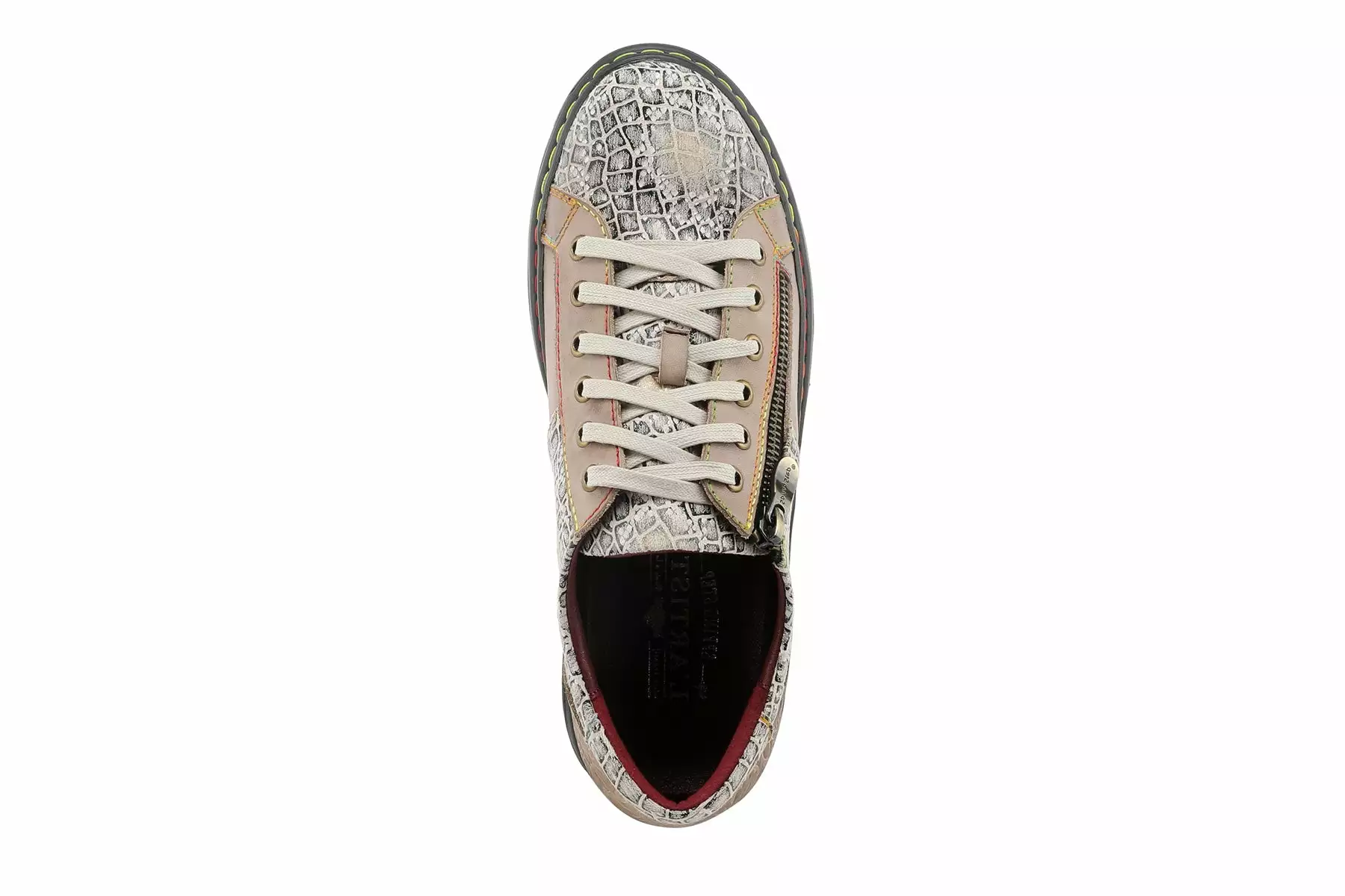 L`Artiste Style: Danli-Cosmic -French inspired zippered sneaker, featuring premium hand-painted and embossed leather, Lace-up closure with lace keeper, a padded comfort collar and removable footbed all on a flatform edged in rainbow stitching.