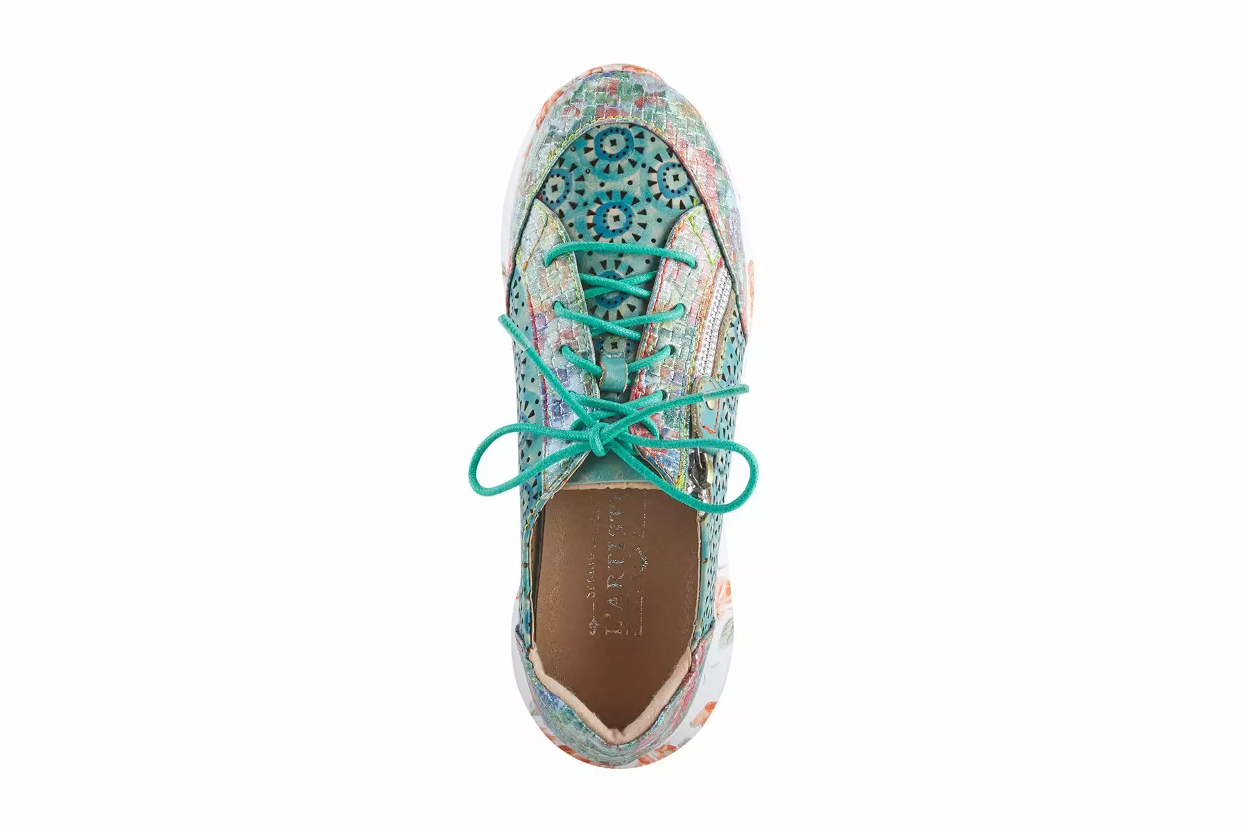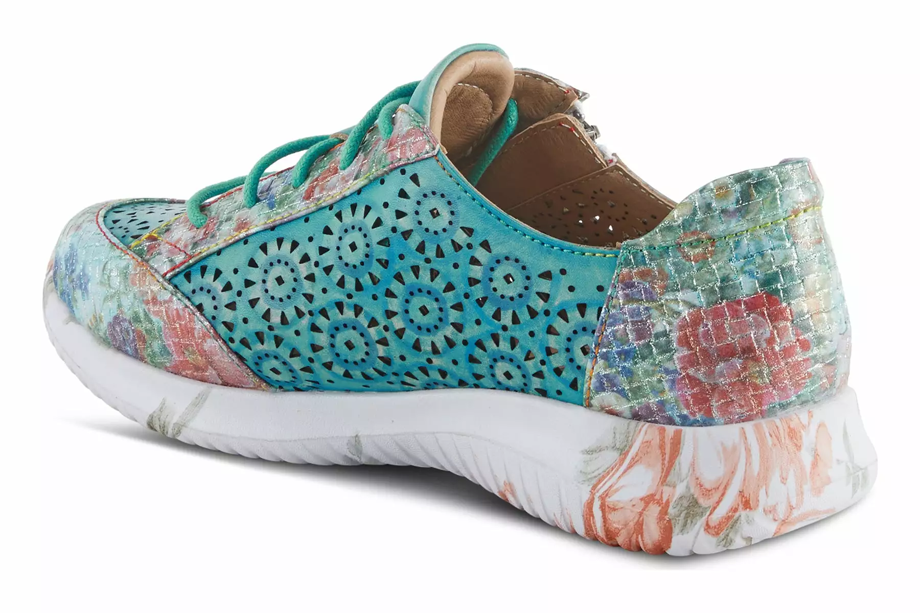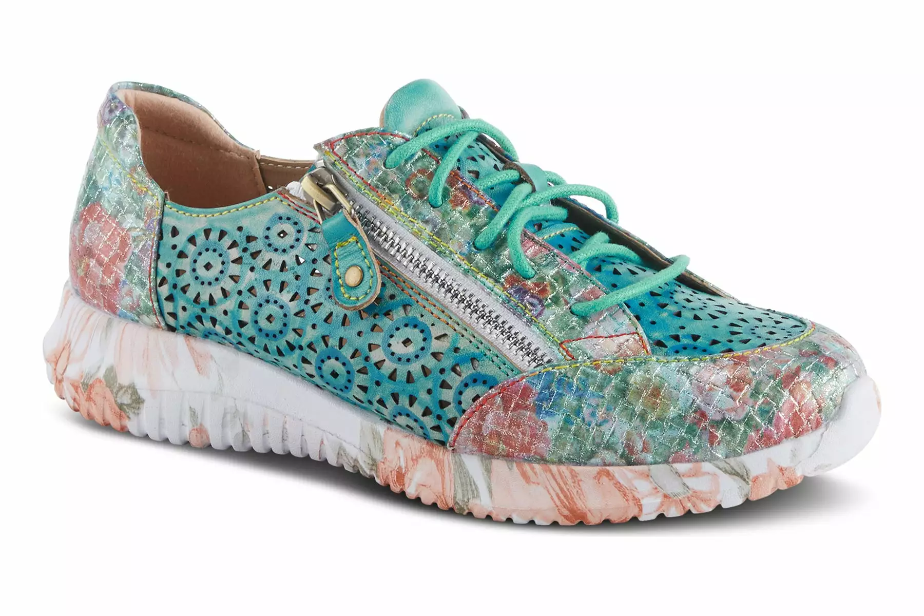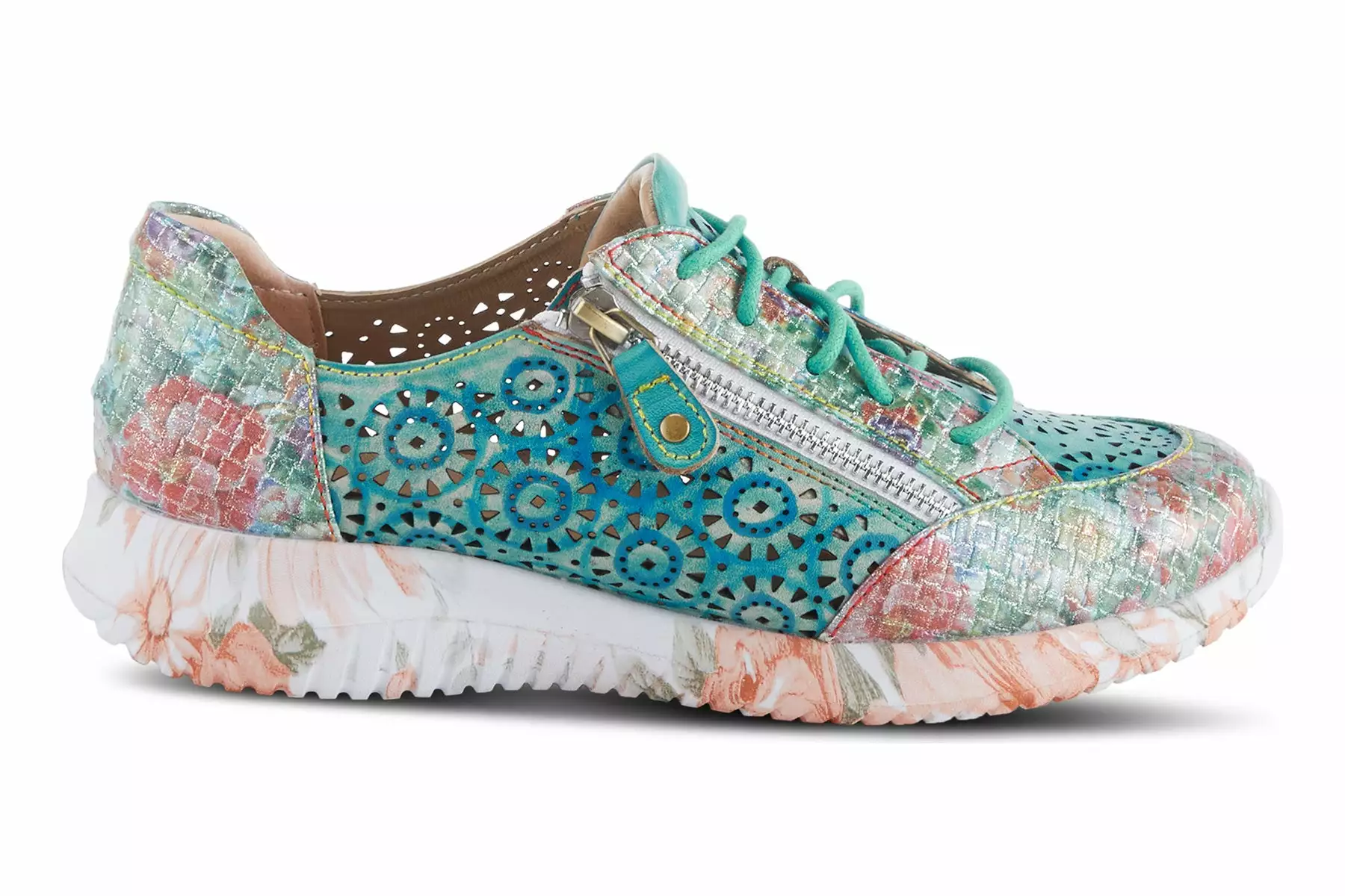 A lightweight sneaker that will put a spring in your step. This sneaker style casual has leather laser circle cutouts, lace-up straps, and a beautiful faux leather metallic pattern that matches a fun floral print on the outsole. The gentle wedge slope offers not only a lift but the ultimate all-day comfort