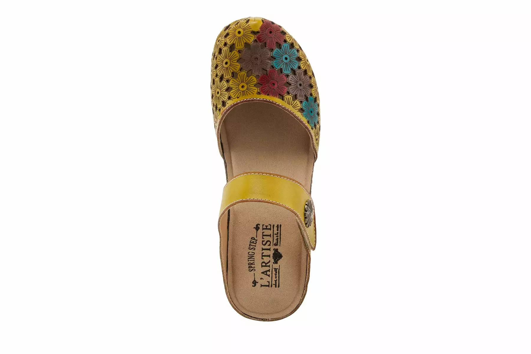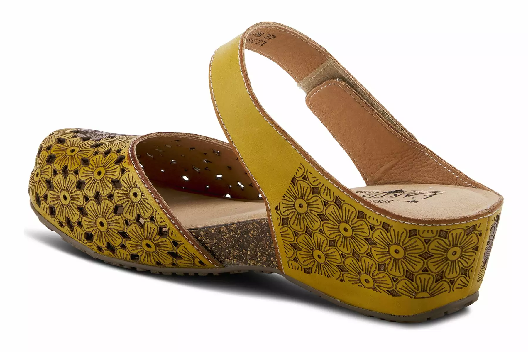 French-inspired, beautiful hand-painted premium leather clog featuring floral laser etching and cutout design, tonal stitchwork, and an adjustable hook and loop instep strap with an antiqued brushed metal ornament all on a cork and latex-wrapped, comfort wedge with a platform.
