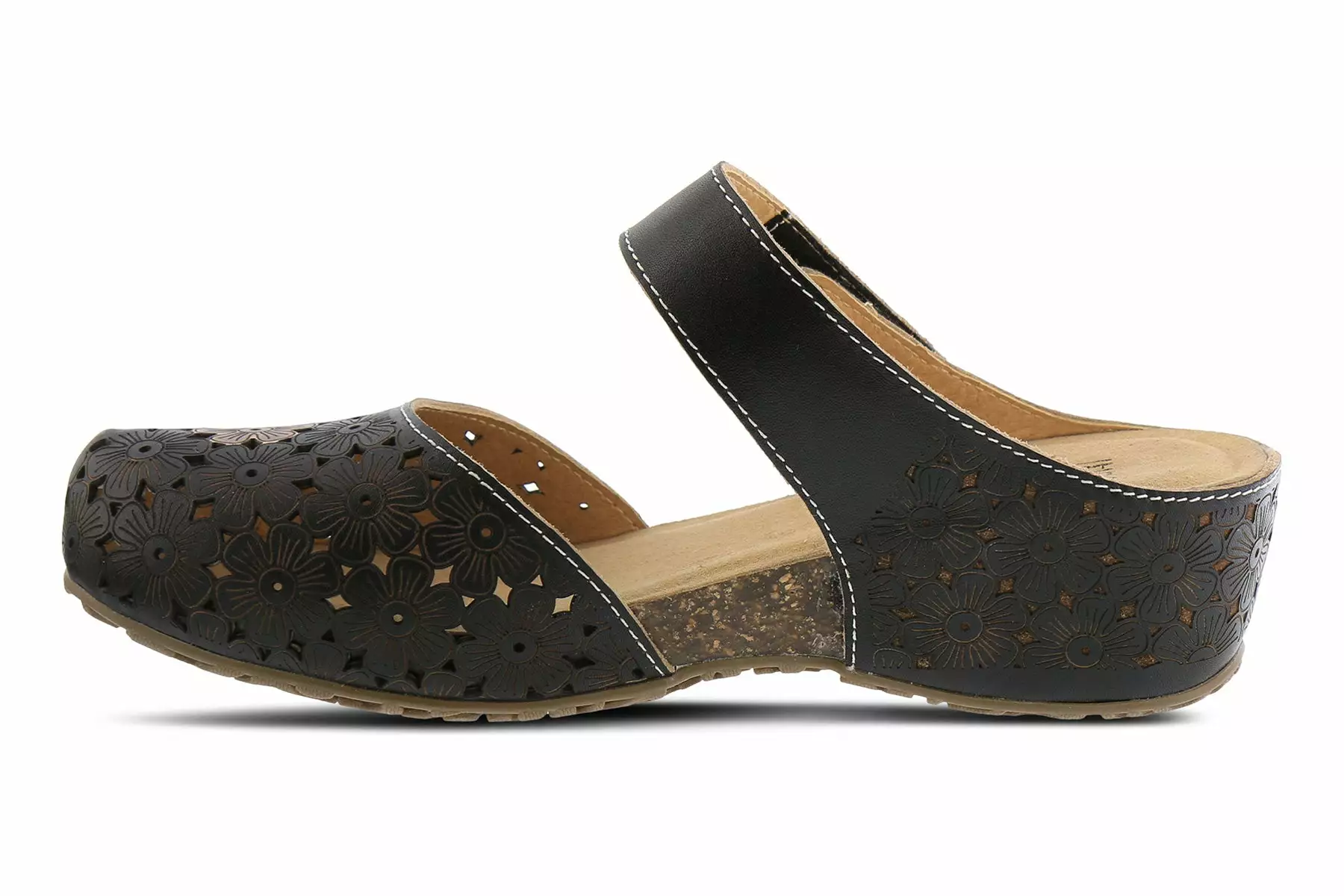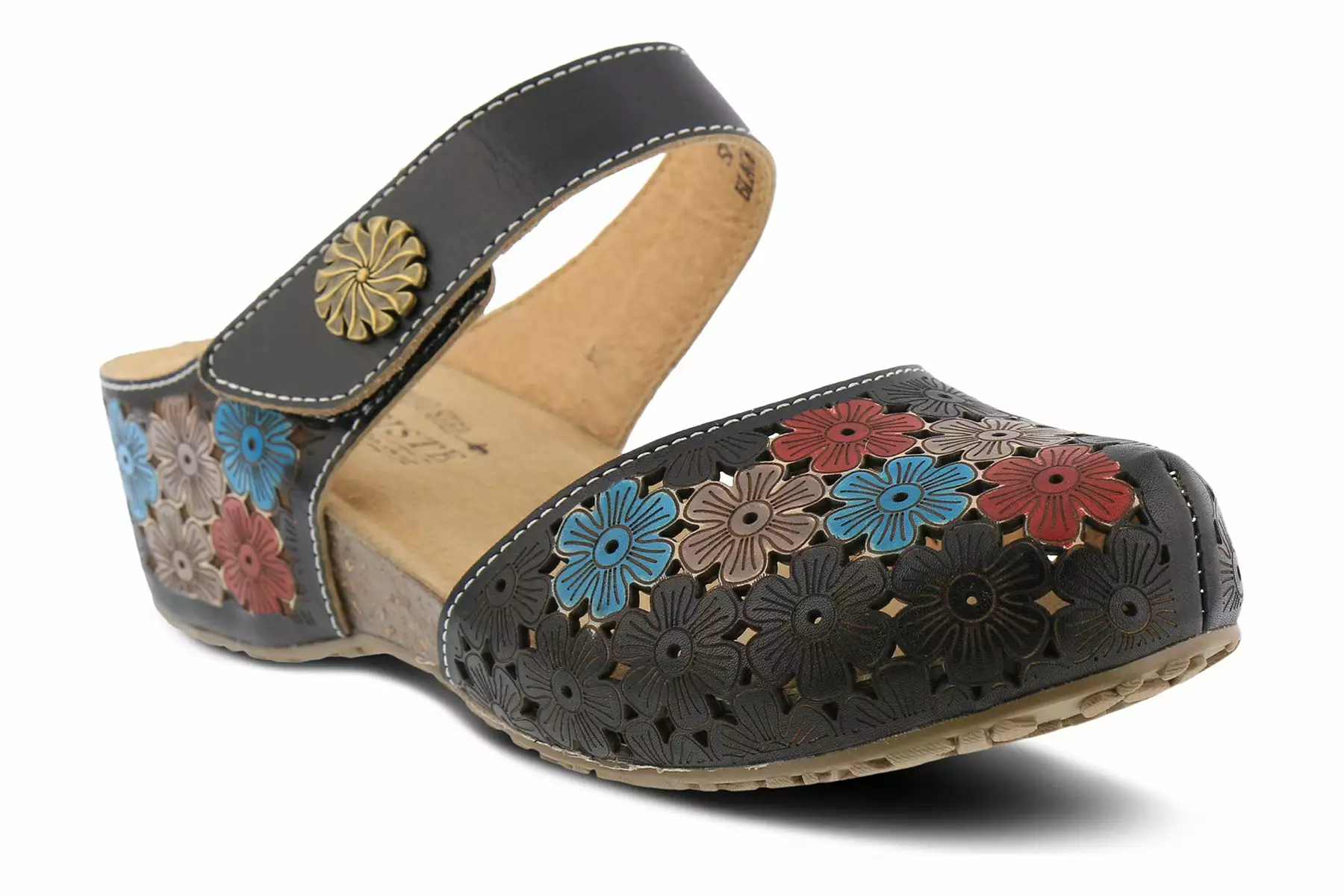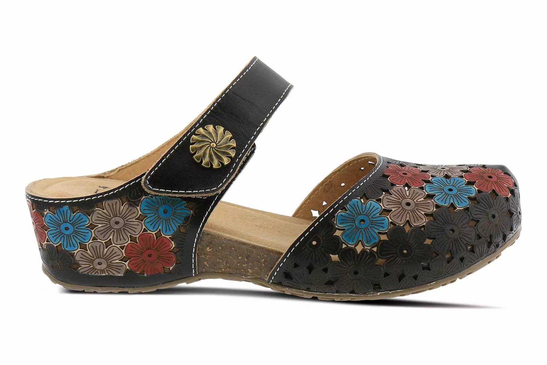 French-inspired, beautiful hand-painted premium leather clog featuring floral laser etching and cutout design, tonal stitchwork, and an adjustable hook and loop instep strap with an antiqued brushed metal ornament all on a cork and latex-wrapped, comfort wedge with a platform.