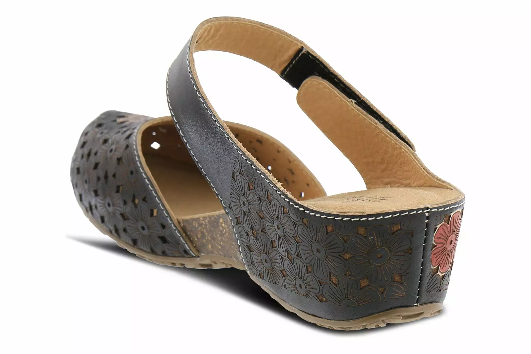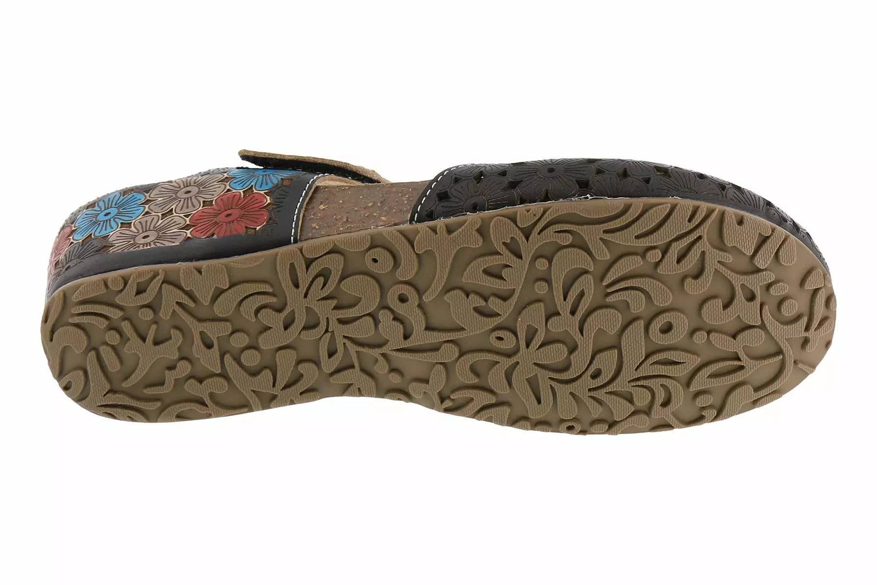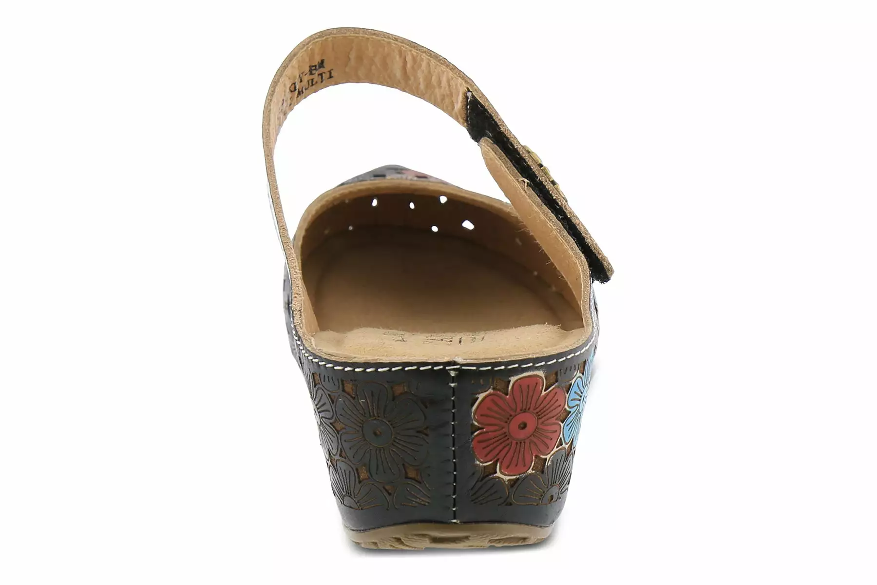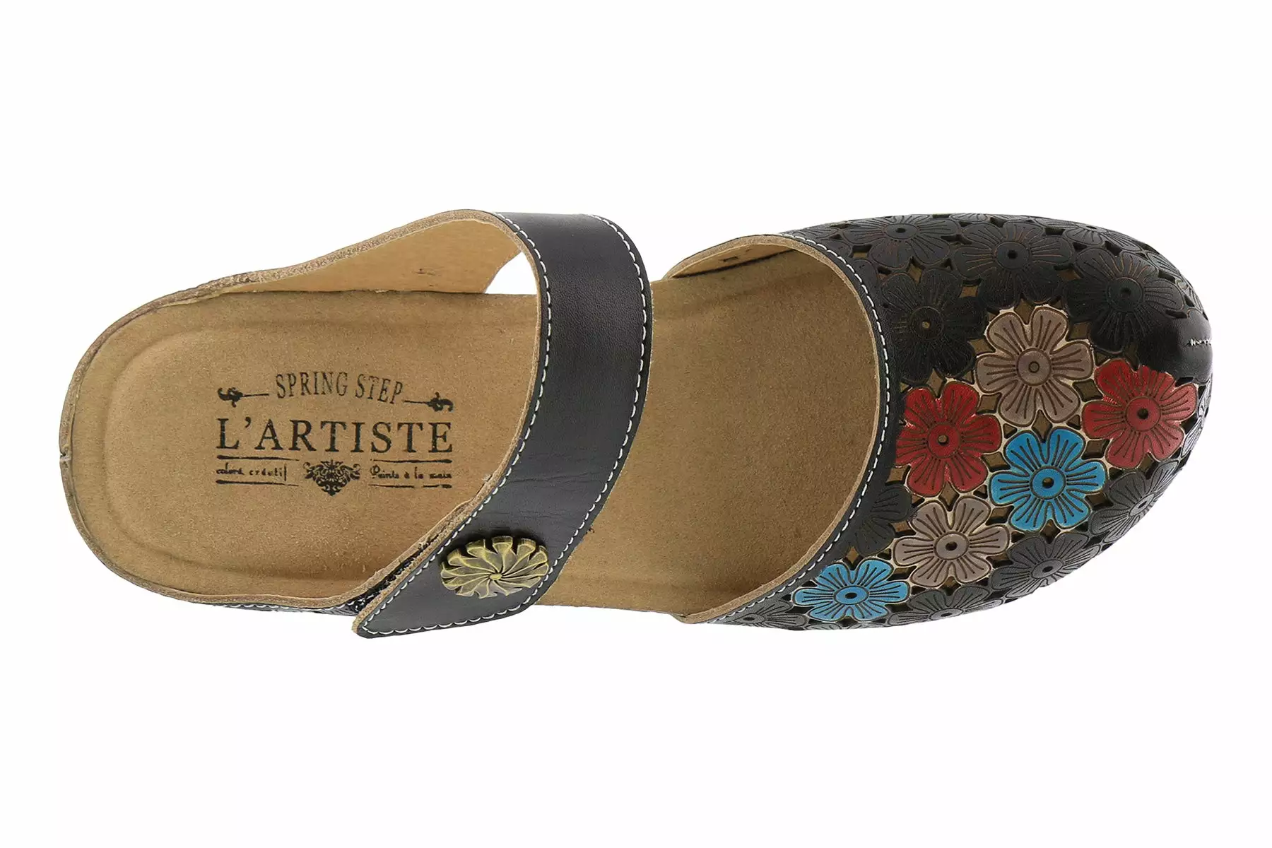 French-inspired, beautiful hand-painted premium leather clog featuring floral laser etching and cutout design, tonal stitchwork, and an adjustable hook and loop instep strap with an antiqued brushed metal ornament all on a cork and latex-wrapped, comfort wedge with a platform.