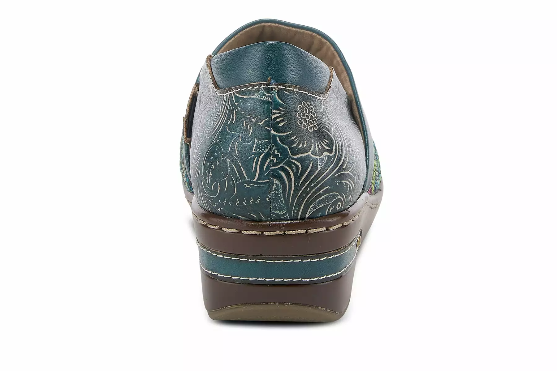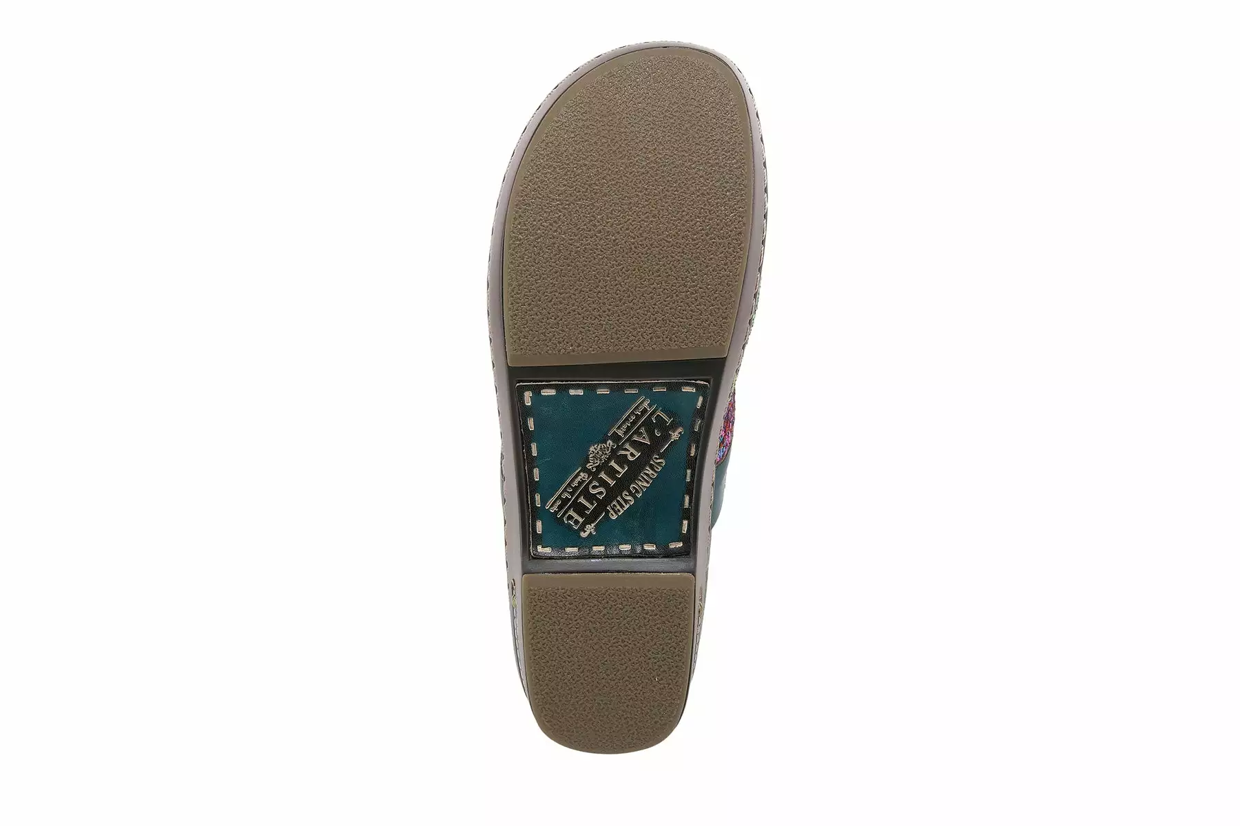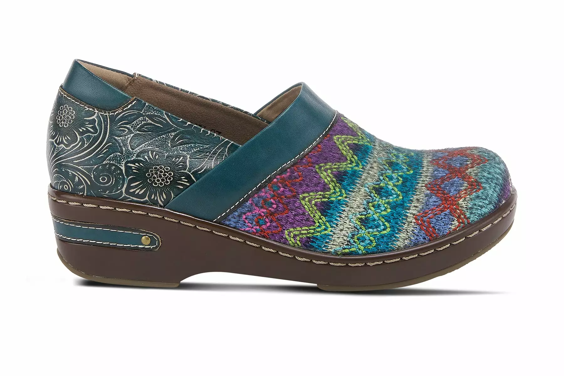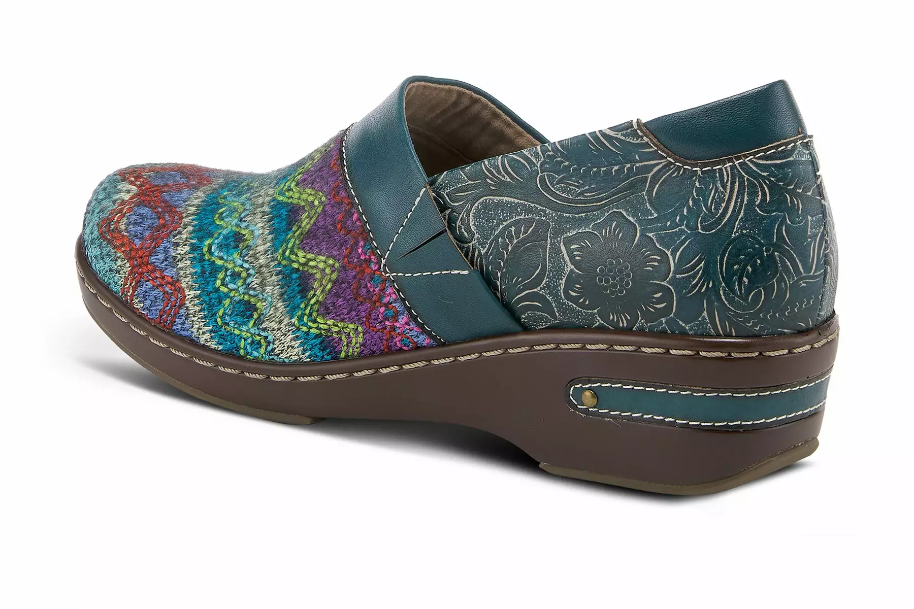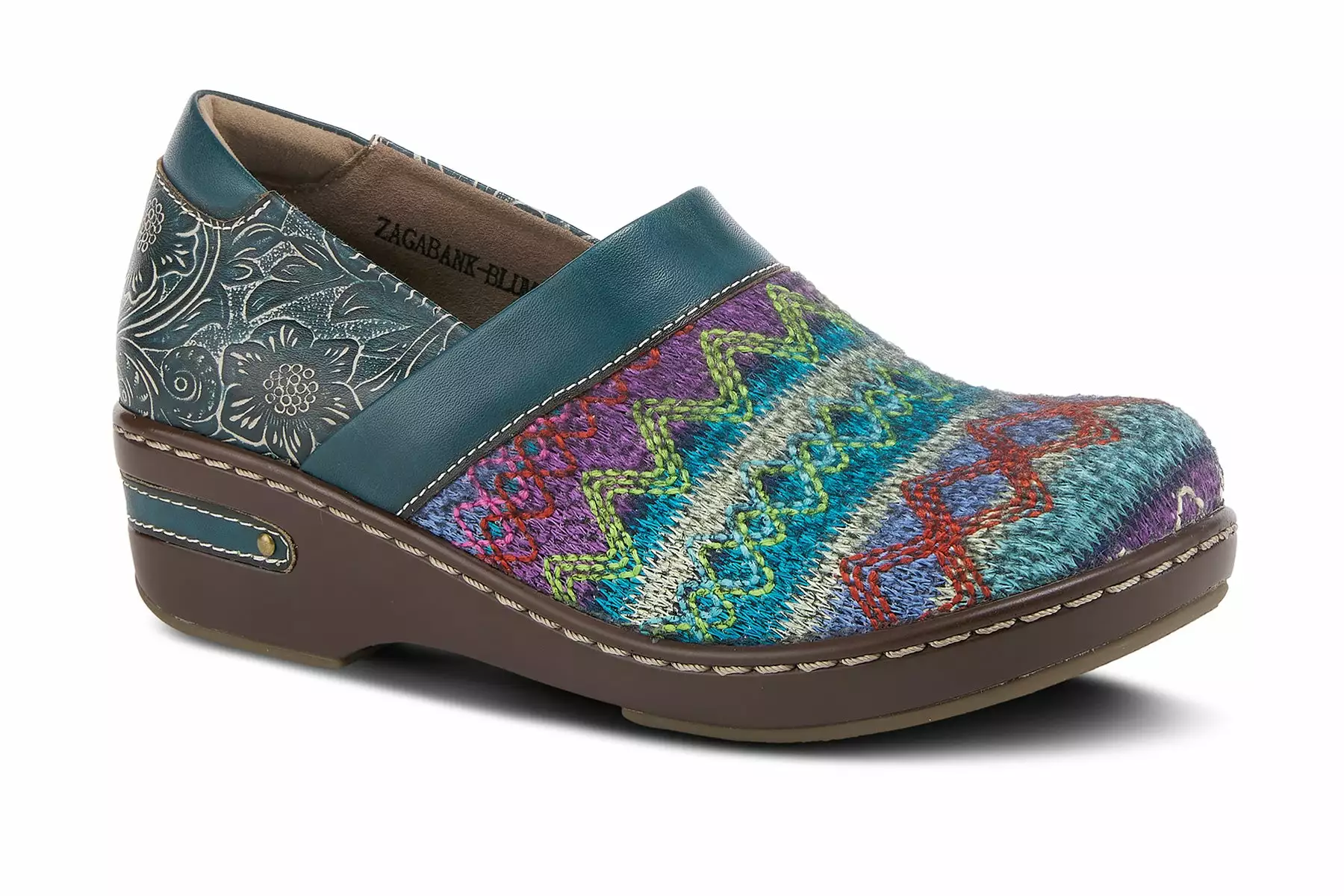 L`Artiste ZAGABANK Showstopping leather combination slip-on clog featuring stunning woven material and embossed floral leather on an all-day wear outsole.