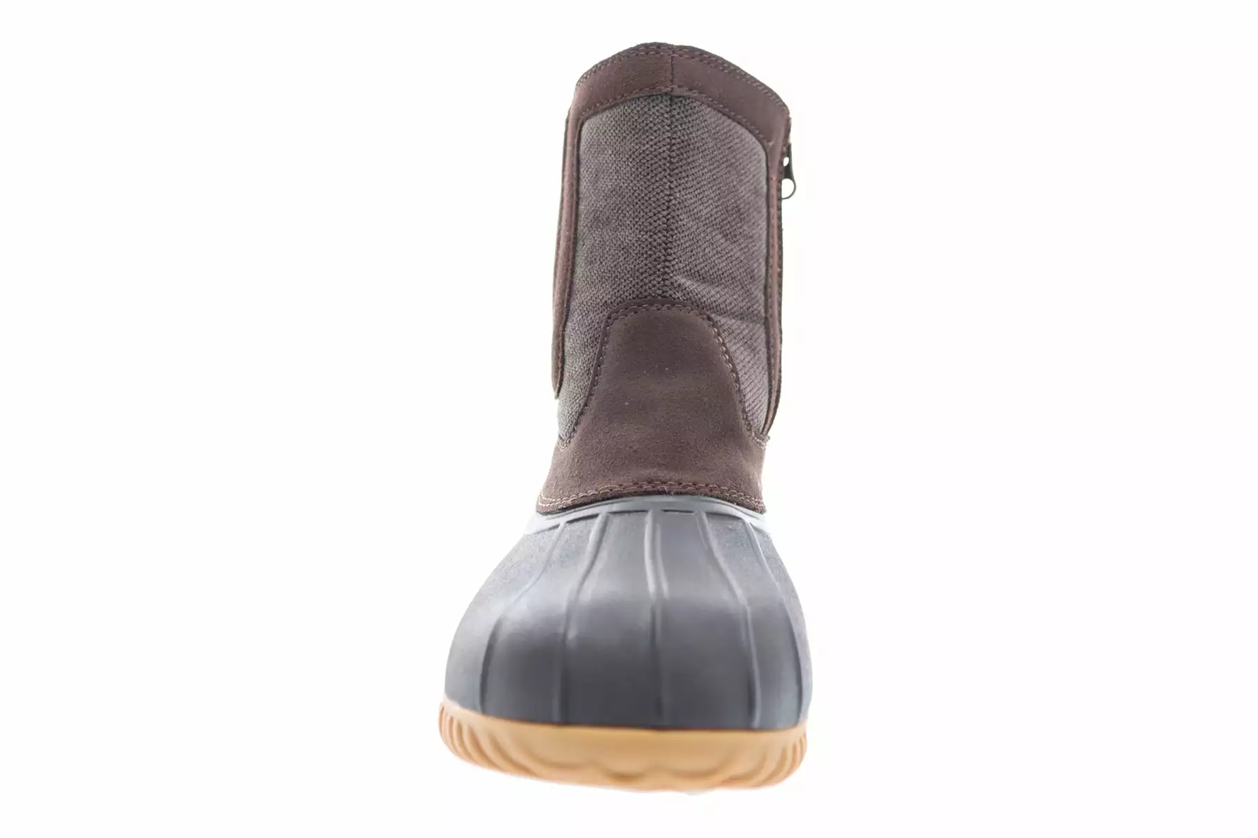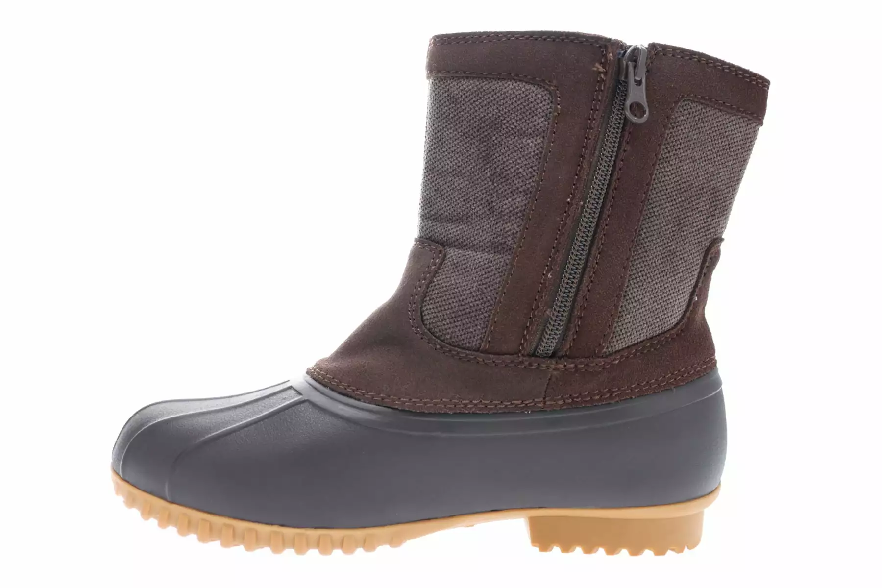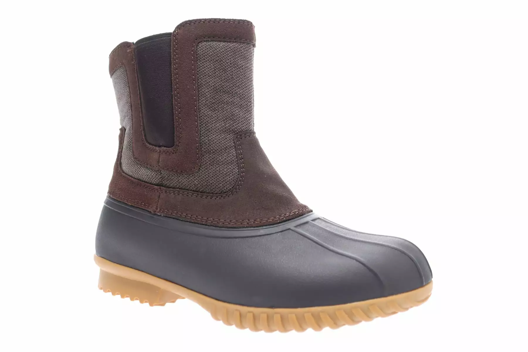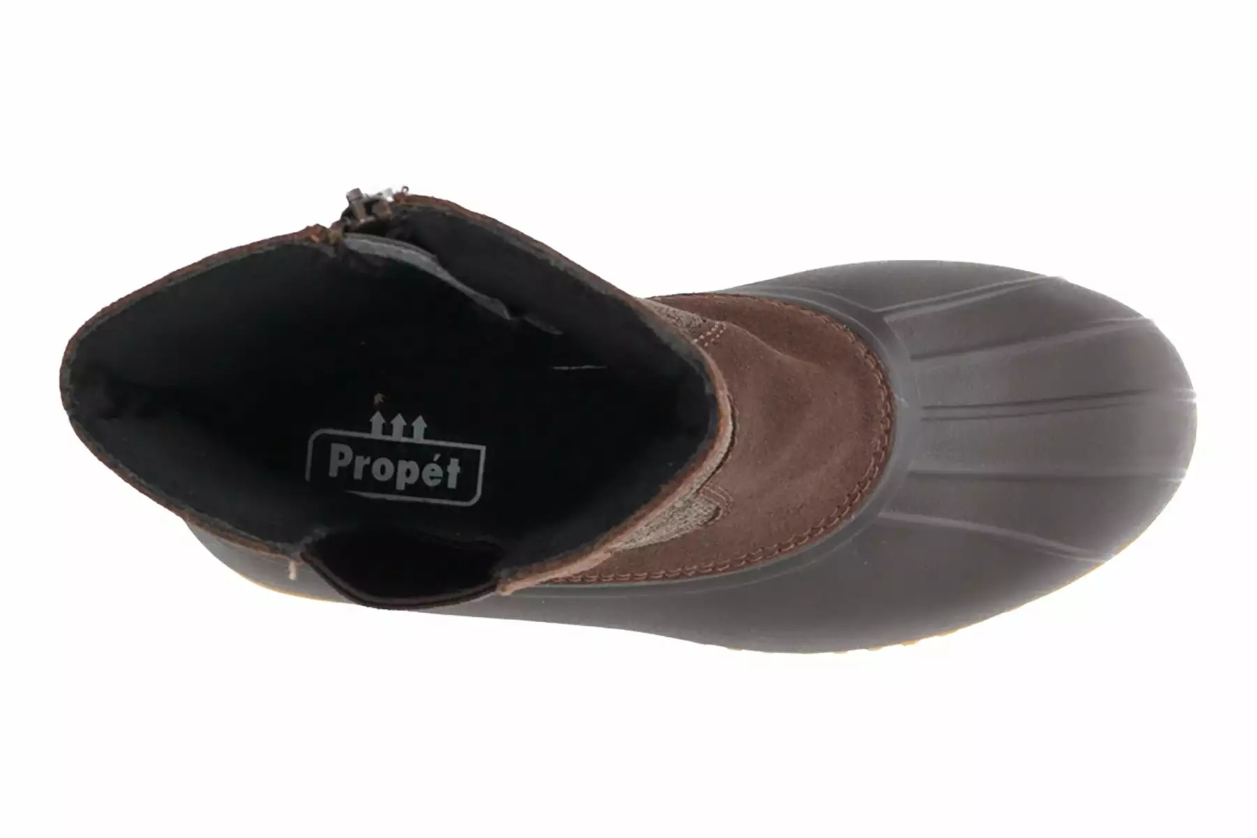 Propet Insley is a cozy boot for cold and wet weather. These sturdy boots have a suede and fabric upper, faux fur lining, molded EVA toe and rubber outsole. An inside zipper, heat-retaining insole and 7-inch shaft height outlines these rugged and warm duck boots.