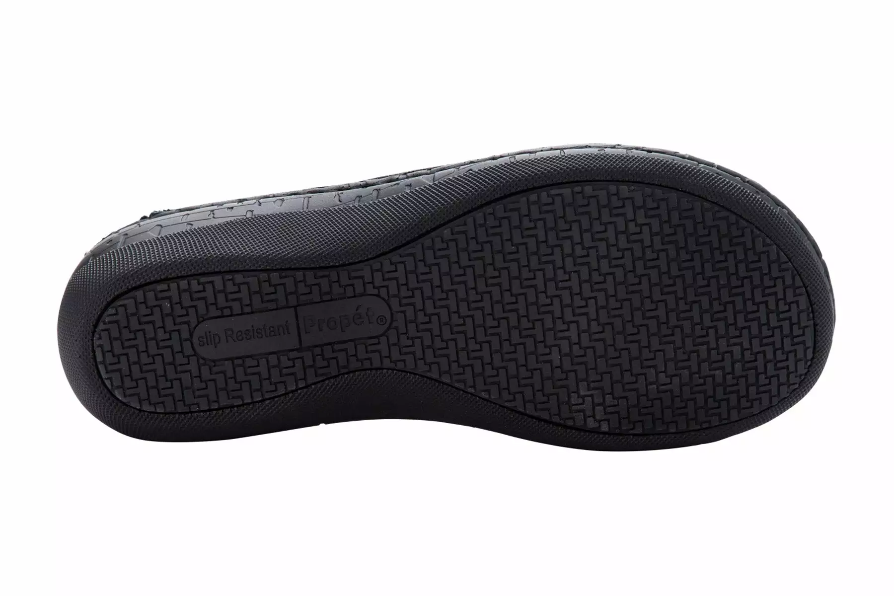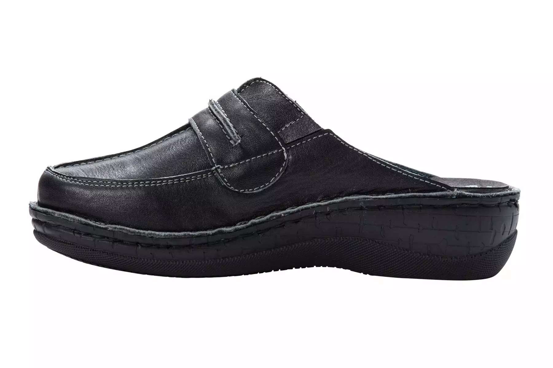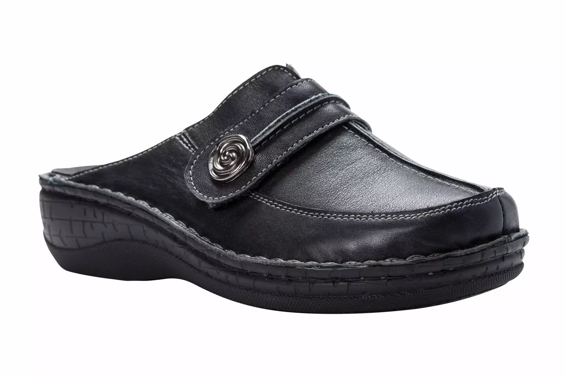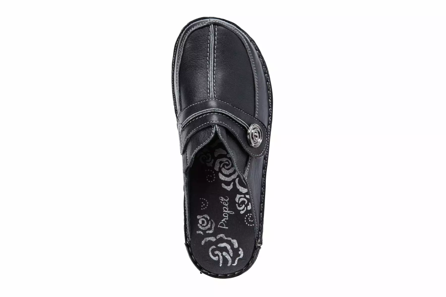 Slide into the women’s Propet Jana clog and experience all-day comfort. The full-grain leather upper is adorned with a decorative strap for added style. The removable OrthoLite® footbed accommodates custom orthotics, while the durable polyurethane outsole provides traction.