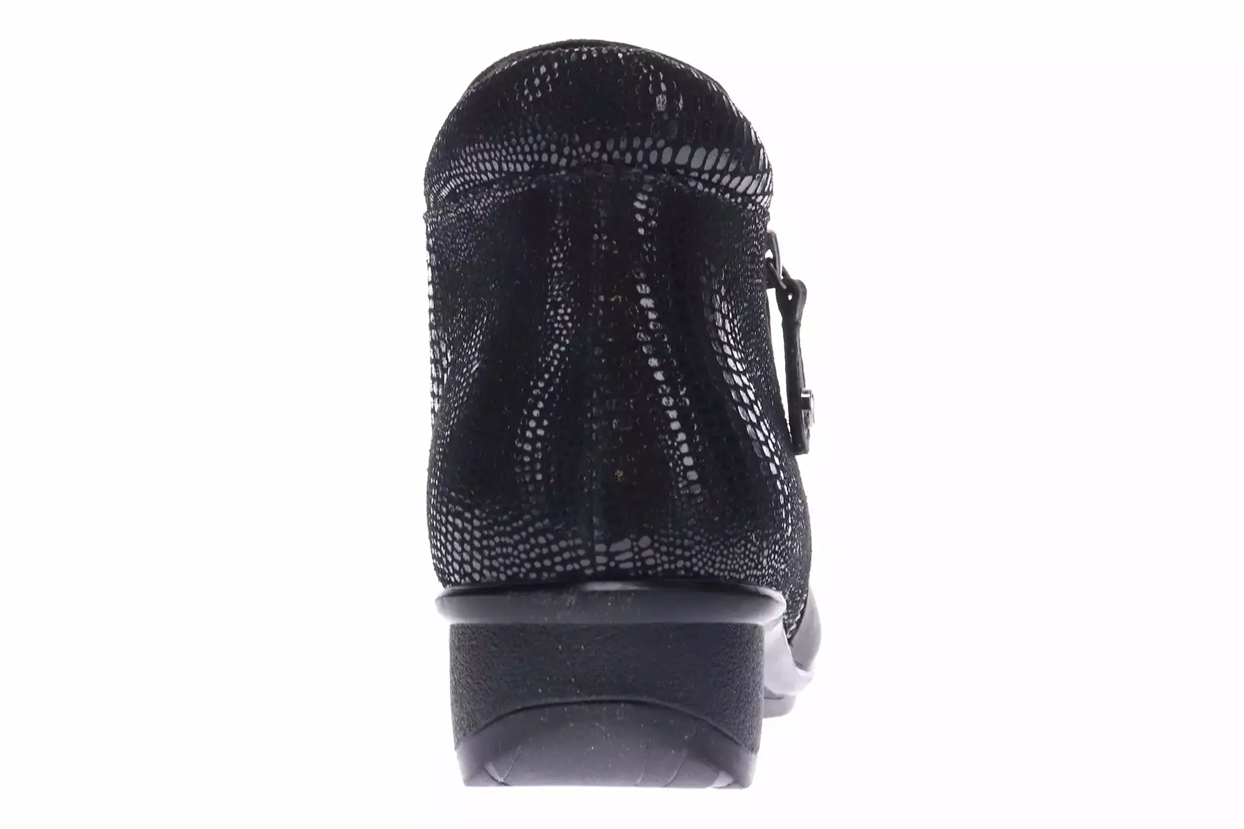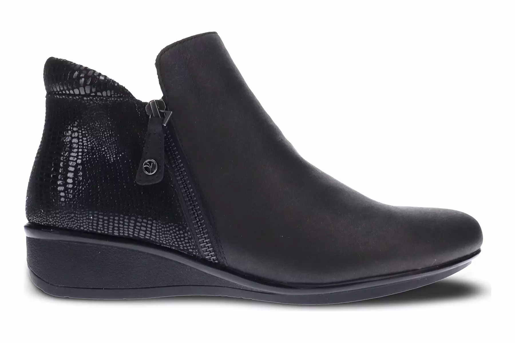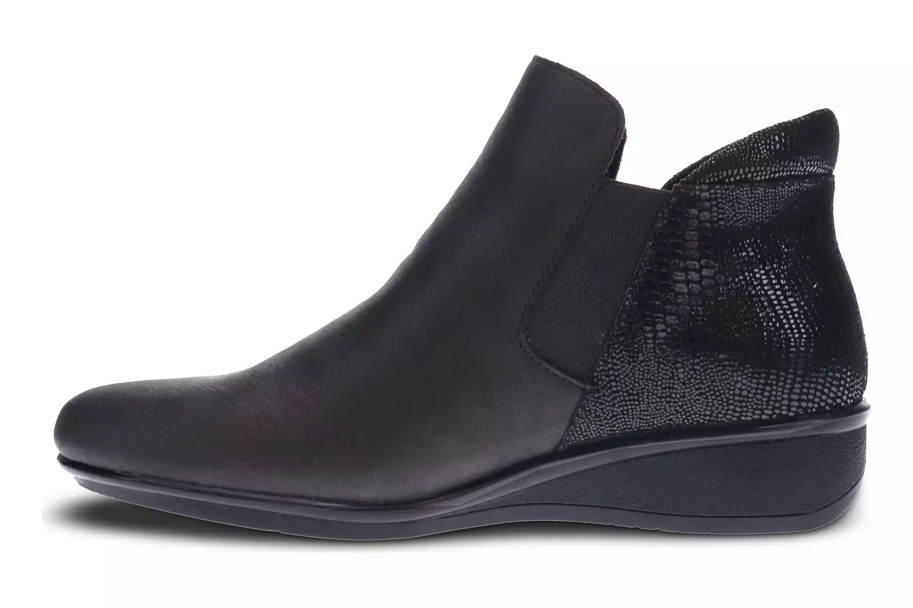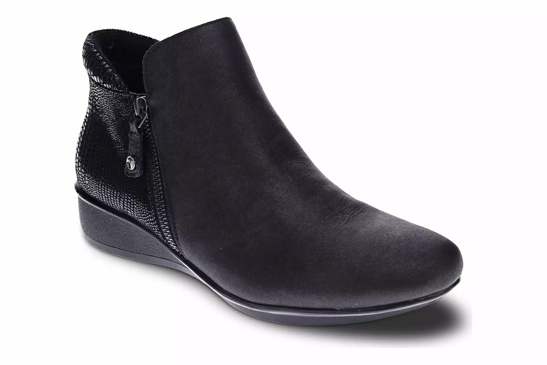 A little bit daring but endlessly wearable, Damascus features an asymmetrical side zip detail and a demi-wedge rubber outsole. Contrasting front and back panels in luscious leather, animal skin prints and metallic add a hint of shine and texture to this mid-ankle bootie.