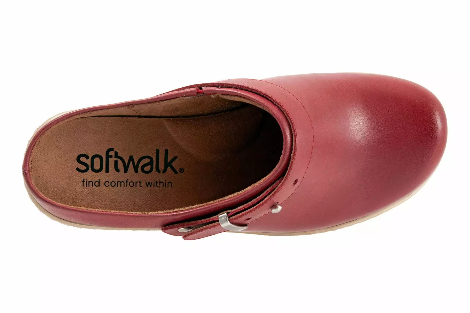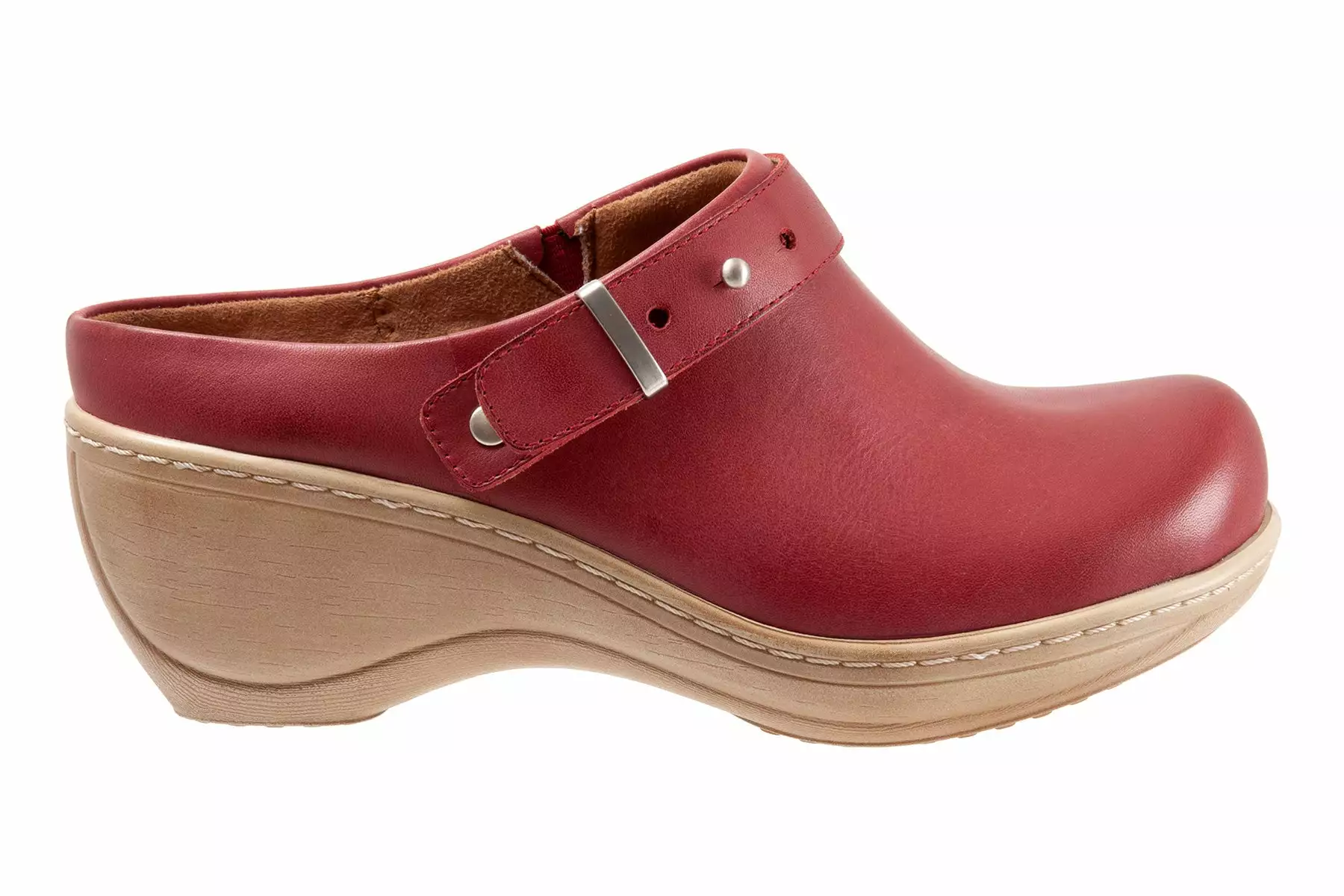 Sleek hardware on swing back strap lends a functional and playful touch to this rich leather mule. Beautifully crafted, this retro inspired clog-style features supple leather uppers with contrast stitching on a modernized lightweight faux wood clog sole.Â