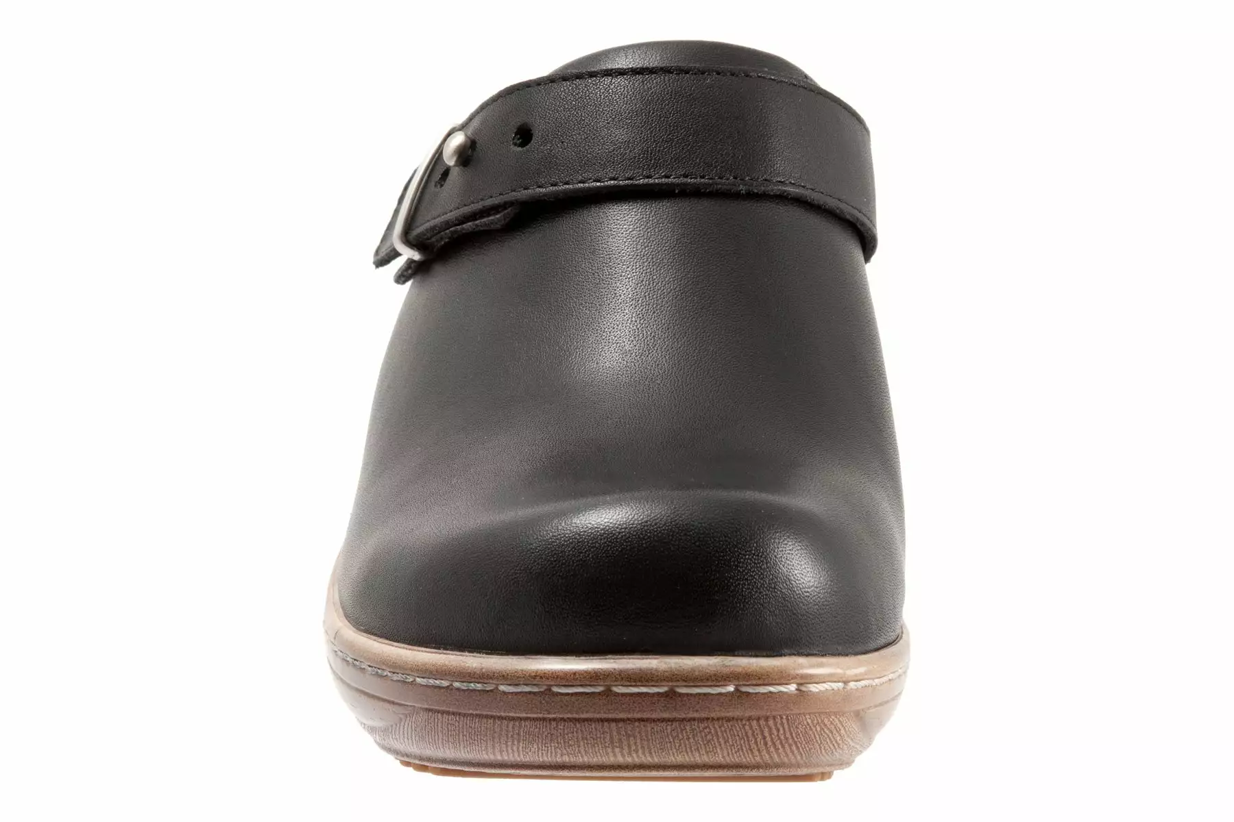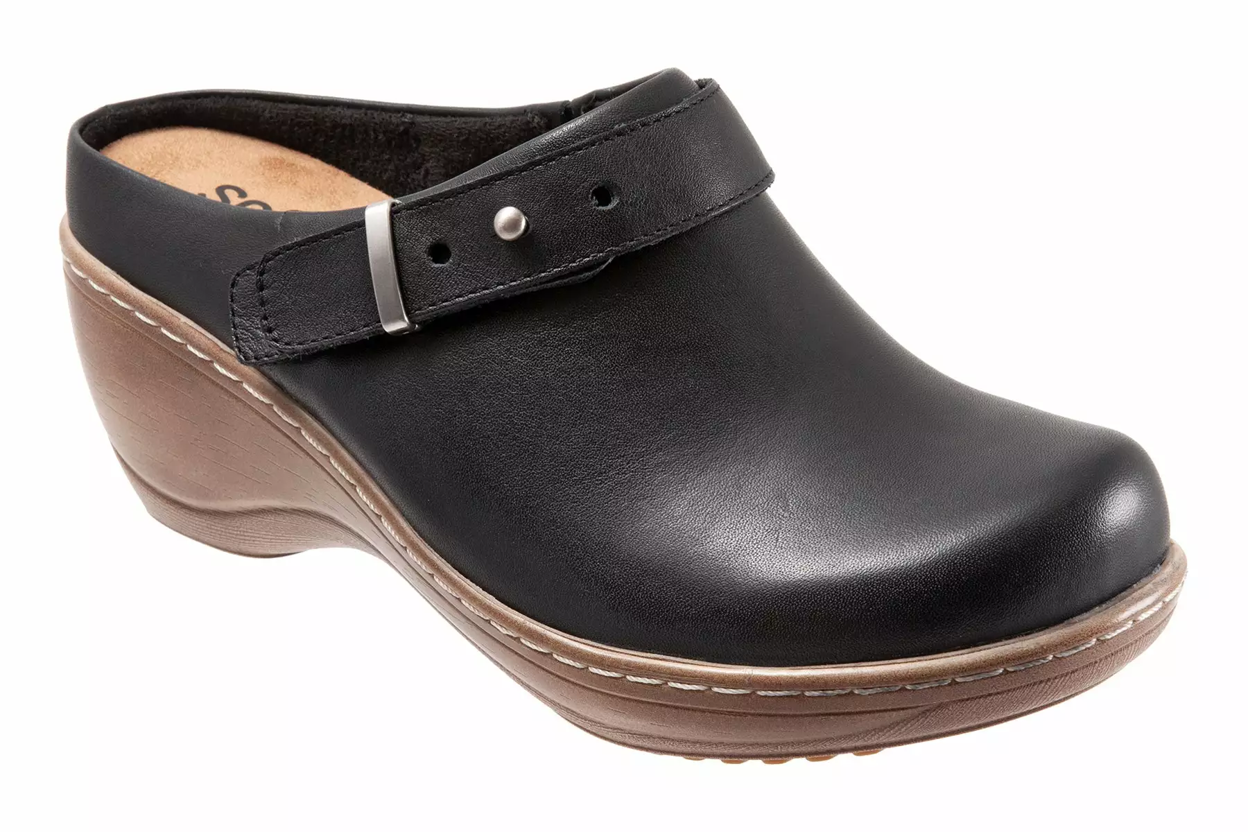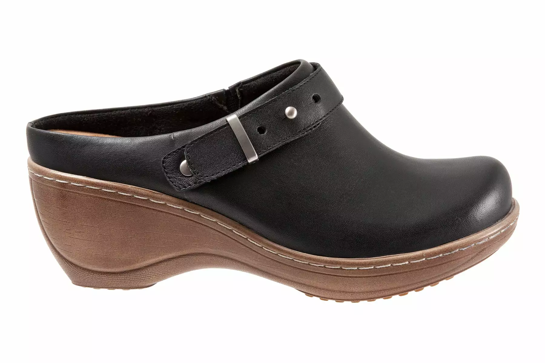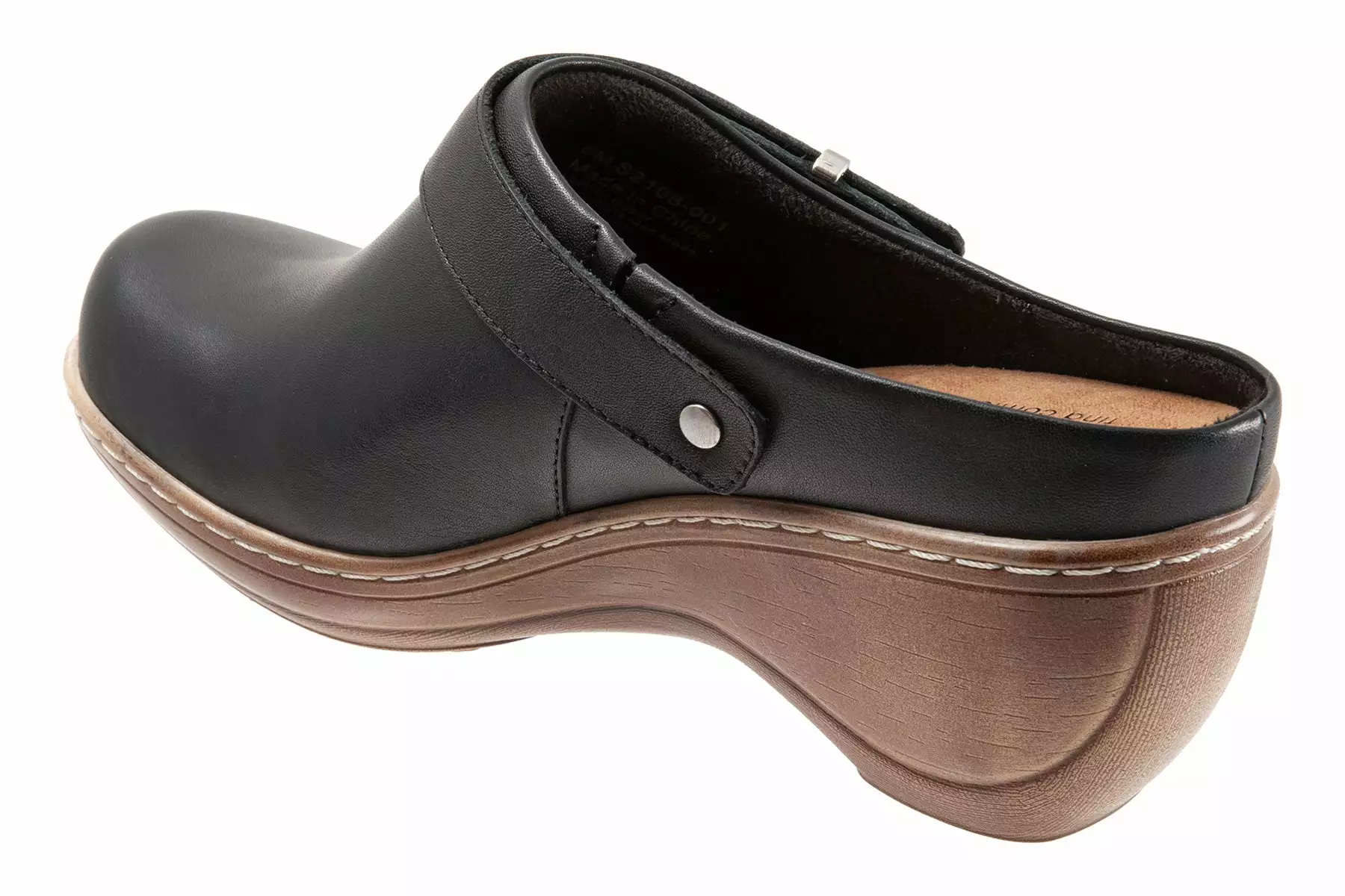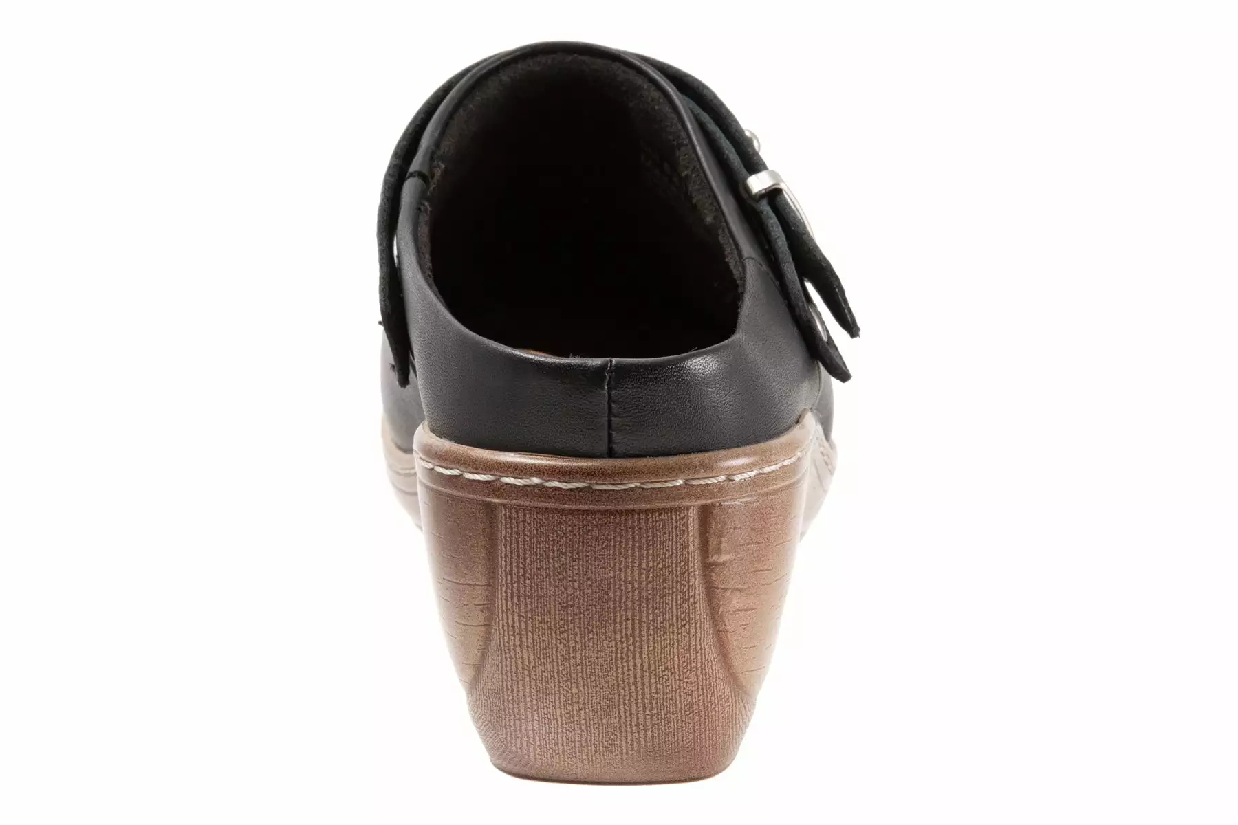 Sleek hardware on swing back strap lends a functional and playful touch to this rich leather mule. Beautifully crafted, this retro inspired clog-style features supple leather uppers with contrast stitching on a modernized lightweight faux wood clog sole.Â