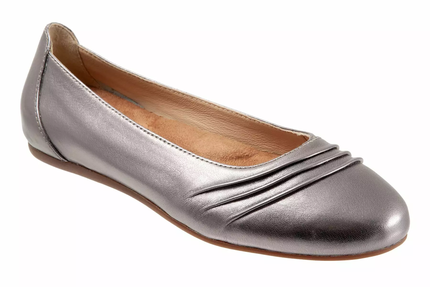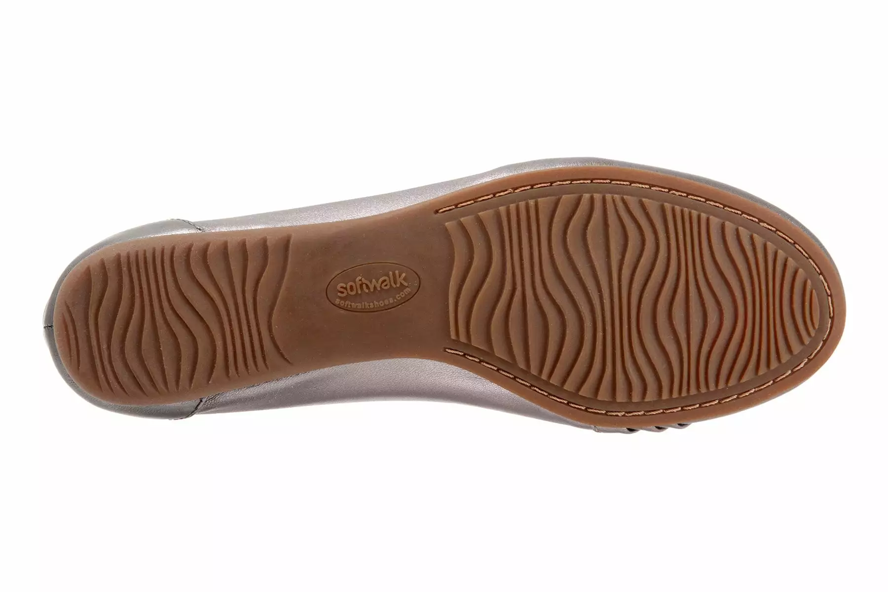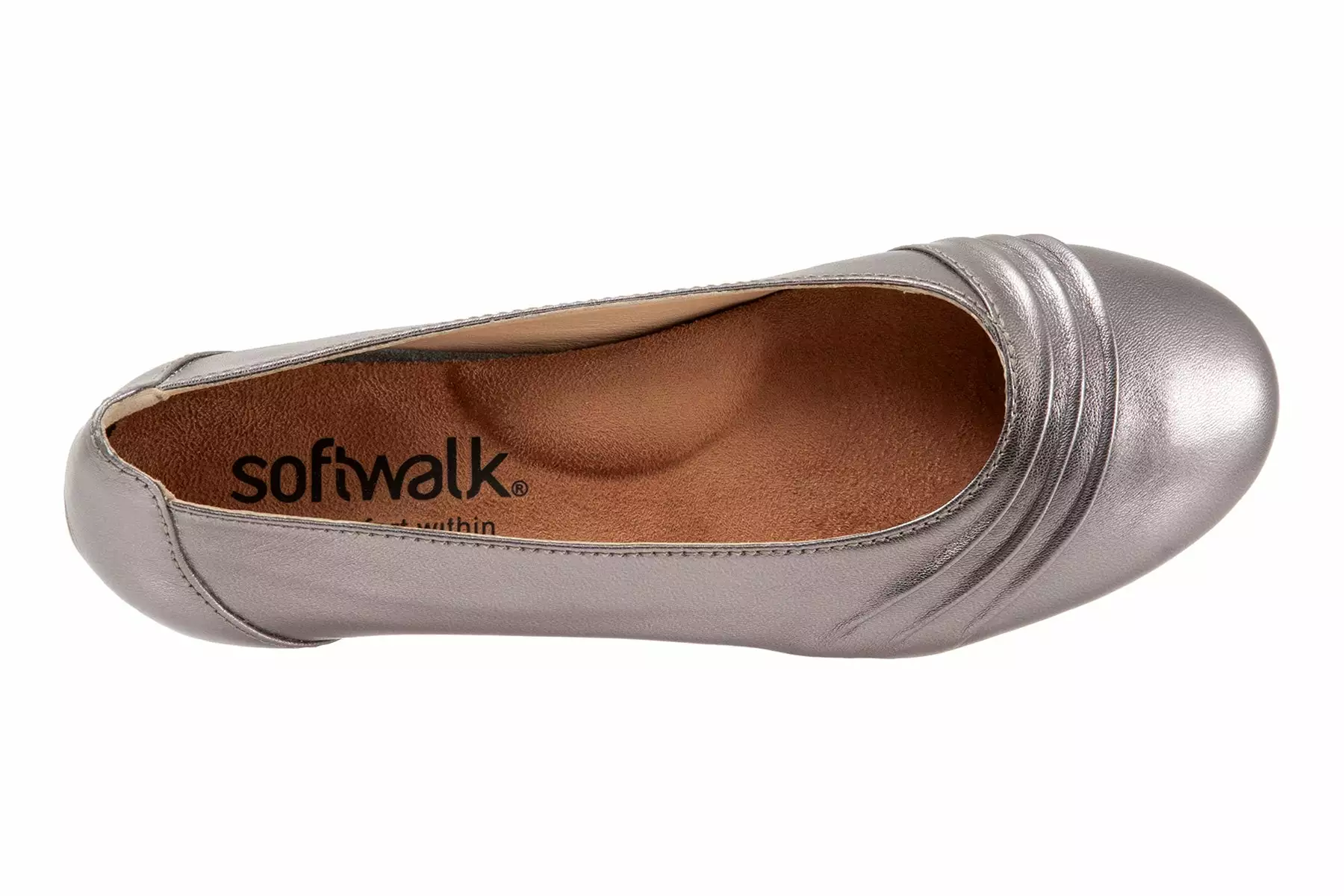 SoftWalk Safi is a modern slip-on ballet flat for any occasion. Ruched detailing, burnished leather uppers and closed, rounded toe elevate these ballet flats. A microfiber footbed lining and molded rubber outsole makes for a comfortable walking flat.