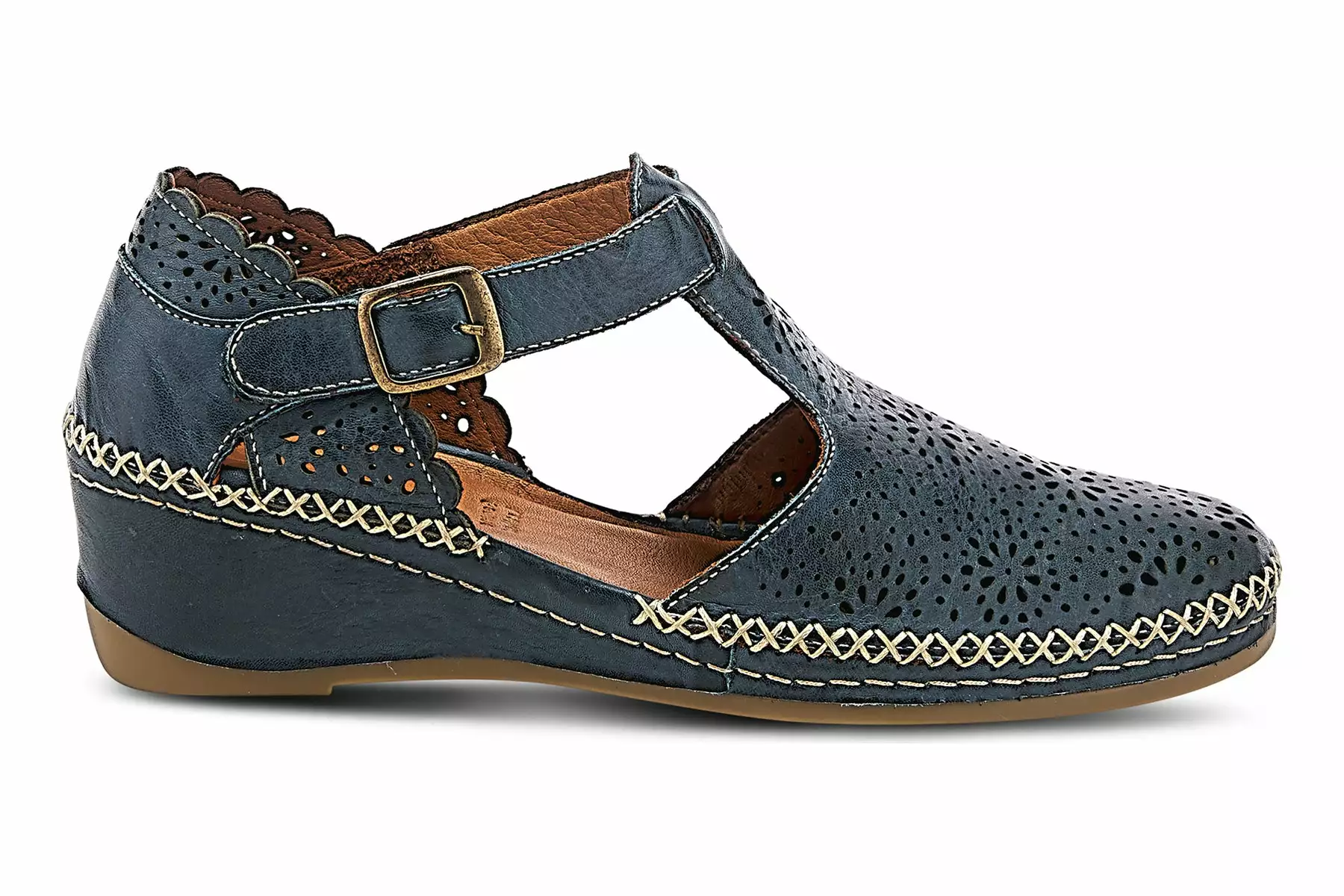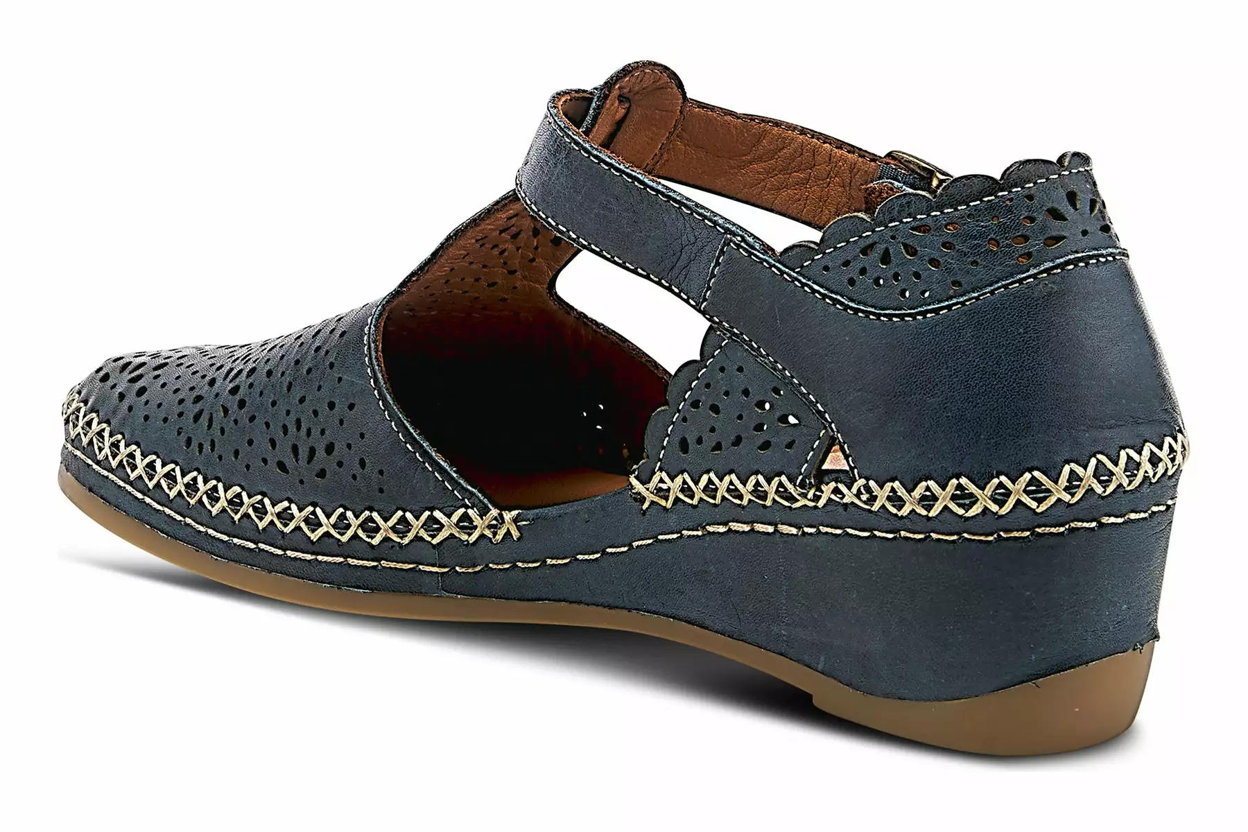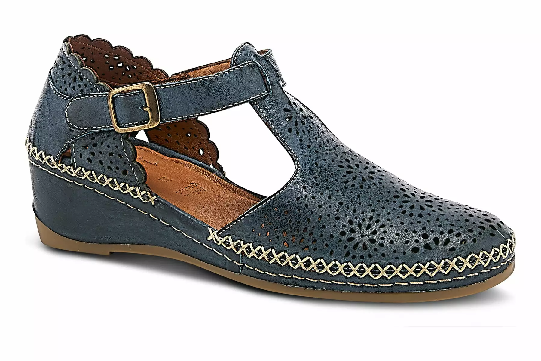 European influenced, premium leather T-strap shoe featuring a laser etching and cutout design, an adjustable hook and loop ankle strap, and artesian whip stitching detail all on a leather-wrapped, comfort wedge with a flexible forefoot.