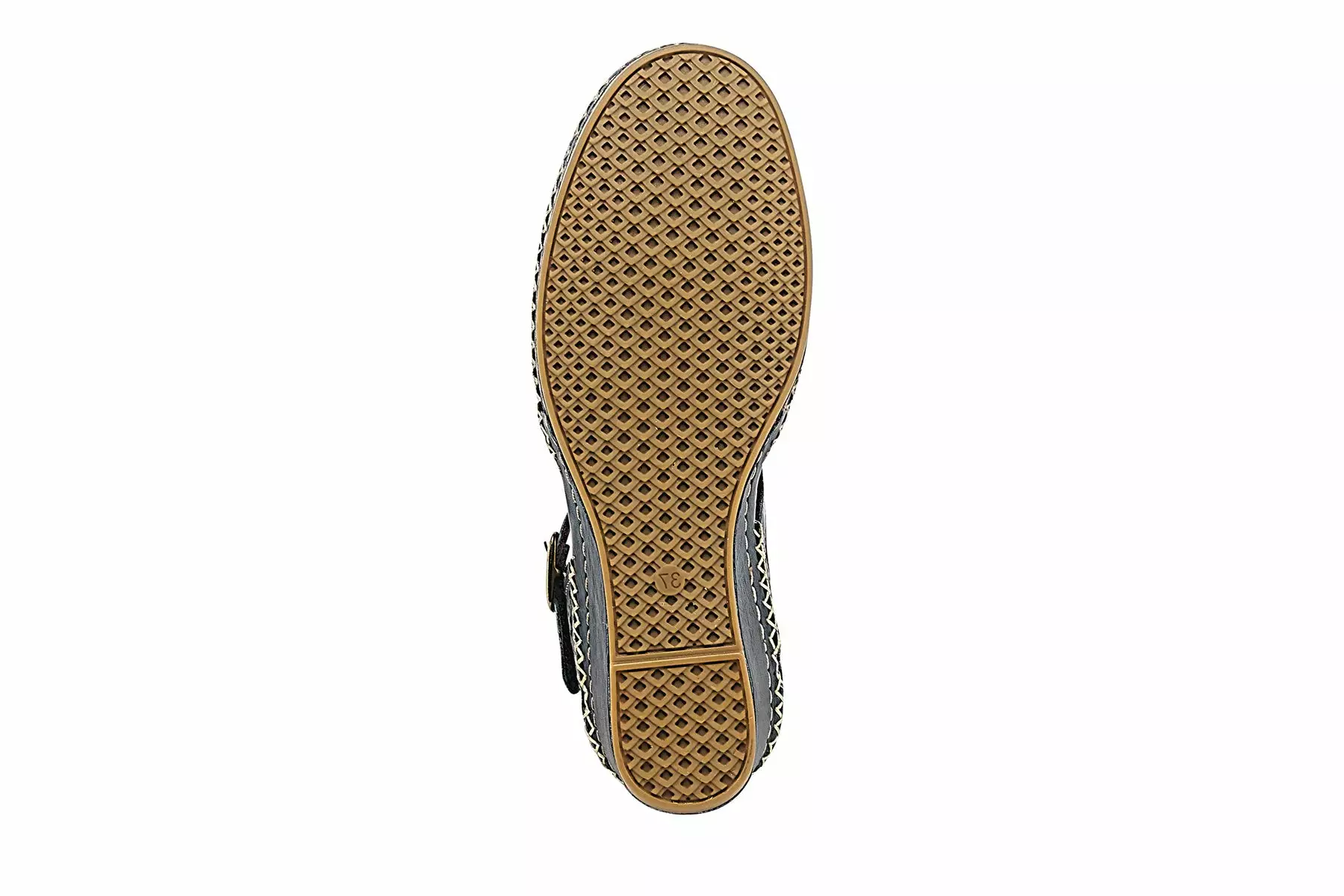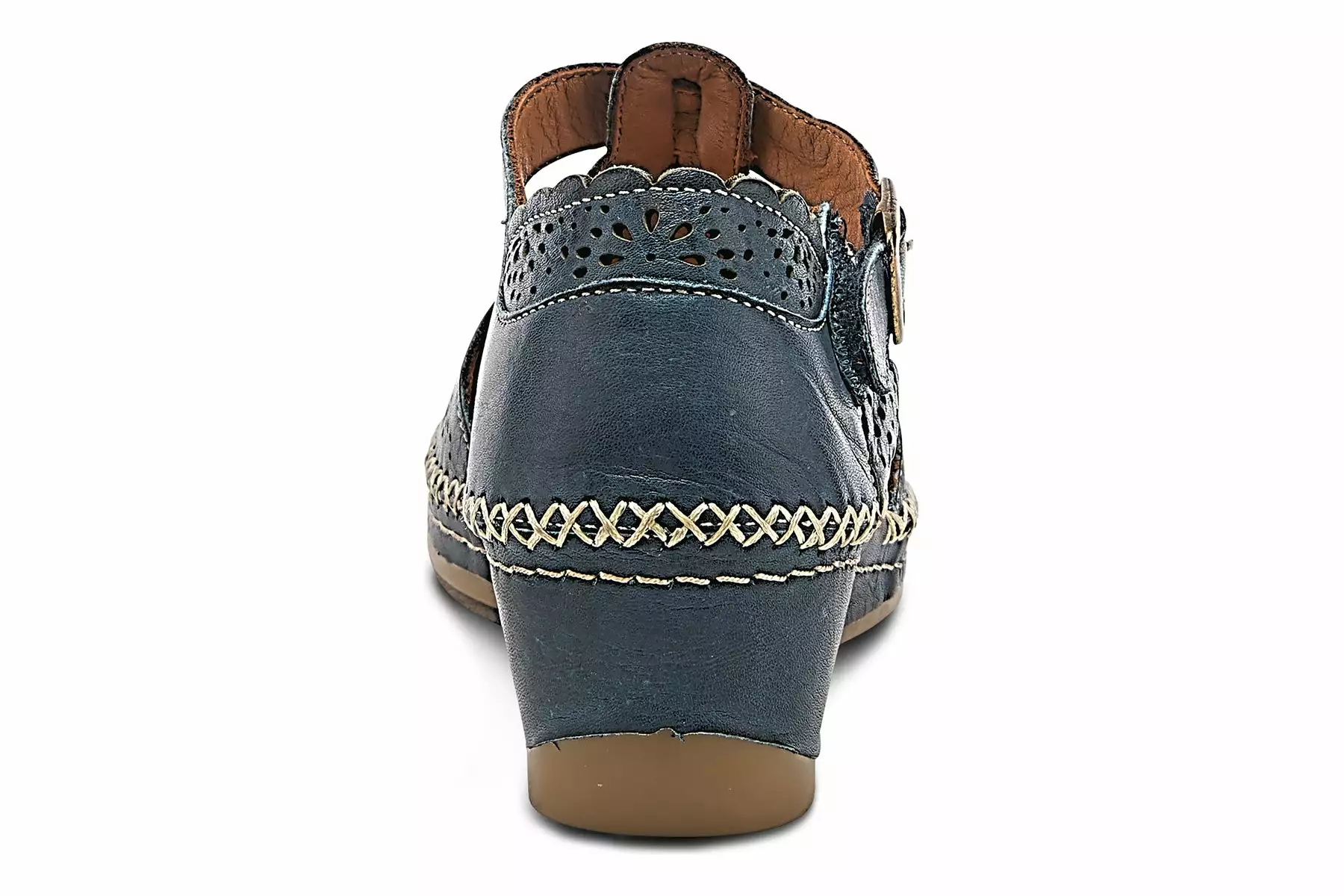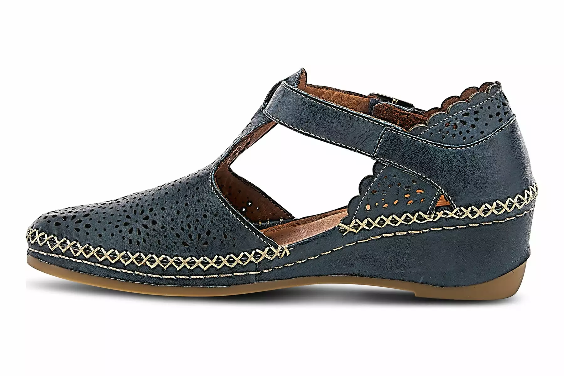 European influenced, premium leather T-strap shoe featuring a laser etching and cutout design, an adjustable hook and loop ankle strap, and artesian whip stitching detail all on a leather-wrapped, comfort wedge with a flexible forefoot.