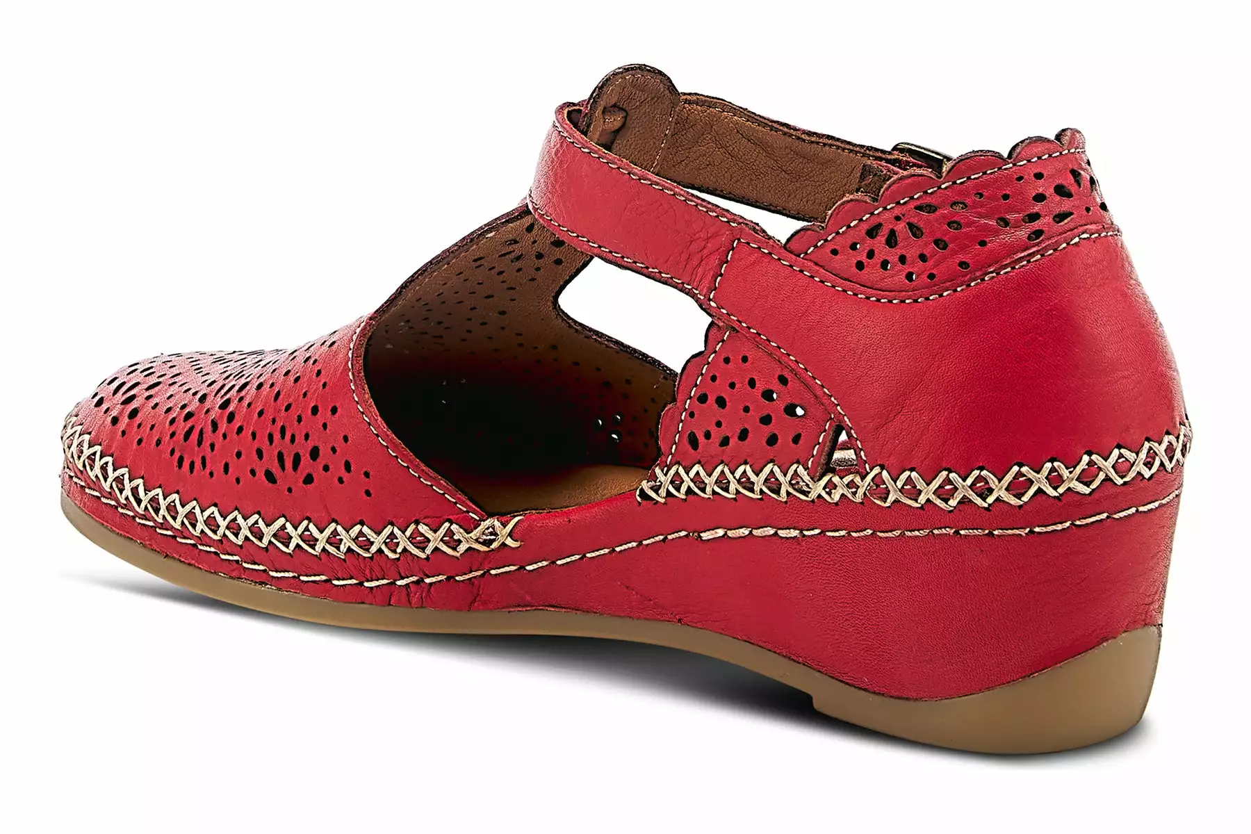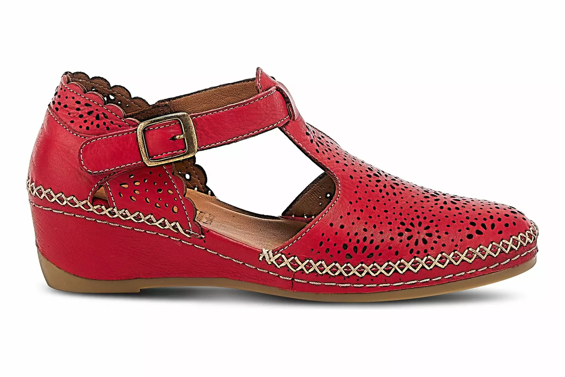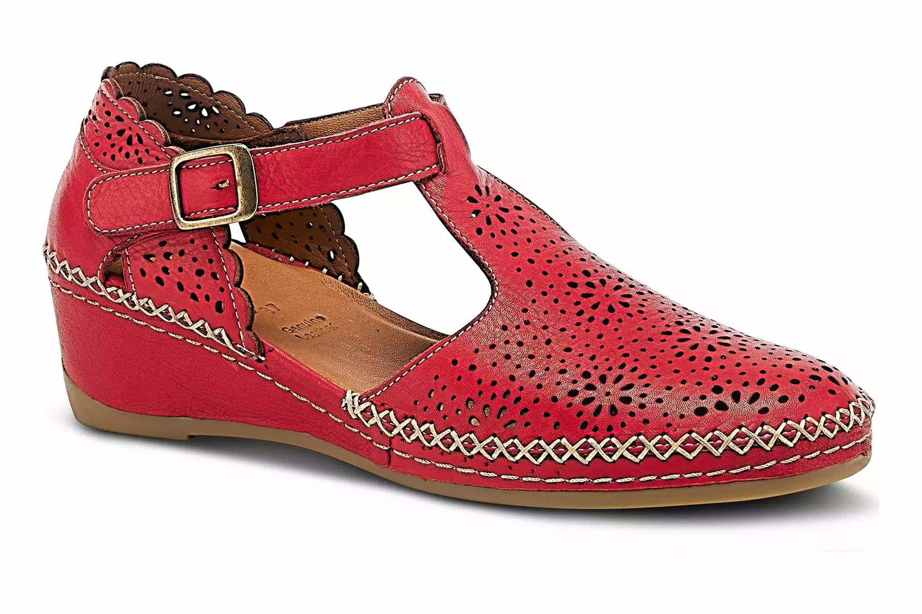European influenced, premium leather T-strap shoe featuring a laser etching and cutout design, an adjustable hook and loop ankle strap, and artesian whip stitching detail all on a leather-wrapped, comfort wedge with a flexible forefoot.