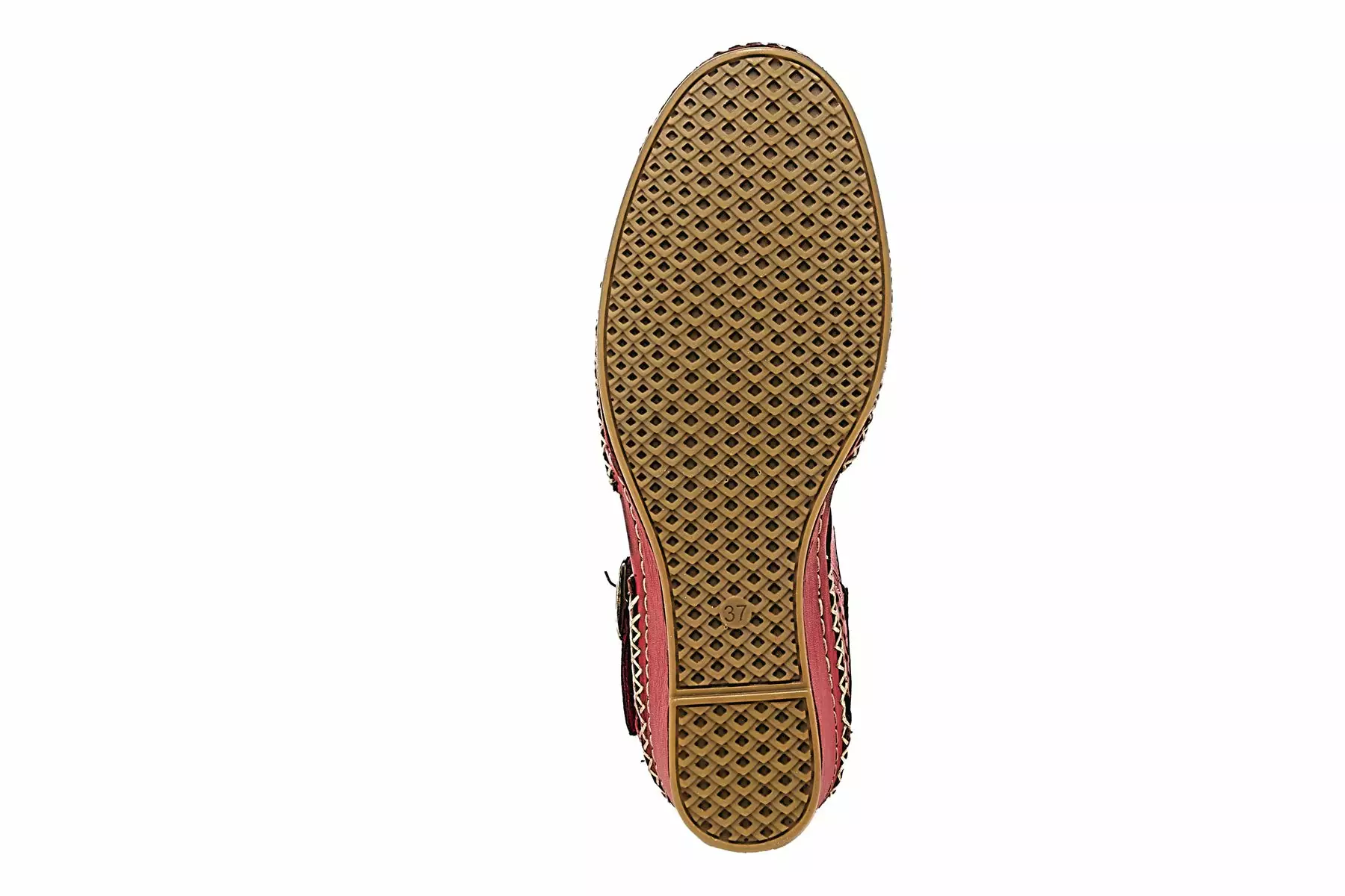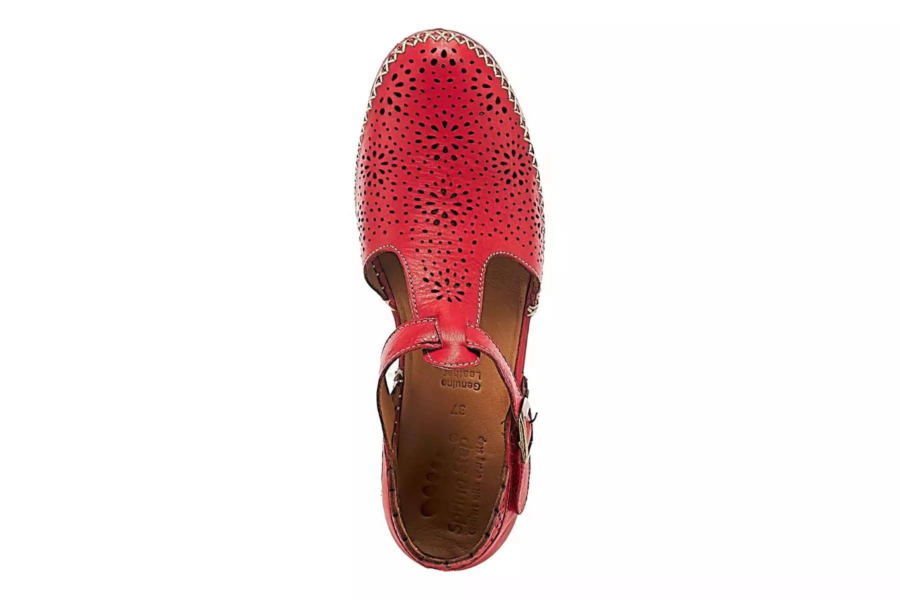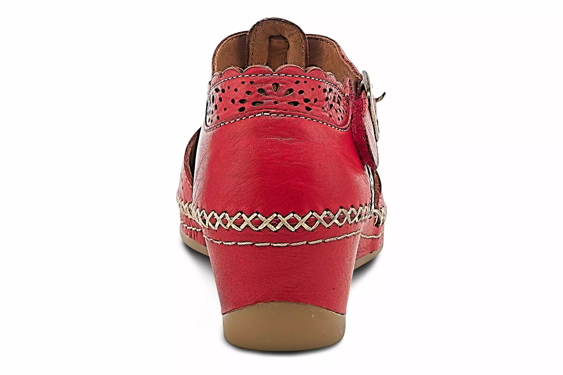European influenced, premium leather T-strap shoe featuring a laser etching and cutout design, an adjustable hook and loop ankle strap, and artesian whip stitching detail all on a leather-wrapped, comfort wedge with a flexible forefoot.