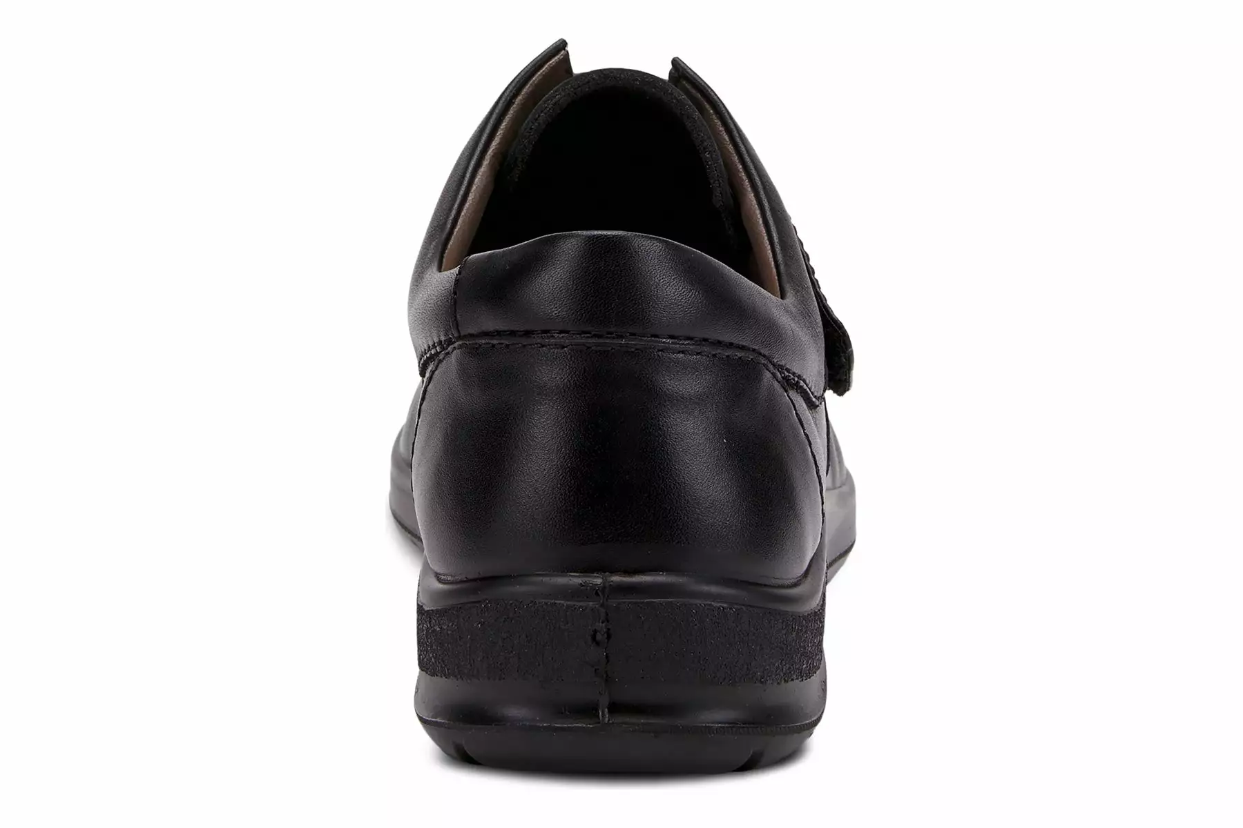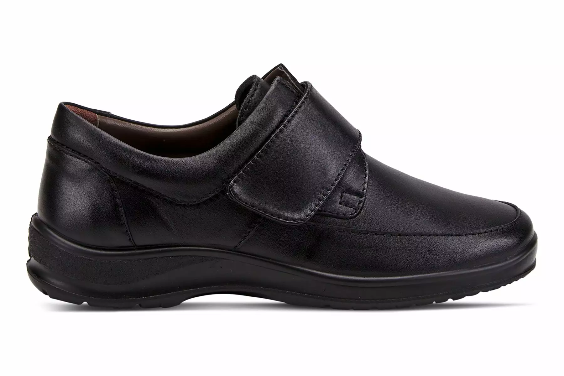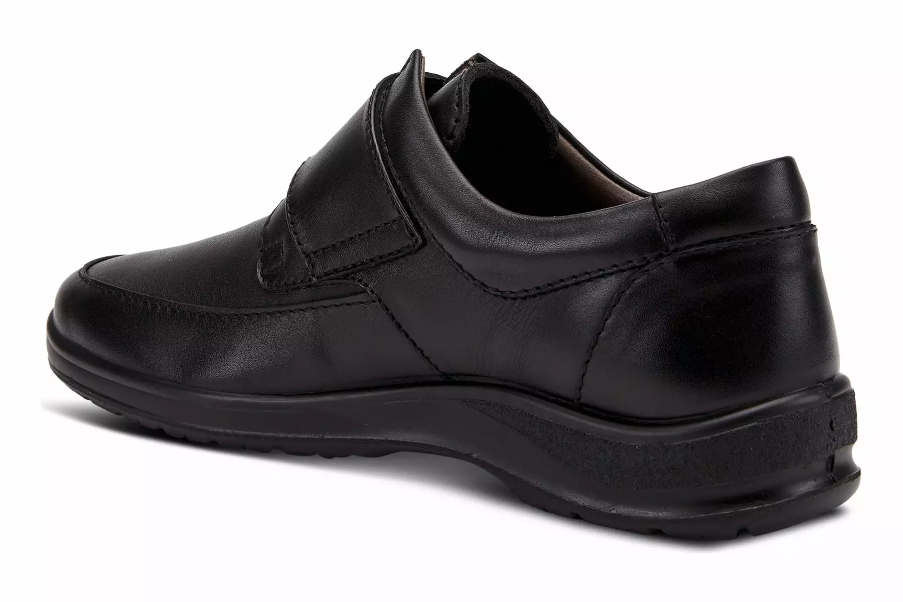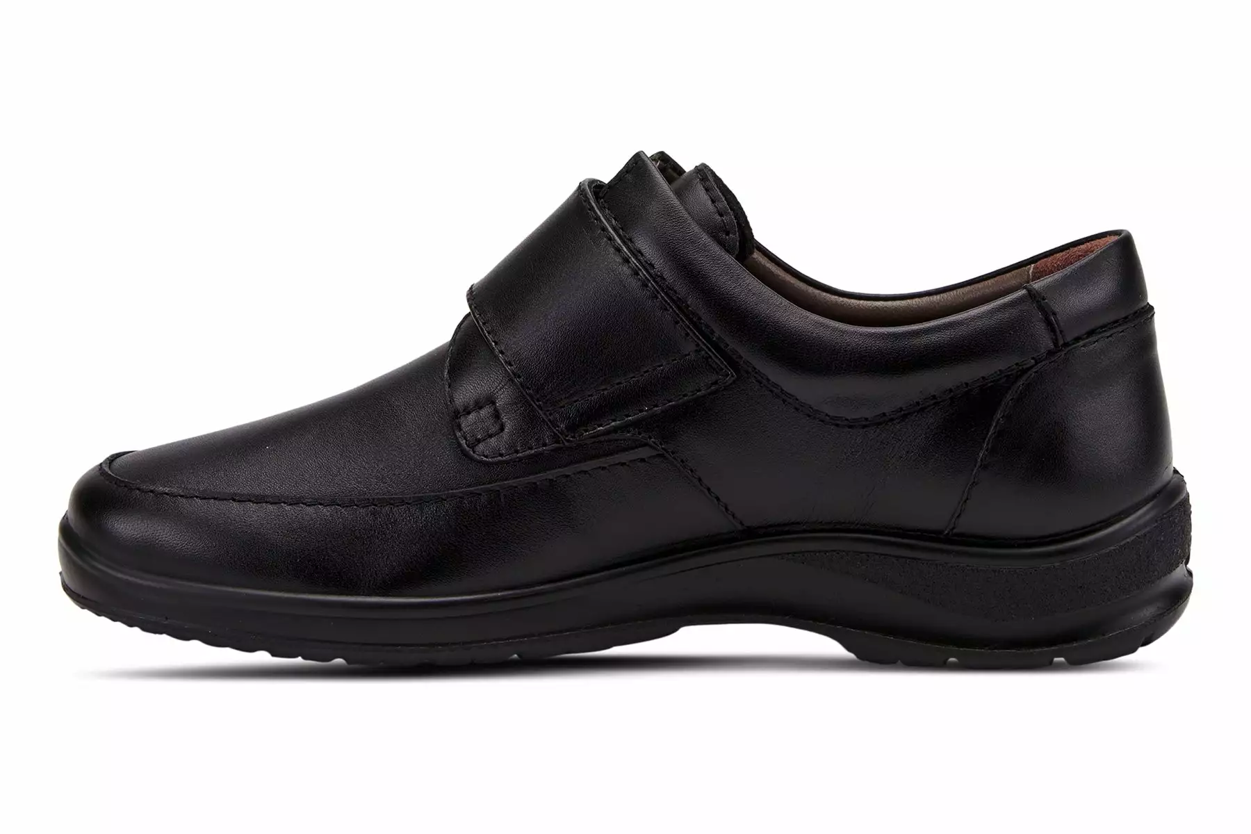 High-quality leather slip-on shoe with a wide adjustable instep strap and padded collar on a flexible, shock-absorbent sole with a removable insole.