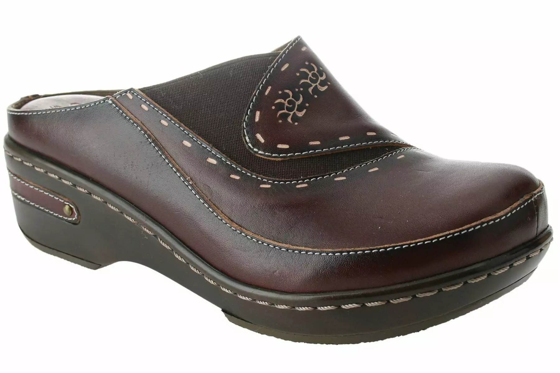 The women’s Spring Step Chino clog is constructed with stitched leather uppers adorned by laser etching along the vamp for added interest. Stretch material on the instep allows for a flexible and more comfortable fit for all day activities.