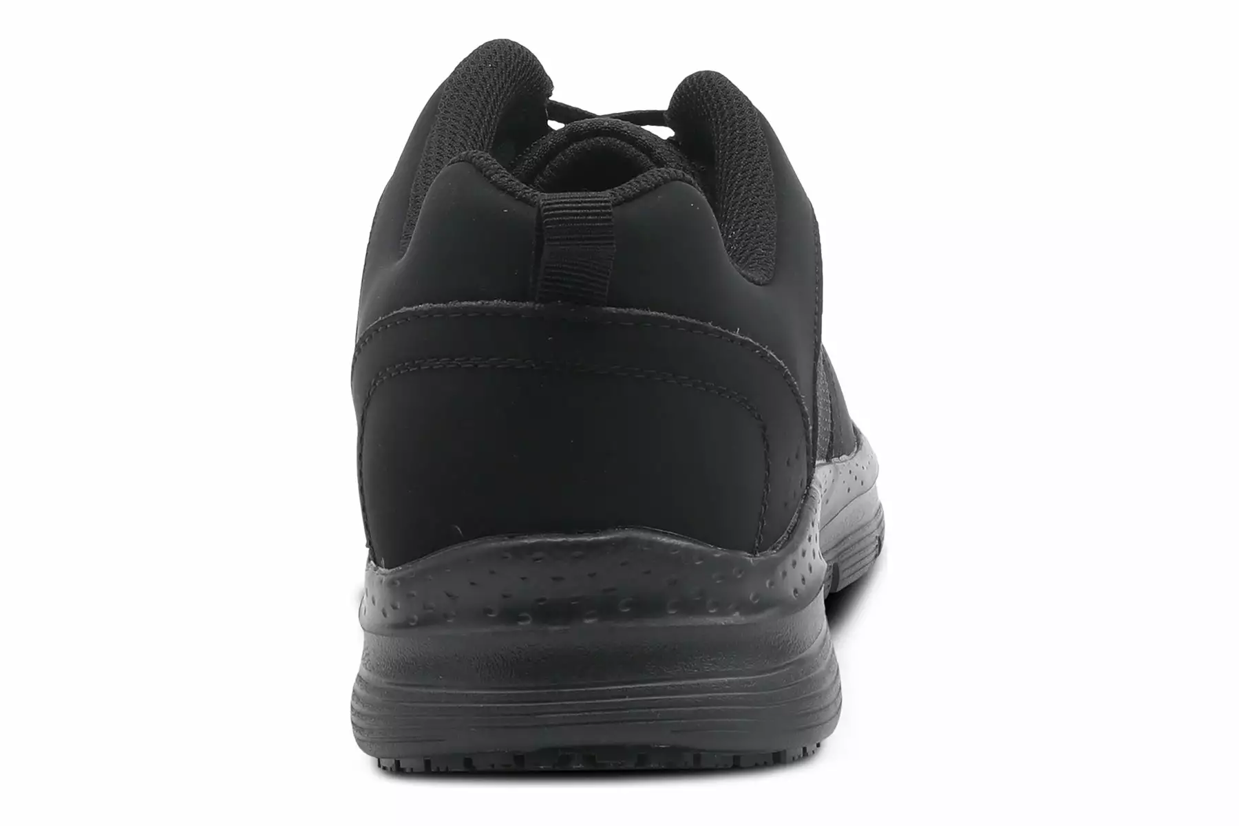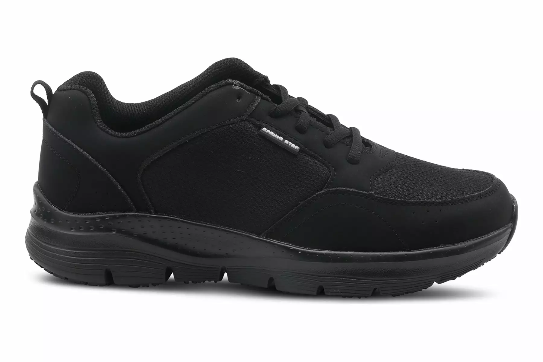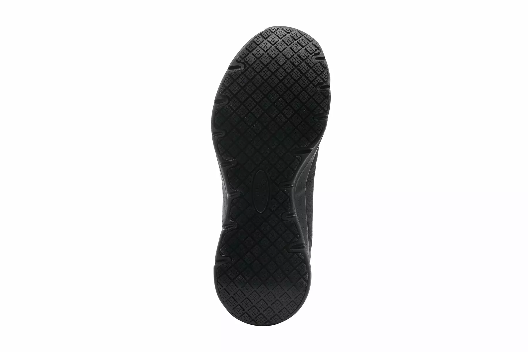 Versatile athletic look work shoe all in one. All over black making this style sleek and stylish. Ultra lightweight with an oil and skid-resistant tread and a back pull loop.