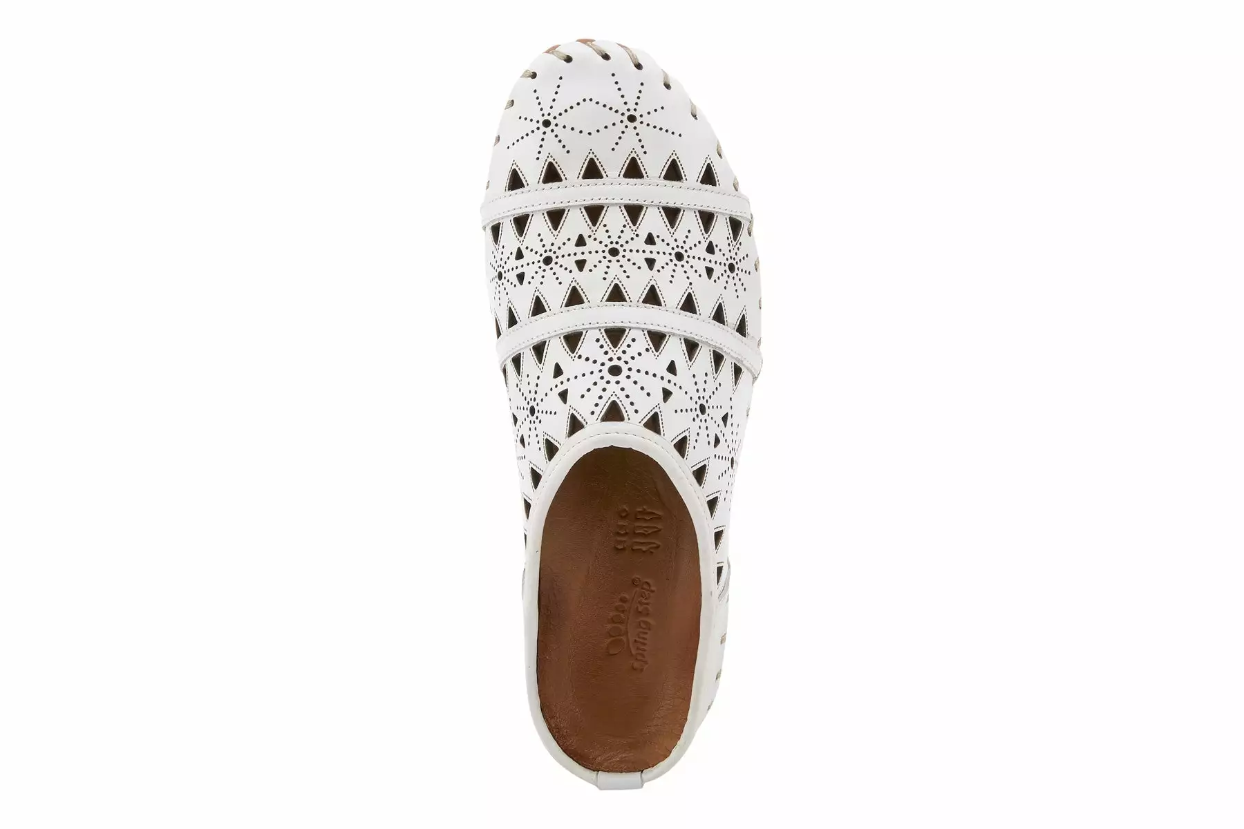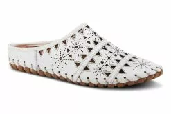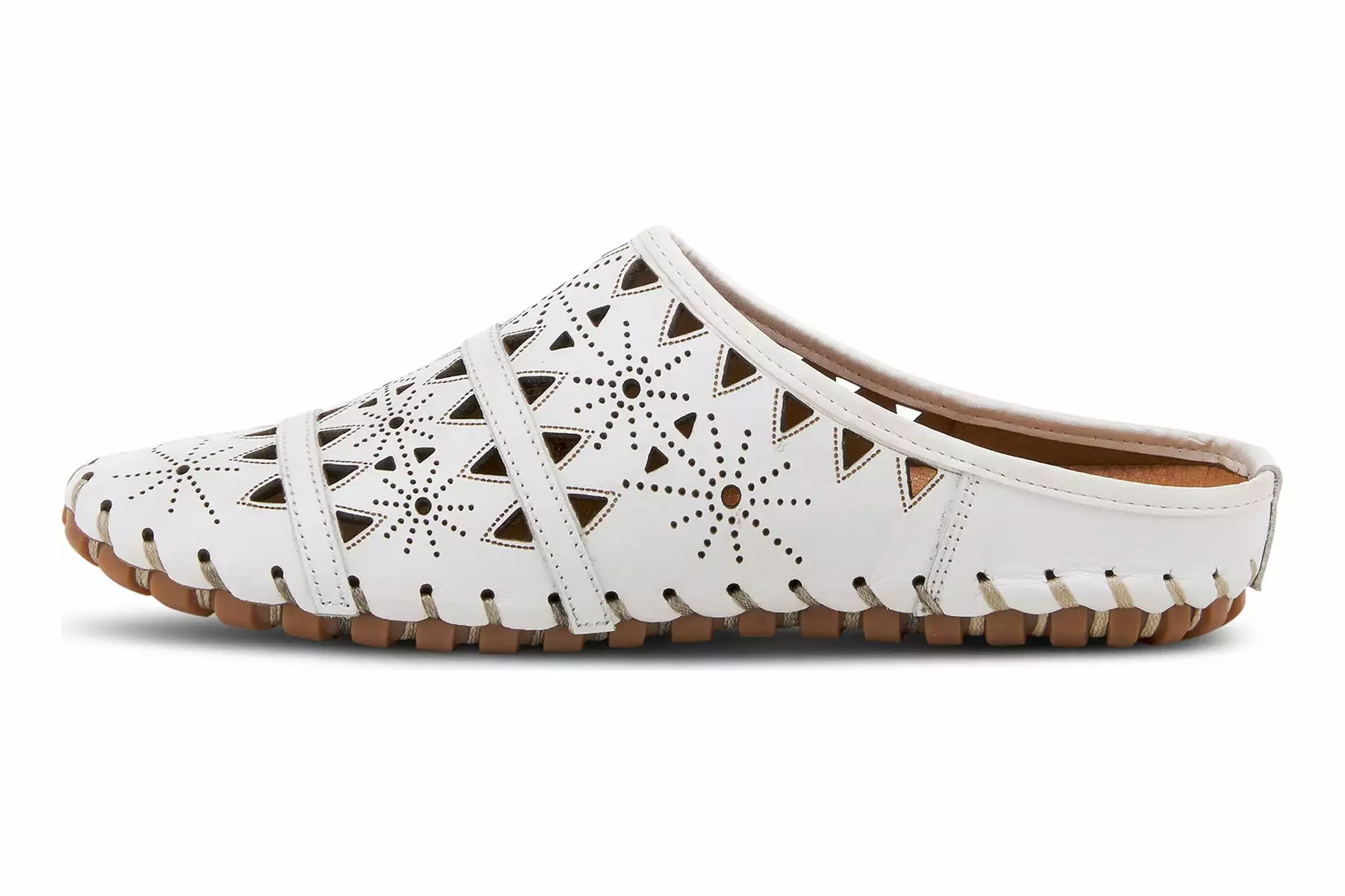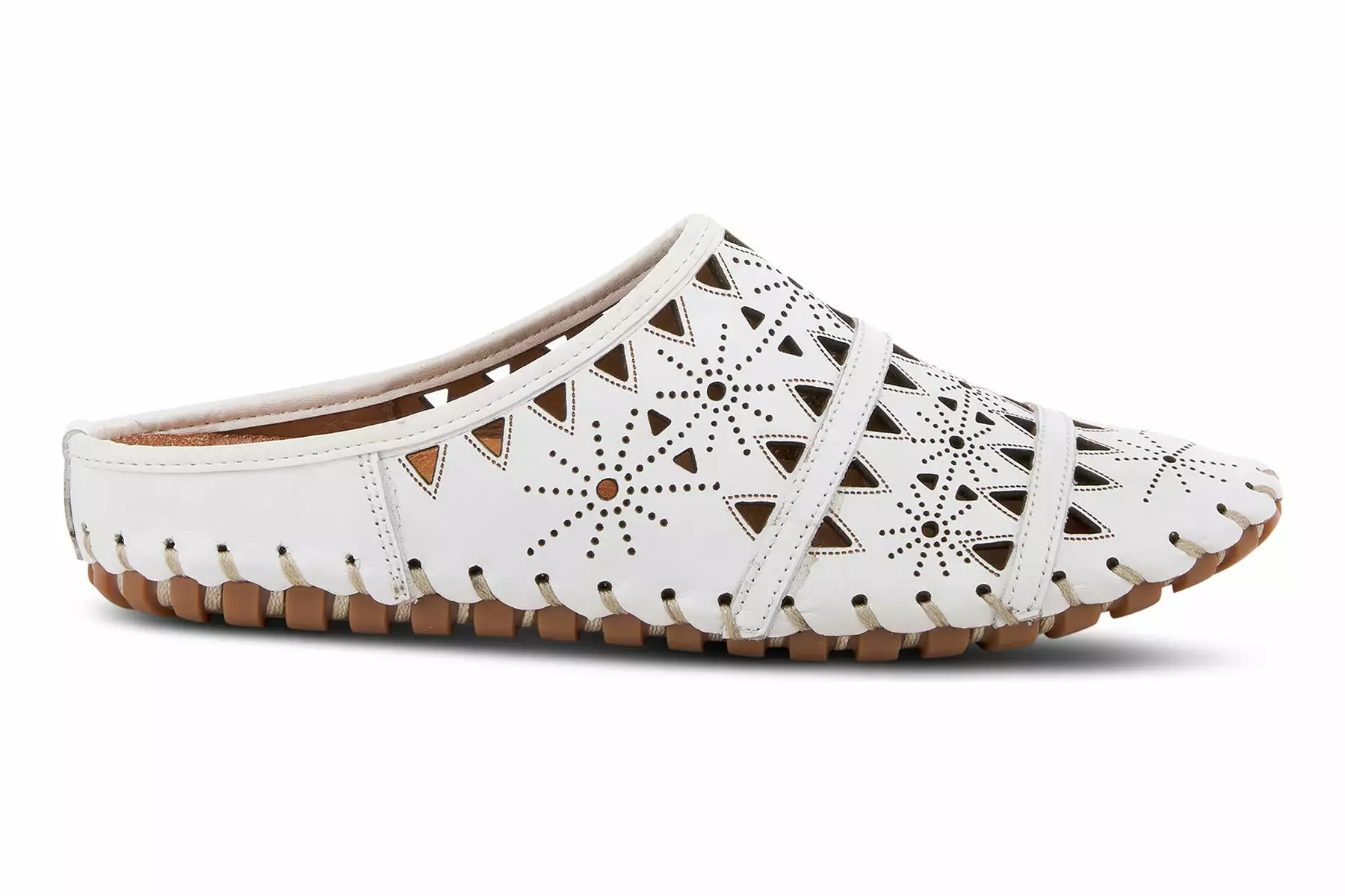 European-influenced, leather open-back slip-on shoe, featuring geometric laser cutouts and etching for a unique modern appeal all on a lightweight, durable, flexible, rubber sole for all-day comfort.