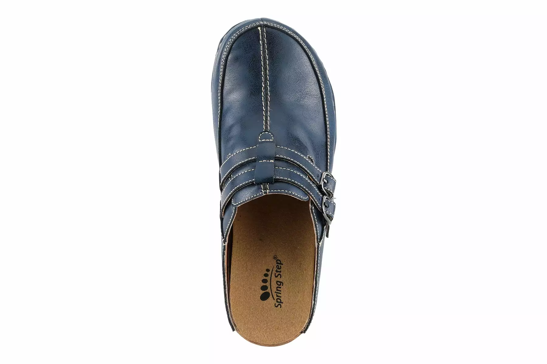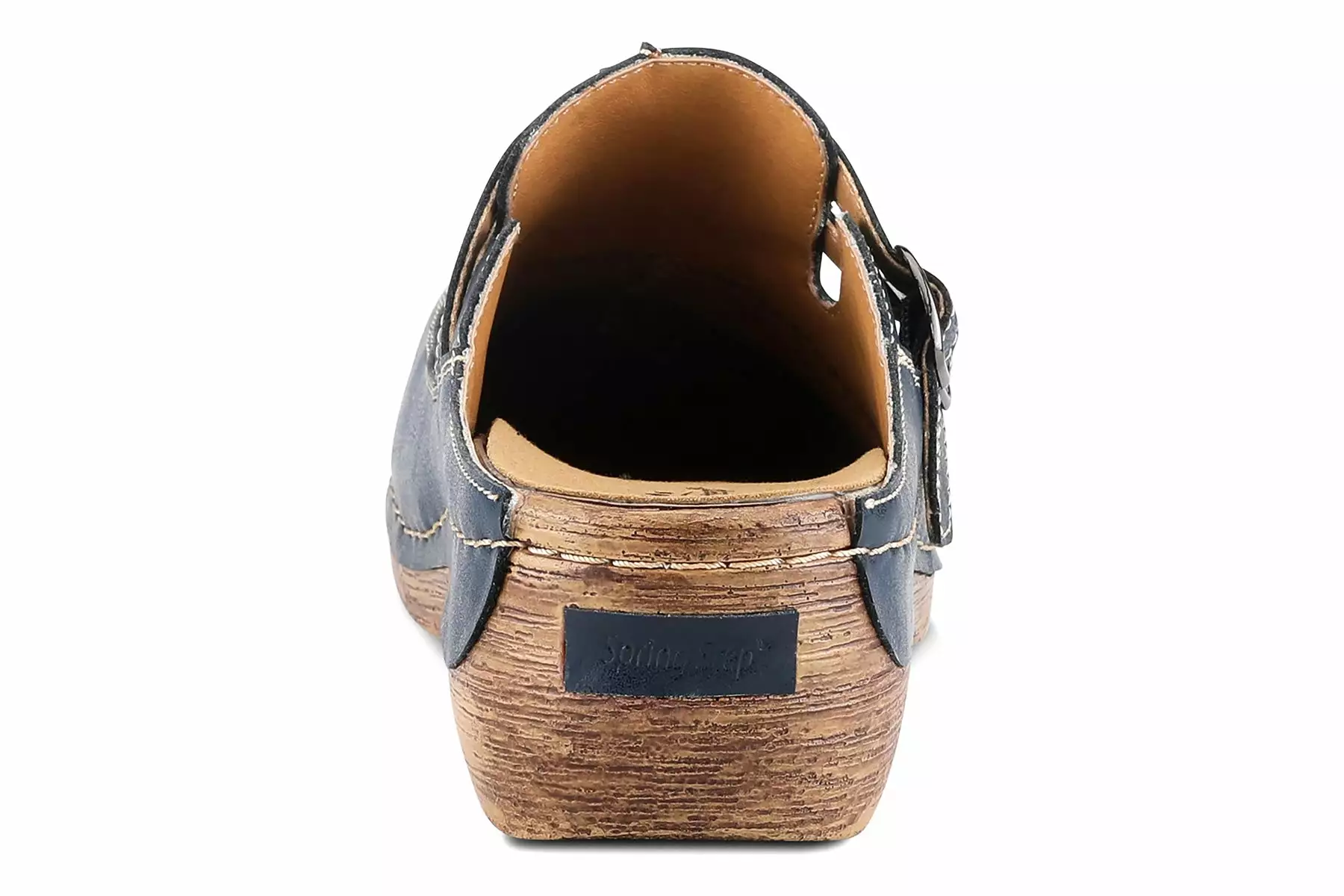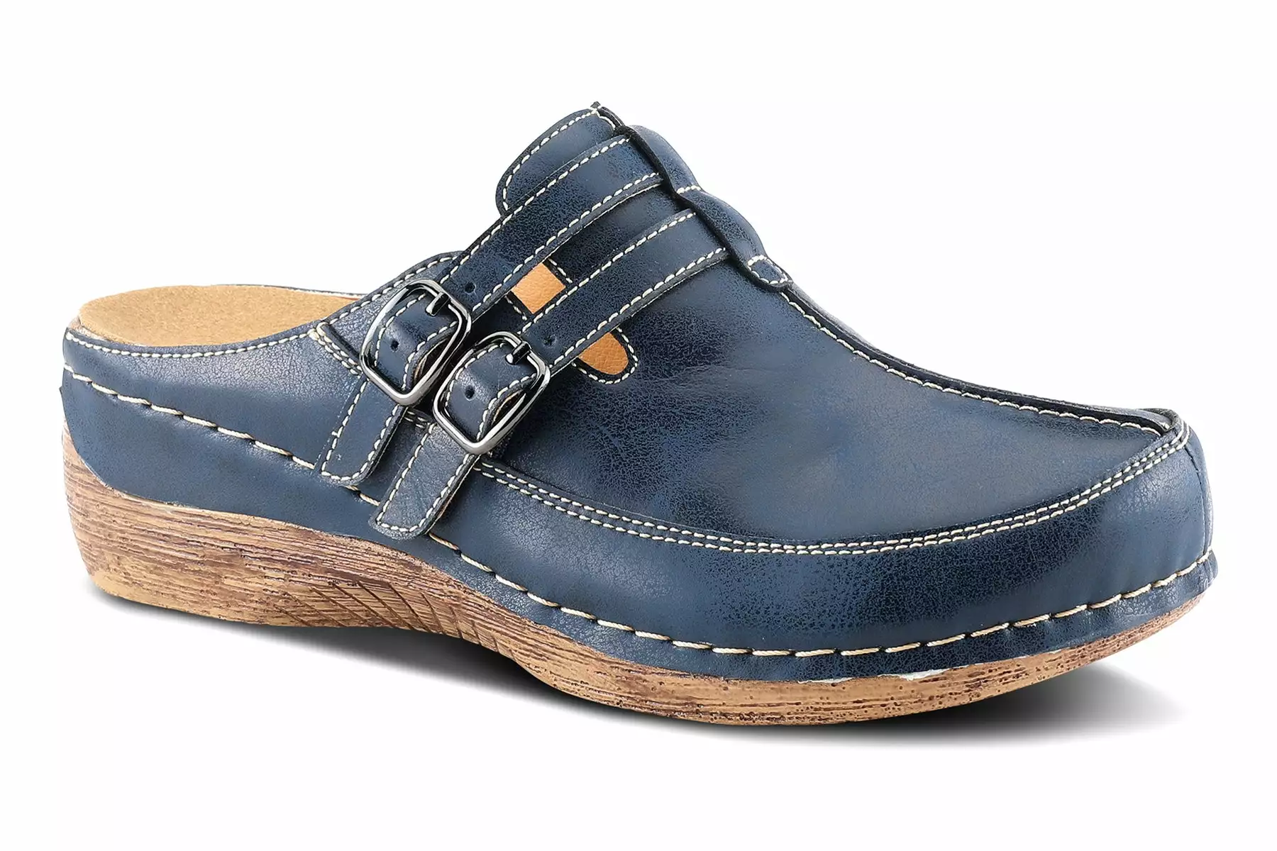 Leather multi-strap slip-on clog styled with antiqued metal buckles and contrast stitch detail.