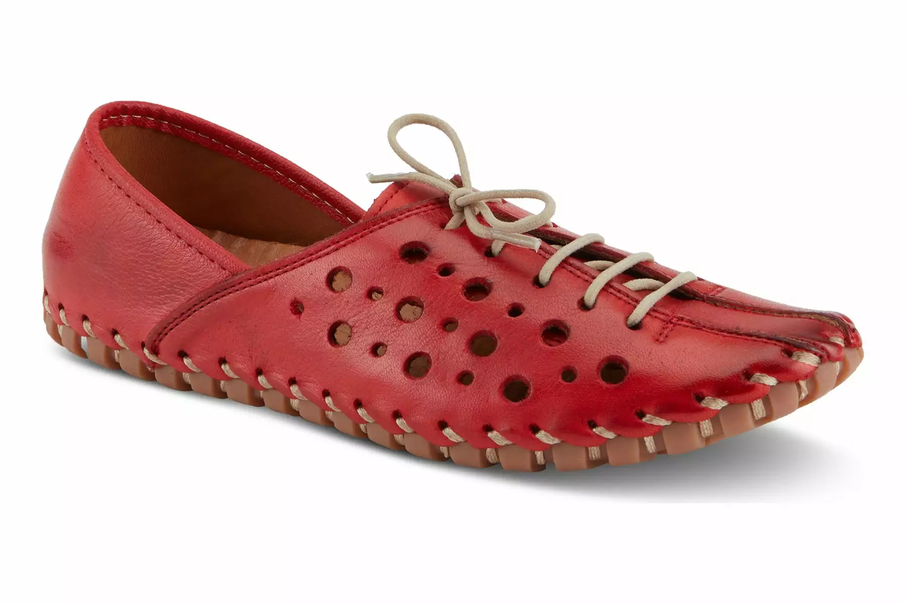 Circular laser cutout on the vamp and exposed contrast stitch trim with elastic laces for a perfect fit. Super lightweight, flexible, rubber outsole on the opanka construction.