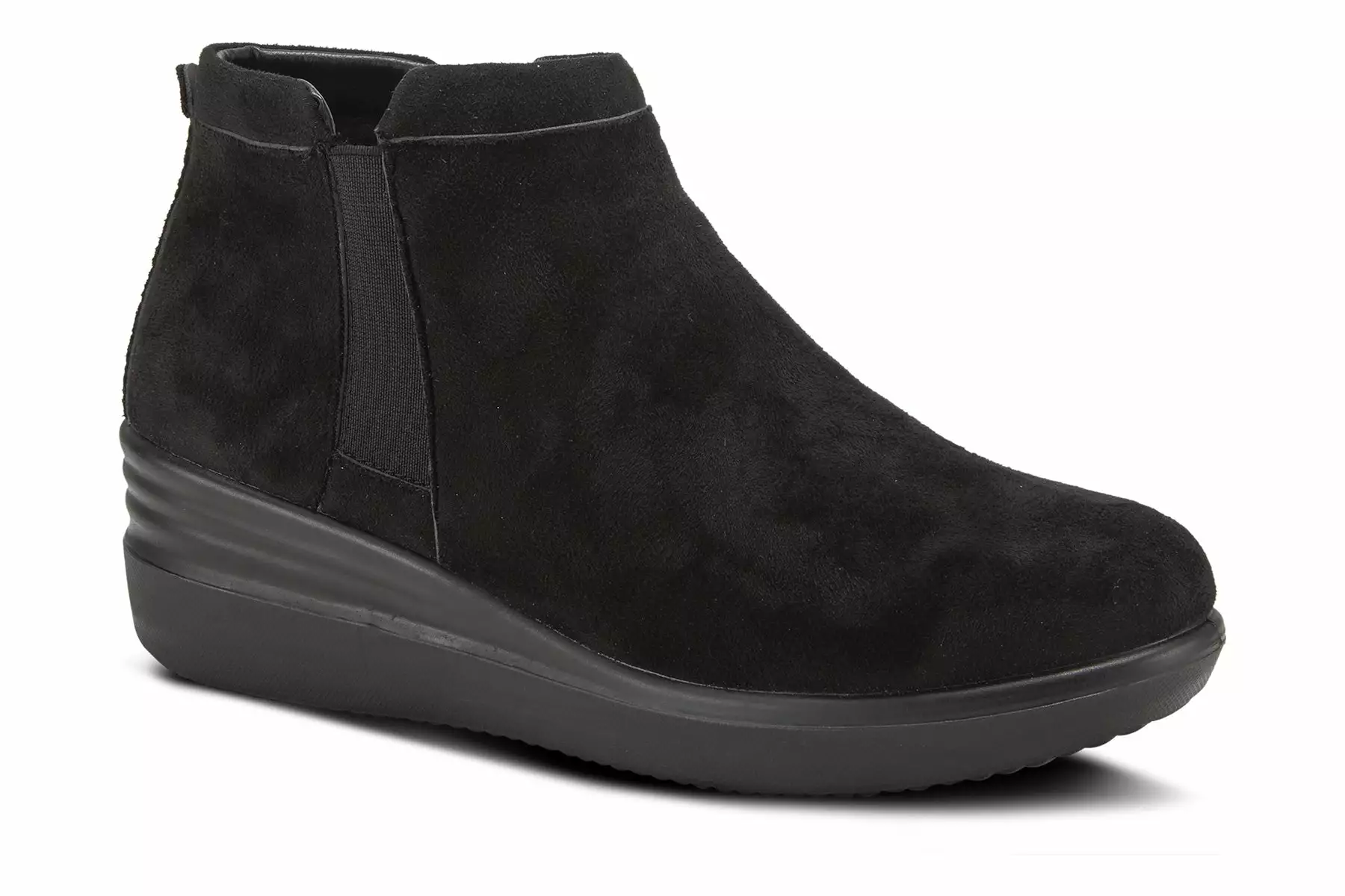 Matrix of comfort in this microsuede wedge bootie featuring deep outside stretch elastic inset and inside zipper for adjustability and easy on/off.