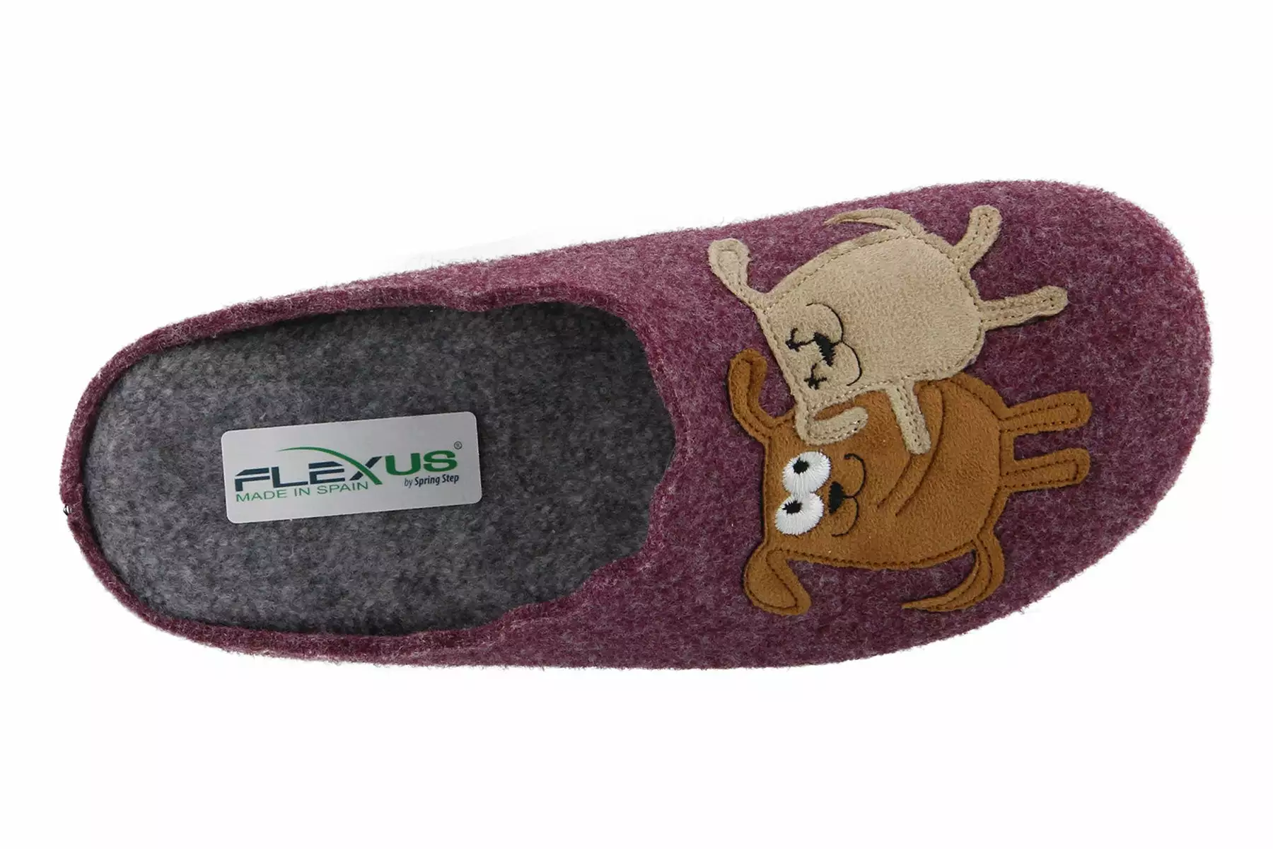 Easy to Slip-on indoor/outdoor wool slipper featuring 2 (two) vibrant embroidered designs ‘hugging dogs’ and ‘hugging cats’ on the vamp.