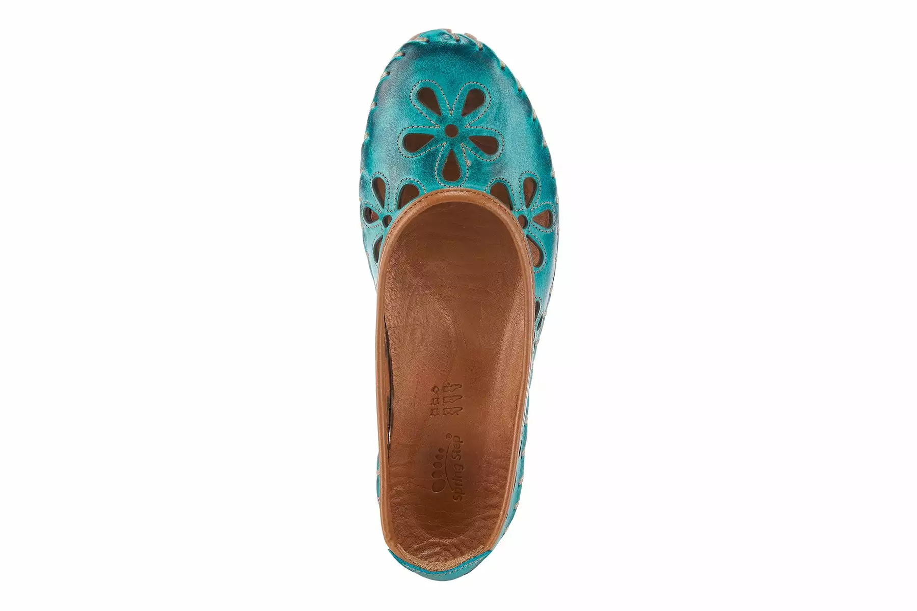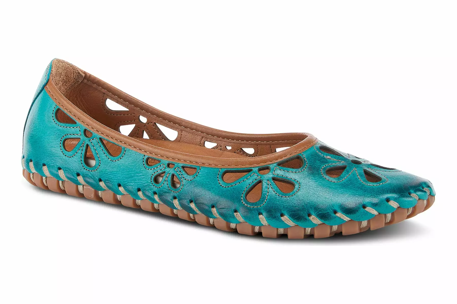 Showstopping leather slip-on ballerina flat is a European-influenced design featuring floral shape laser cutouts and outlining stitch design for a unique modern appeal on an incredibly flexible and comfortable stitch-to-construction sole.