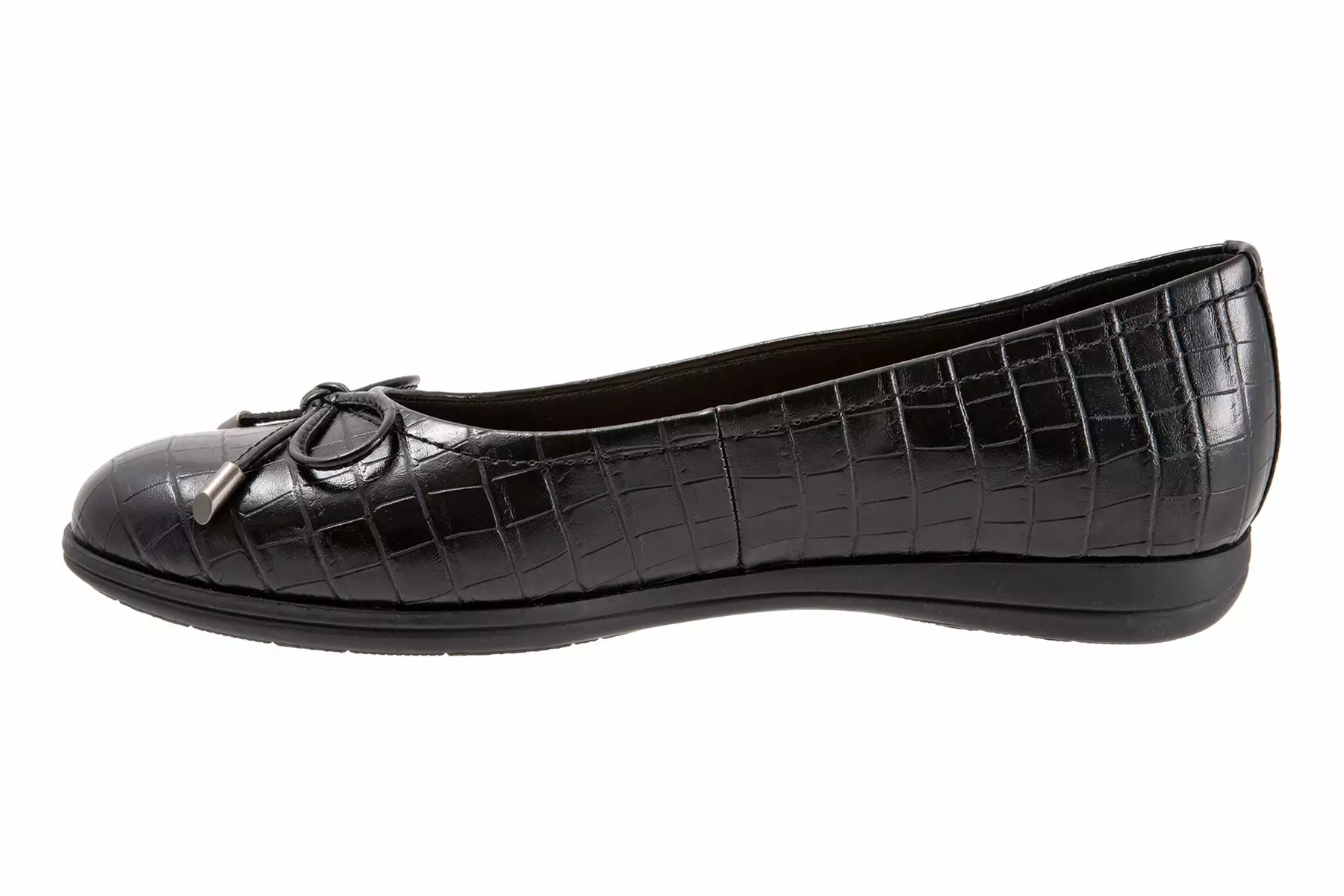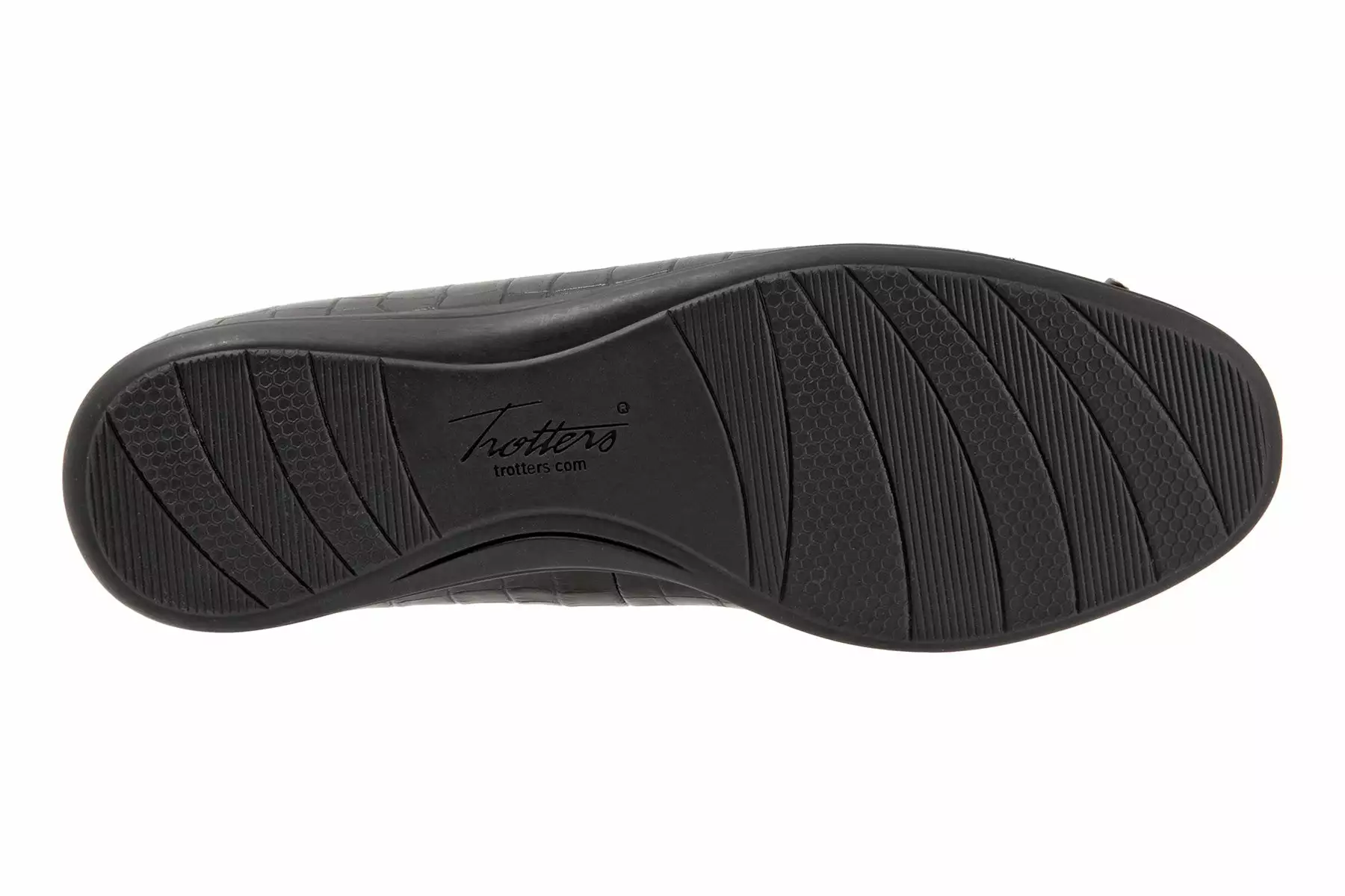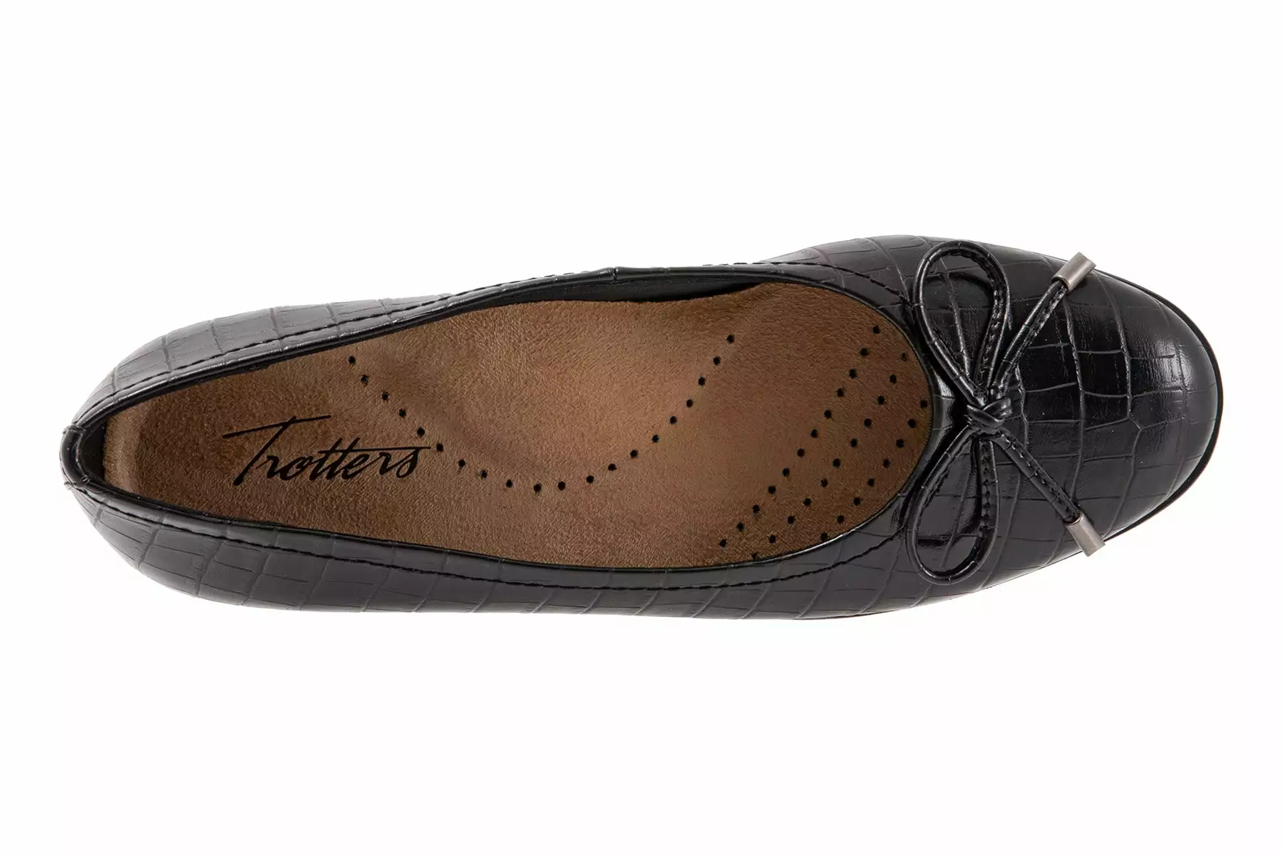 Trotters Dellis is a sleek and comfortable ballet flat. These stylish shoes have leather and man made uppers, removable cushioned footbed and rubber outsole. A soft microfiber lining, padded insole and a fixed bow at the vamp completes these chic flats.