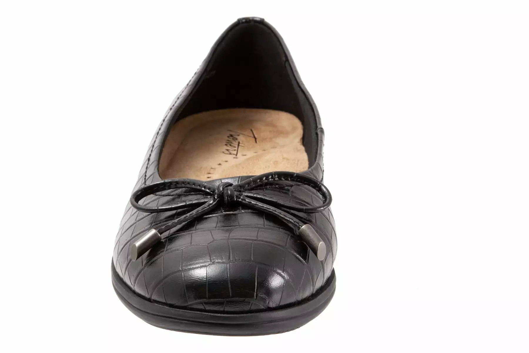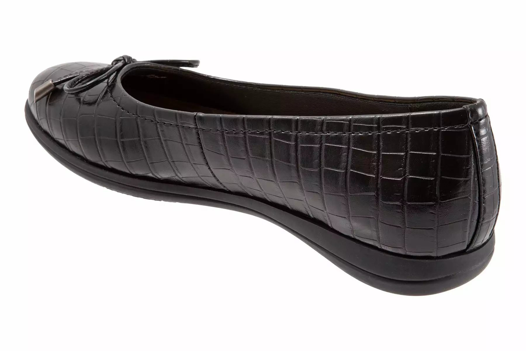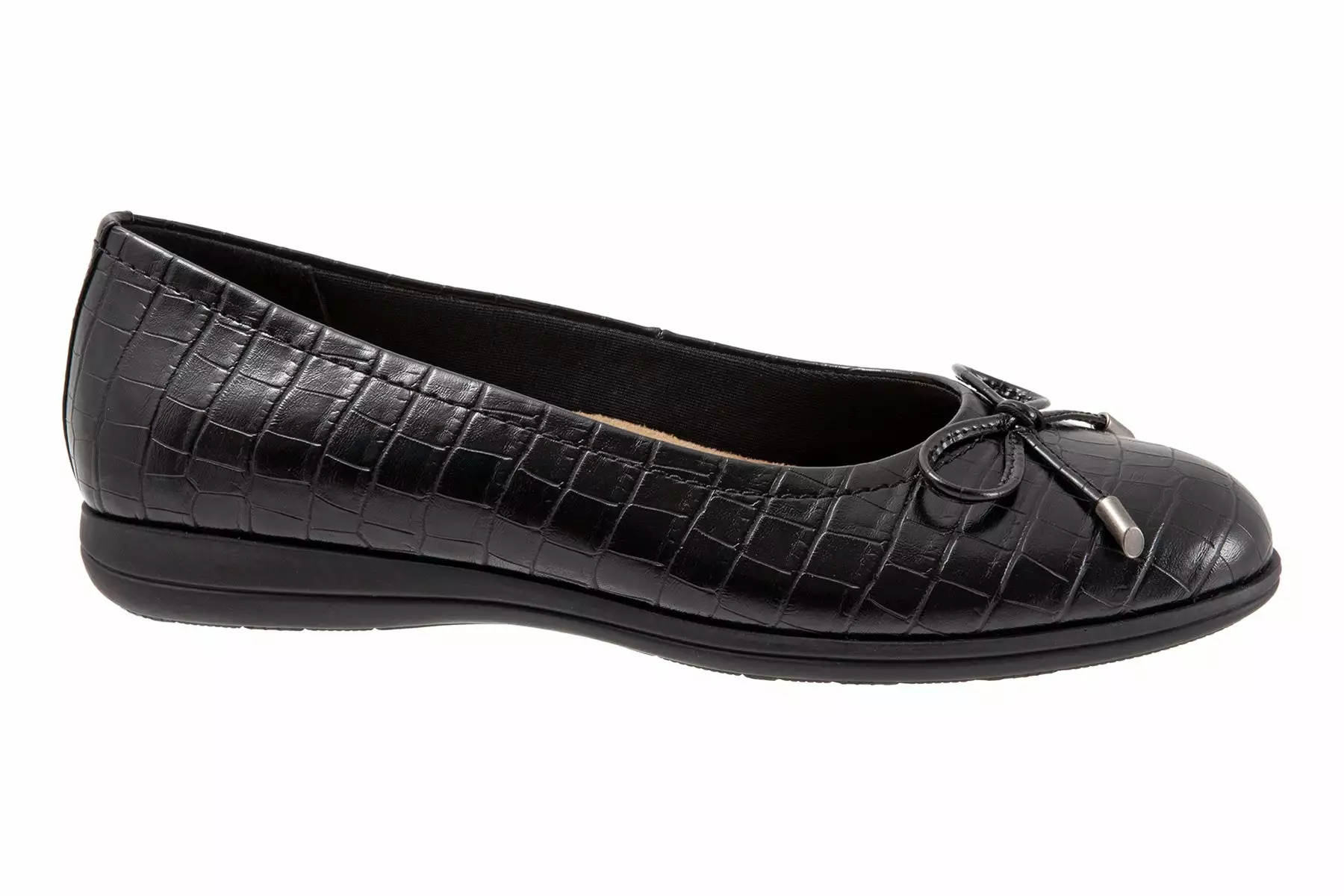 Trotters Dellis is a sleek and comfortable ballet flat. These stylish shoes have leather and man made uppers, removable cushioned footbed and rubber outsole. A soft microfiber lining, padded insole and a fixed bow at the vamp completes these chic flats.