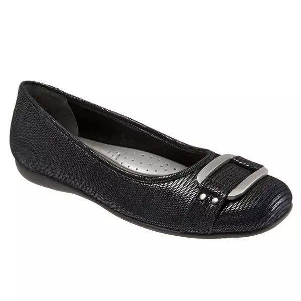 A classic silhouette with total comfort in the women’s Trotters Sizzle Signature ballet flat make it a wardrobe staple. The ballerina features a rich leather upper embellished with metal hardware for added interest. The cushioned footbed contours the foot to deliver unparalleled comfort in every step, while the durable rubber outsole provides traction for all day wear.