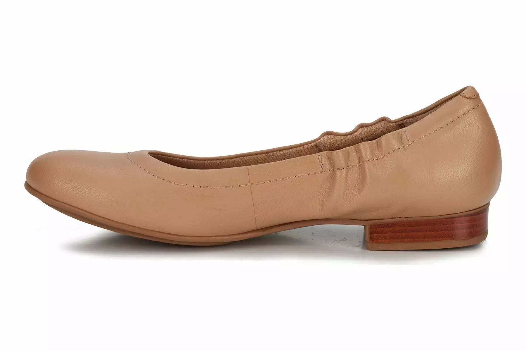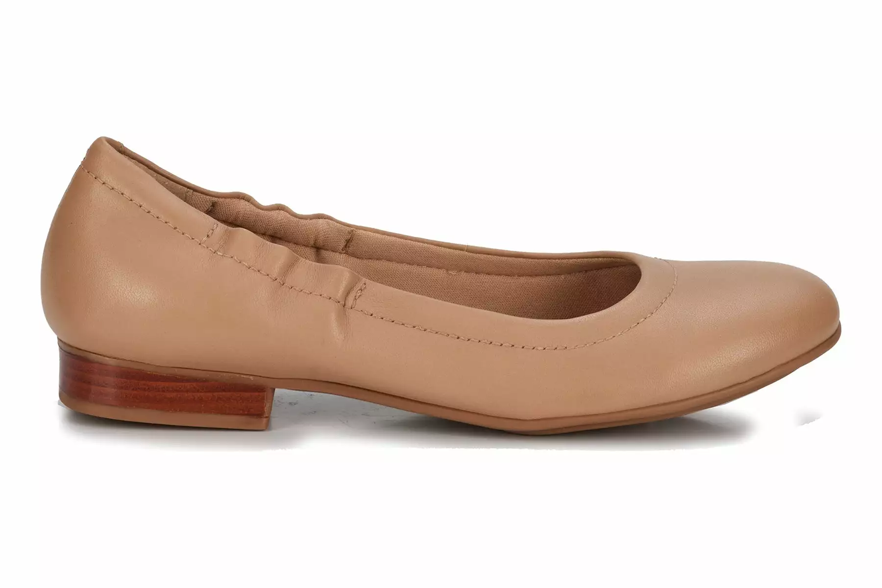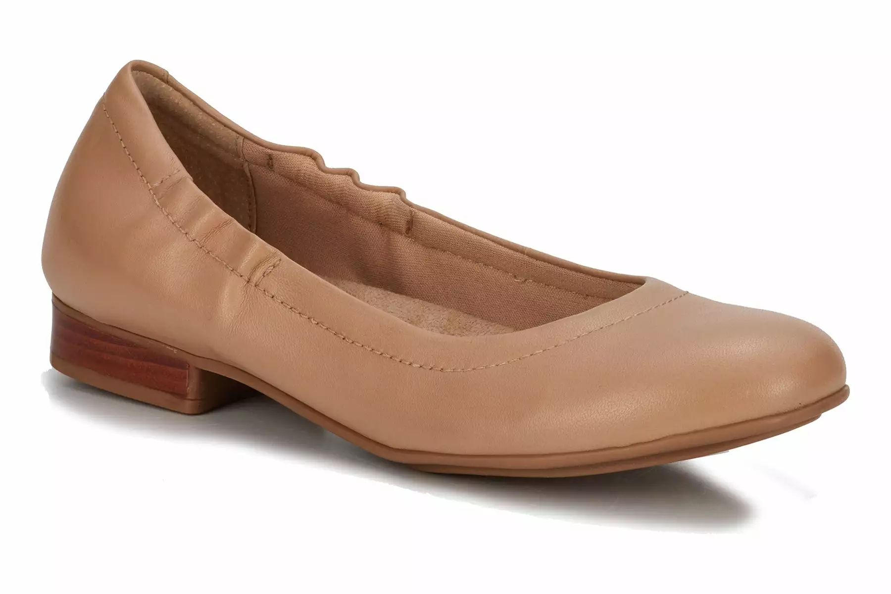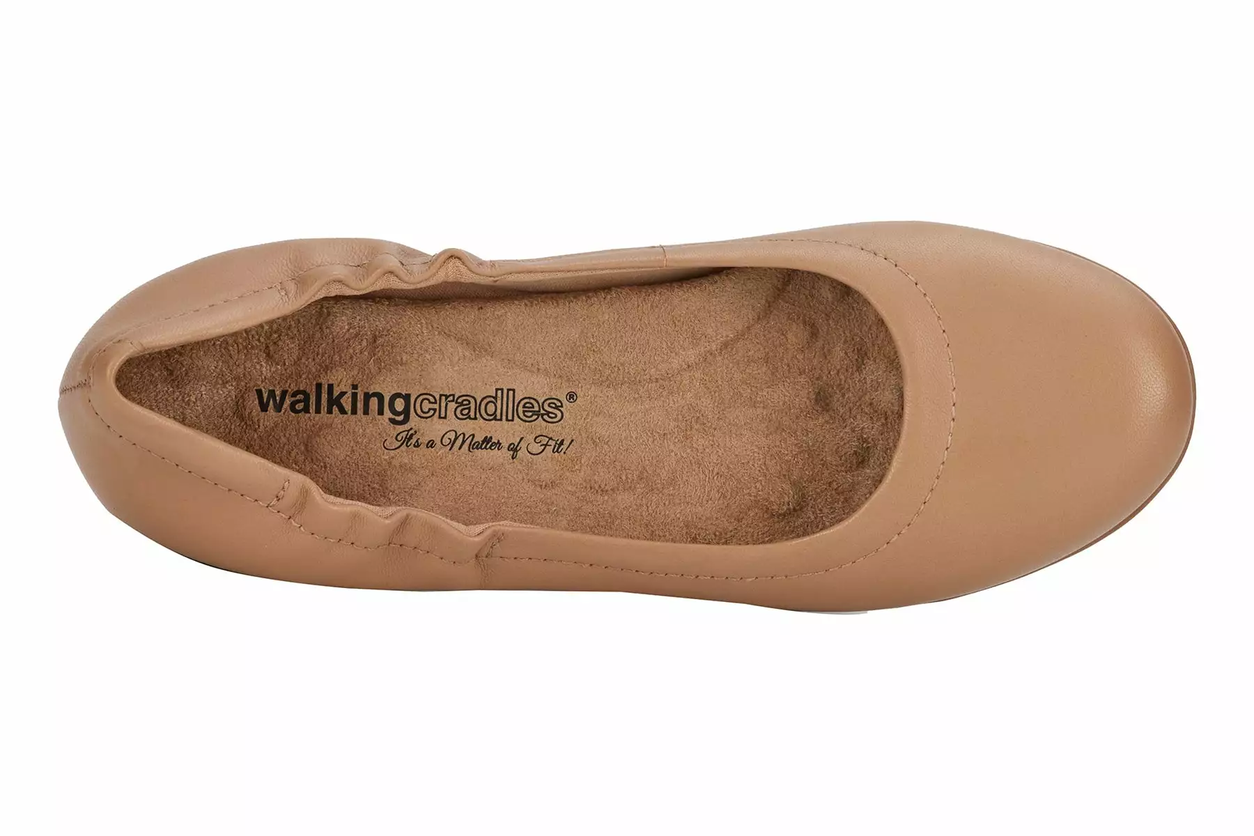 Walking Cradles Tess is a cushioned and roomy dress flat. These shoes have a soft leather upper, elasticized topline and removable dual-density foam insole. A roomy toe box, stacked block heel and slip on style creates a well-rounded and comfortable dress shoe.